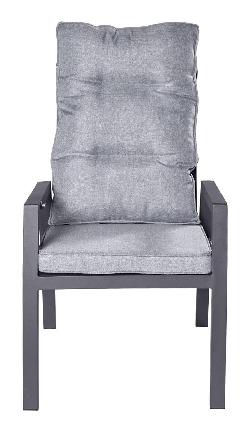 Der Gartensessel BONDINO der Marke Home4You besteht aus Aluminium und ist in Anthrazit gehalten. Er ist mit Rücken- und Sitzkissen ausgestattet, deren Bezüge aus Polyester in Grau gefertigt sind. Das Rückenkissen ist mit Gurtbändern versehen. Die Rückenlehne lässt sich per Knopfdruck verstellen. Der Sessel ist bis maximal 120 kg belastbar. Die Maße betragen 59 cm in der Breite, 109 cm in der Höhe und 66 cm in der Tiefe.