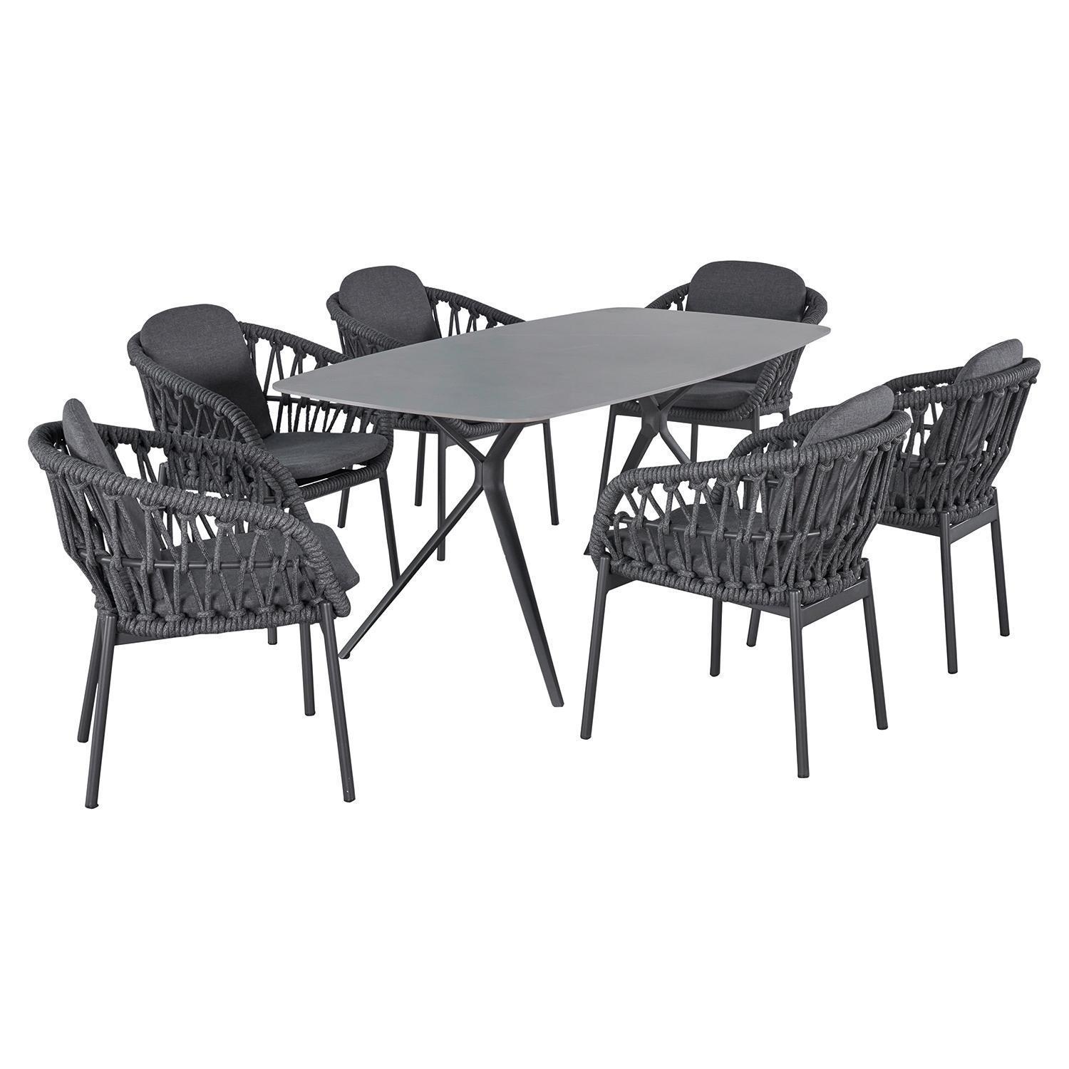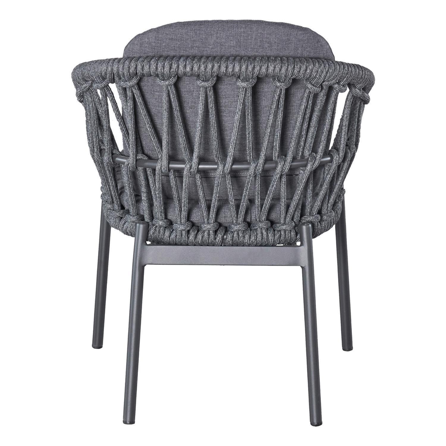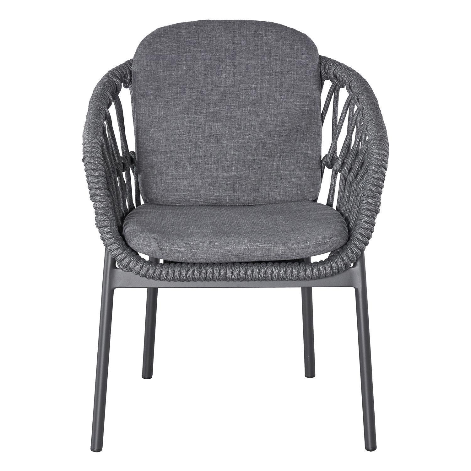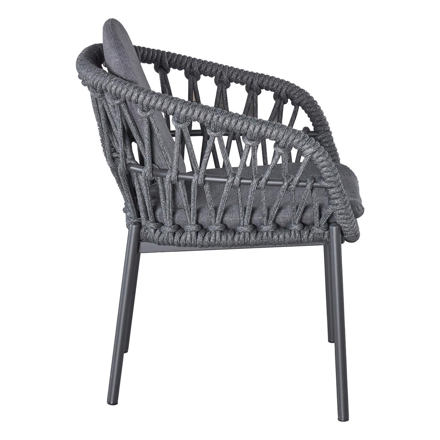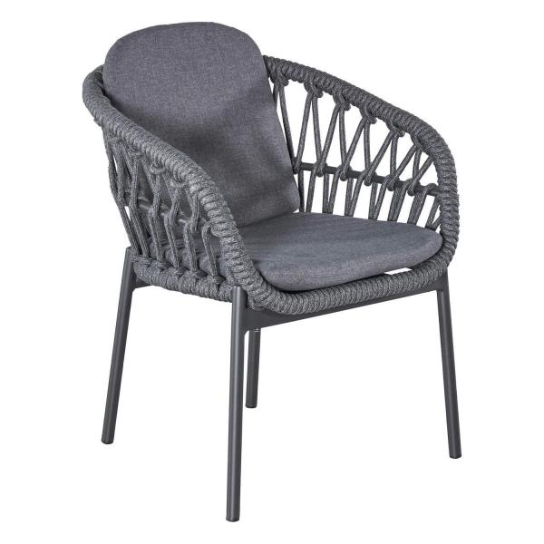 Der Gartenstuhl BARI der Marke Outdoor verfügt über ein Aluminiumgestell in Anthrazit. Die Sitz- und Rückenkissen sind mit Olefinbezügen in Dunkelgrau ausgestattet. Die Rücken- und Seitenbespannung besteht aus Seilen in Dunkelgrau. Der Stuhl ist bis maximal 110 kg belastbar. Die Maße betragen 63 cm in der Breite, 79 cm in der Höhe und 62 cm in der Tiefe.