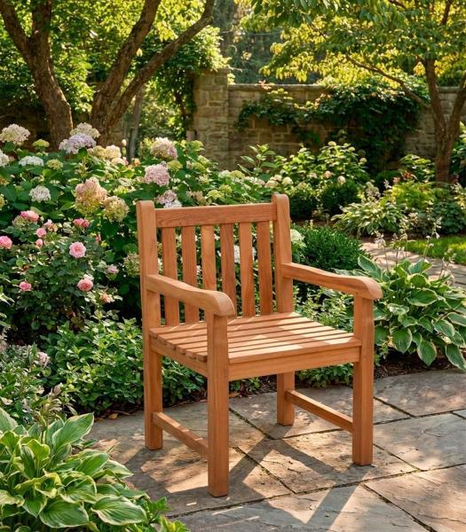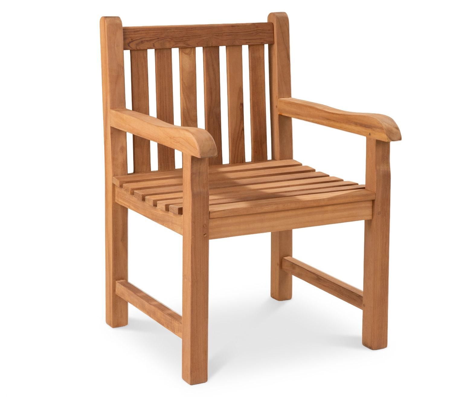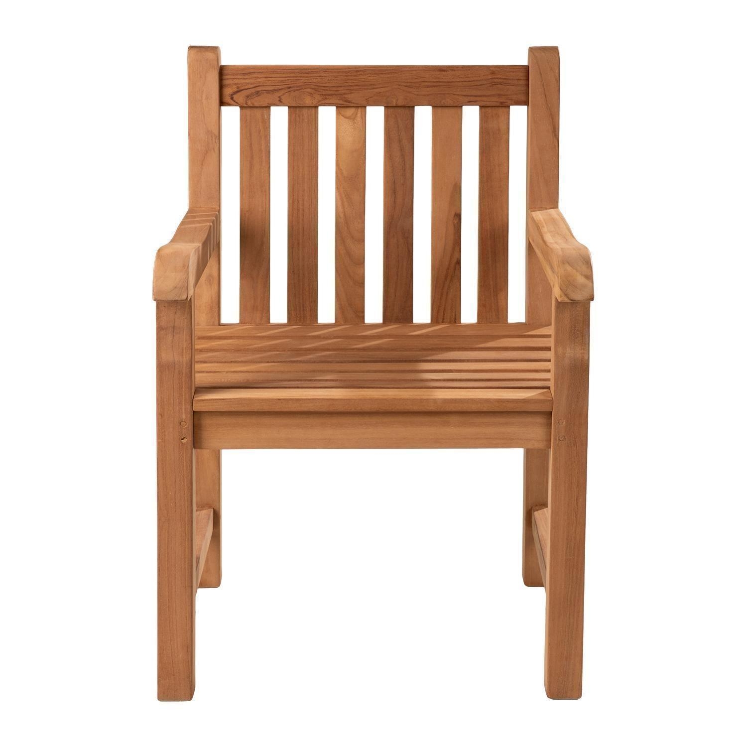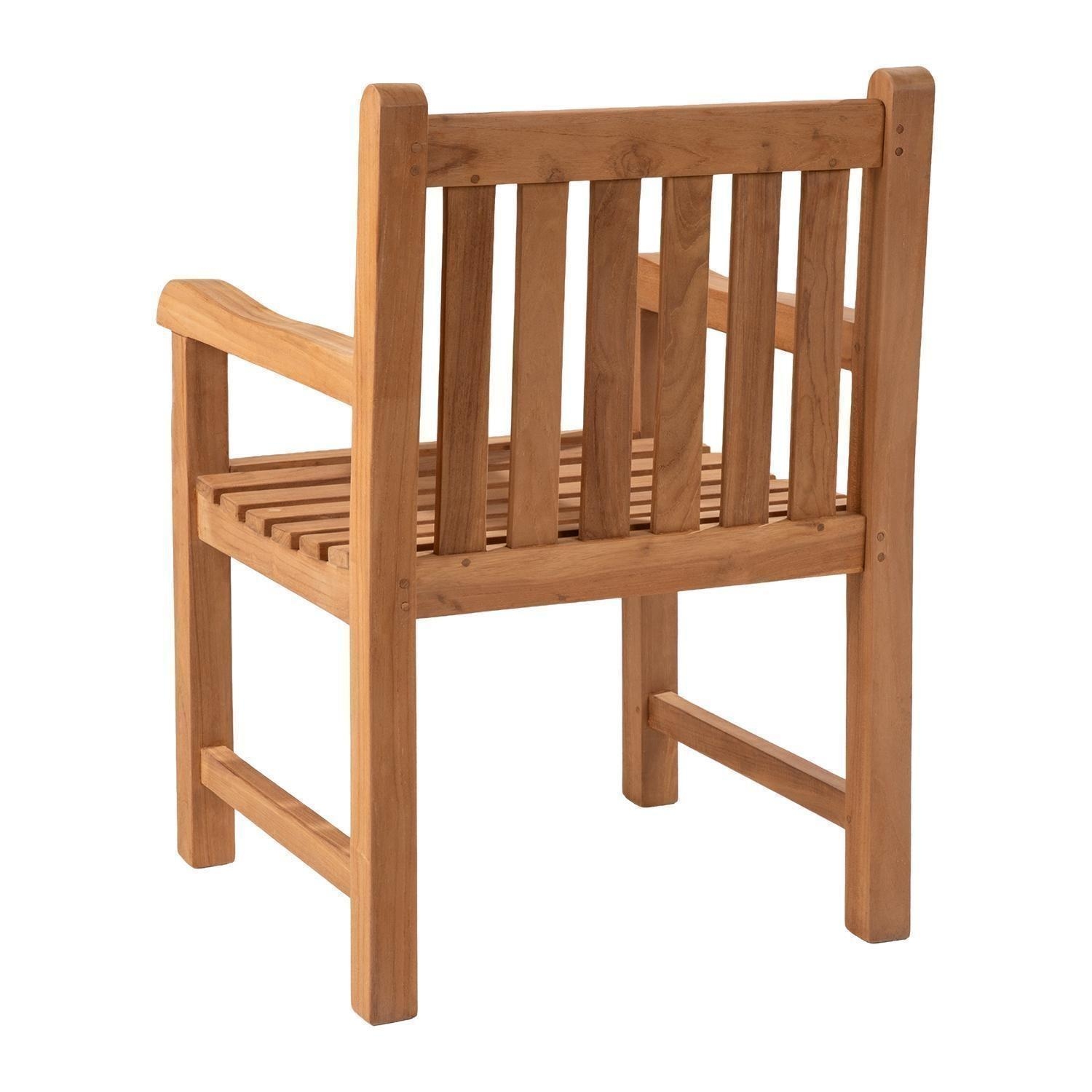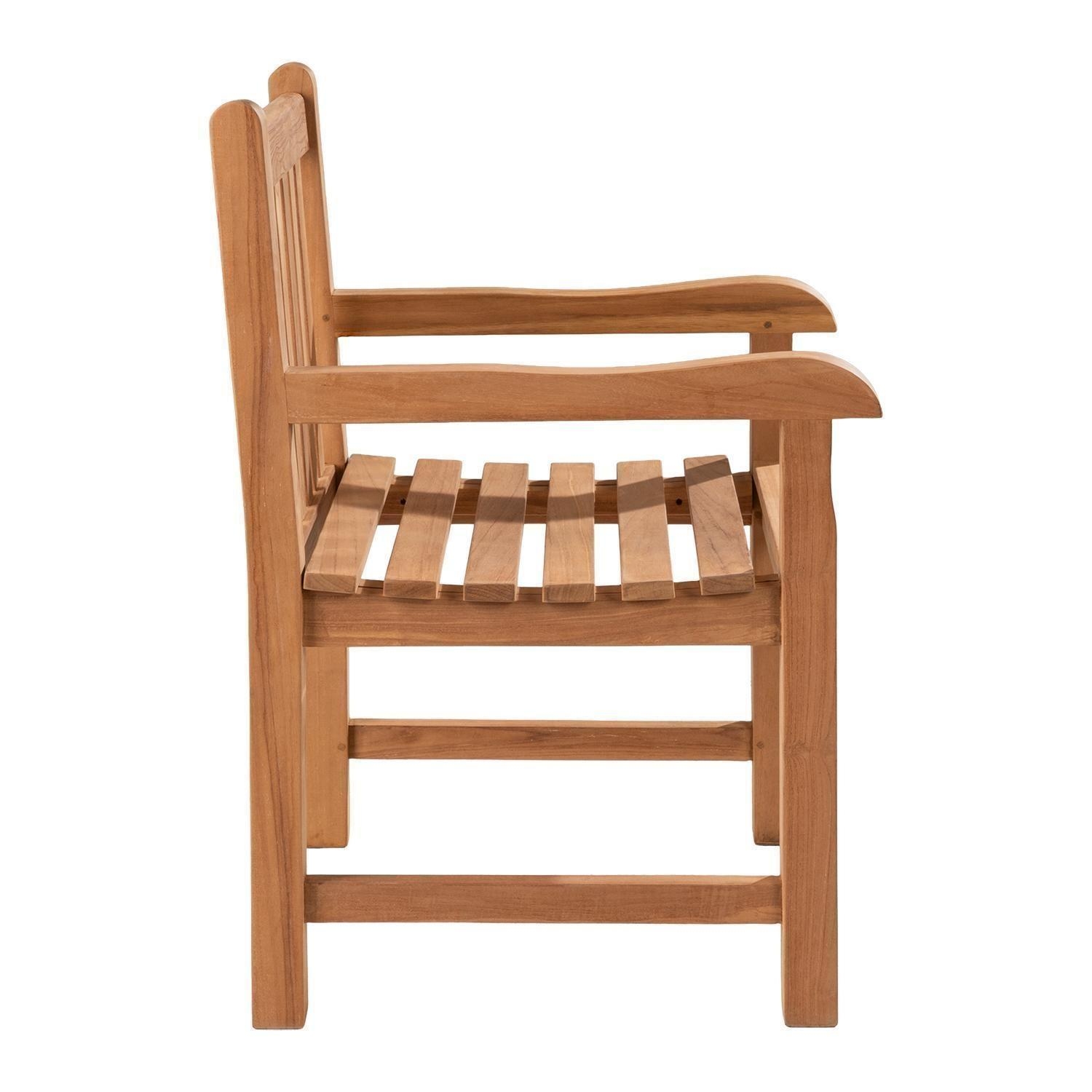 Der Gartenstuhl KAMPEN der Marke Home4You ist aus massivem Teakholz gefertigt und in der Farbe Braun gestaltet. Dieses Sitzmöbel für den Außenbereich verfügt über Armlehnen sowie eine leicht abgerundete Sitzfläche. Die Abmessungen belaufen sich auf eine Breite von 60 cm, eine Höhe von 87 cm und eine Tiefe von 51 cm. Aufgrund der Materialeigenschaften des massiven Teakholzes ist dieser Holzstuhl witterungsbeständig.