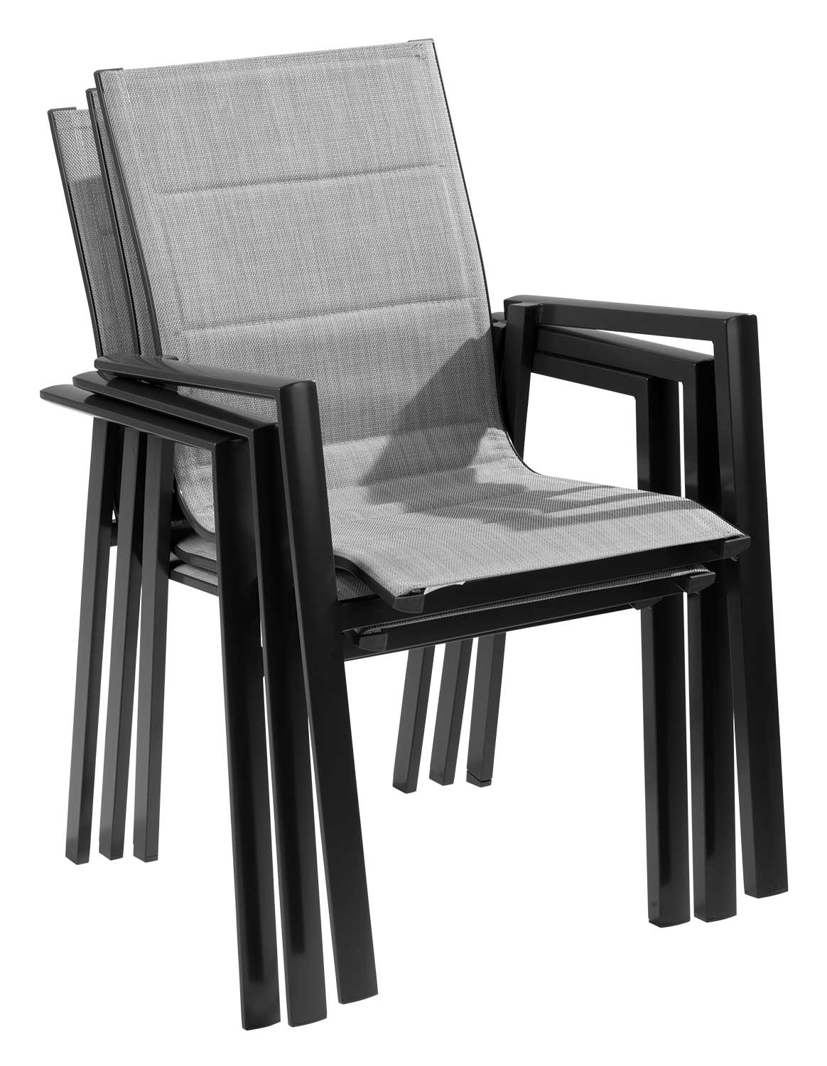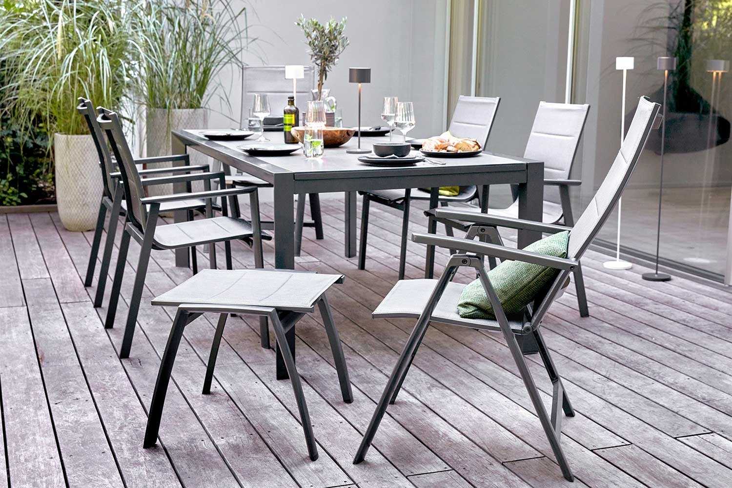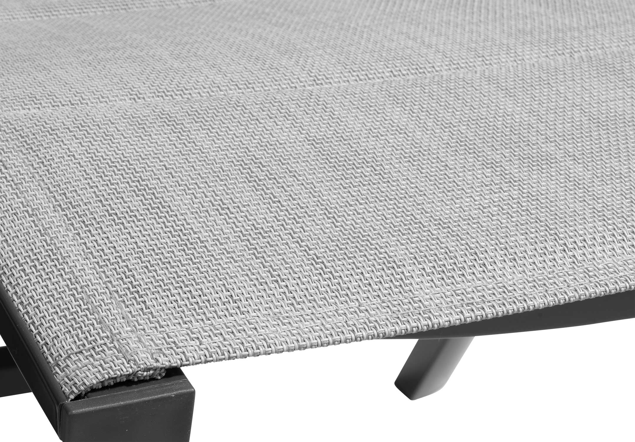 Das Gestell besteht aus hochwertigem und stabilem Aluminium. Die Pulverbeschichtung macht ihn zudem pflegeleicht und witterungsbeständig. Die Sitz- und Rückenlehnenbespannungen bestehen aus Textilen. Dieses Material ist ein mit PVC umwickeltes Polyestergewebe. Textilen zeichnet sich durch absolute Wetterfestigkeit, hohe UV-Beständigkeit, Farbbeständigkeit und Reißfestigkeit aus. Des Weiteren ist das Material hautsympathisch, wasserabweisend, schnell trocknend sowie hitze- und frostbeständig.