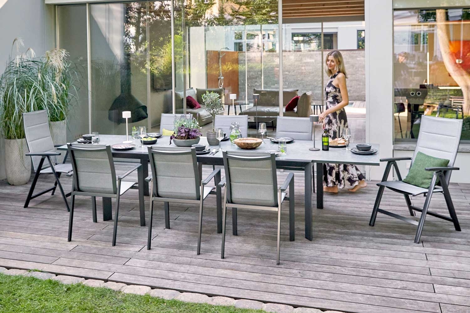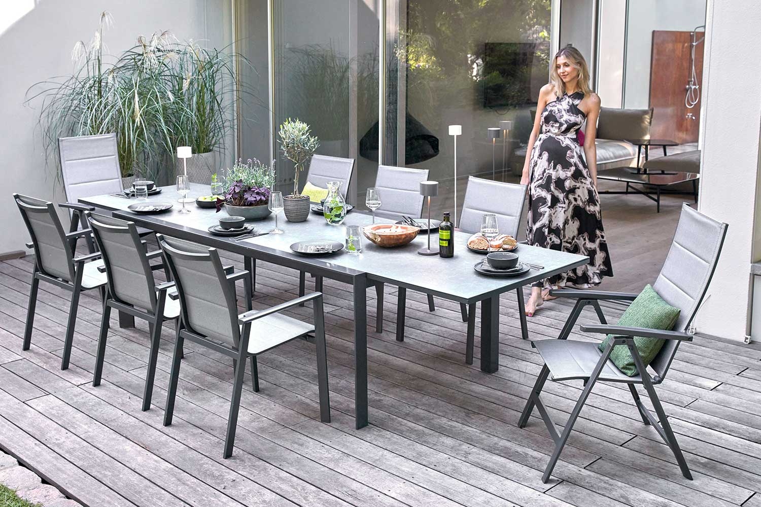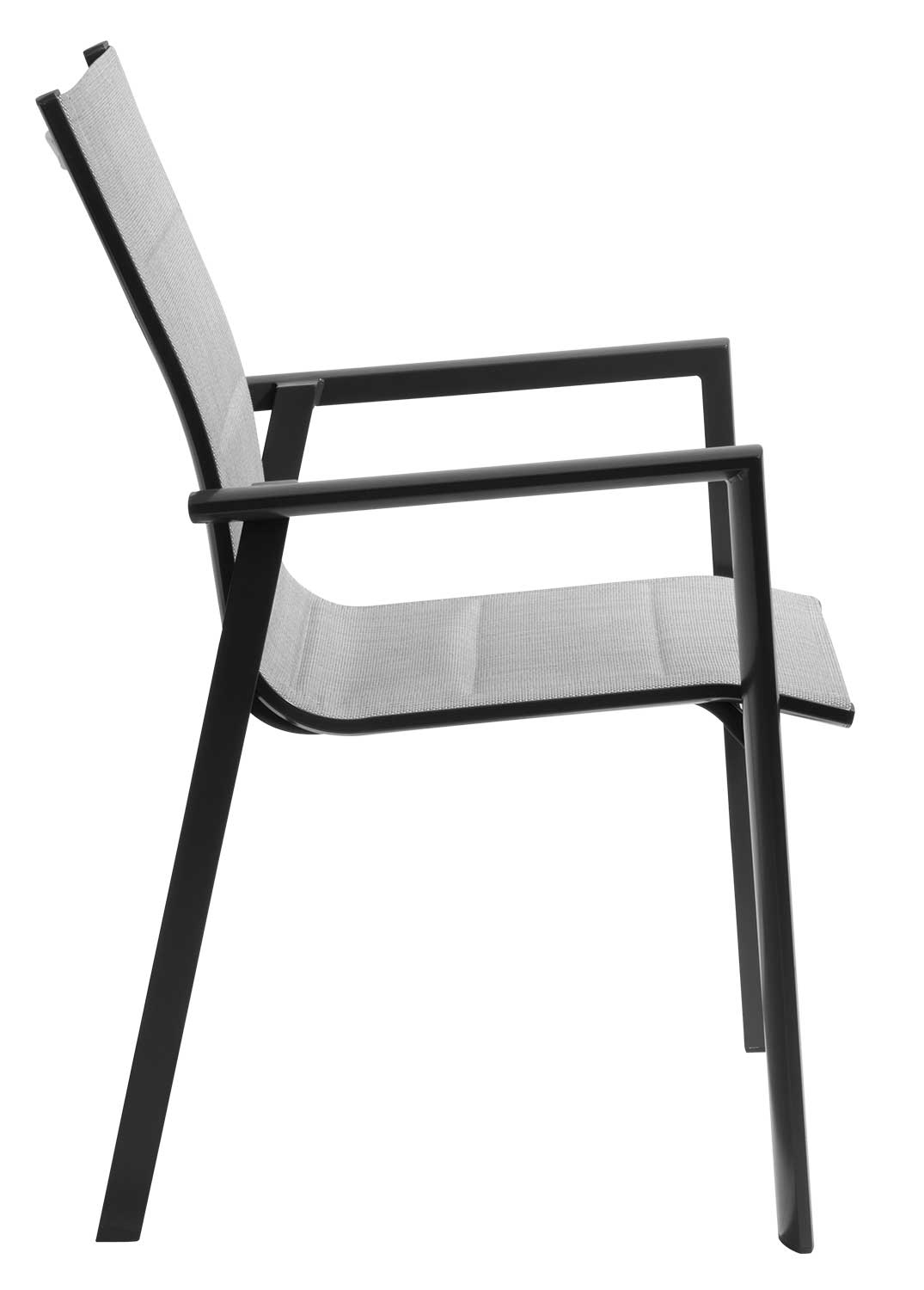 Das Gestell besteht aus hochwertigem und stabilem Aluminium. Die Pulverbeschichtung macht ihn zudem pflegeleicht und witterungsbeständig. Die Sitz- und Rückenlehnenbespannungen bestehen aus Textilen. Dieses Material ist ein mit PVC umwickeltes Polyestergewebe. Textilen zeichnet sich durch absolute Wetterfestigkeit, hohe UV-Beständigkeit, Farbbeständigkeit und Reißfestigkeit aus. Des Weiteren ist das Material hautsympathisch, wasserabweisend, schnell trocknend sowie hitze- und frostbeständig.