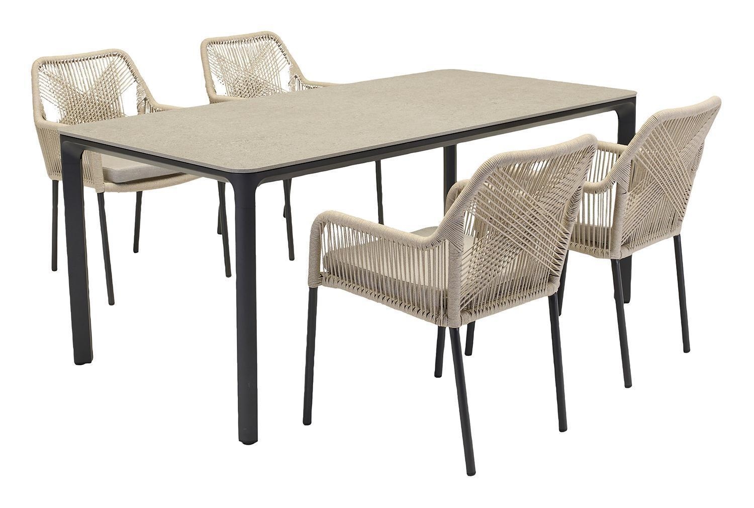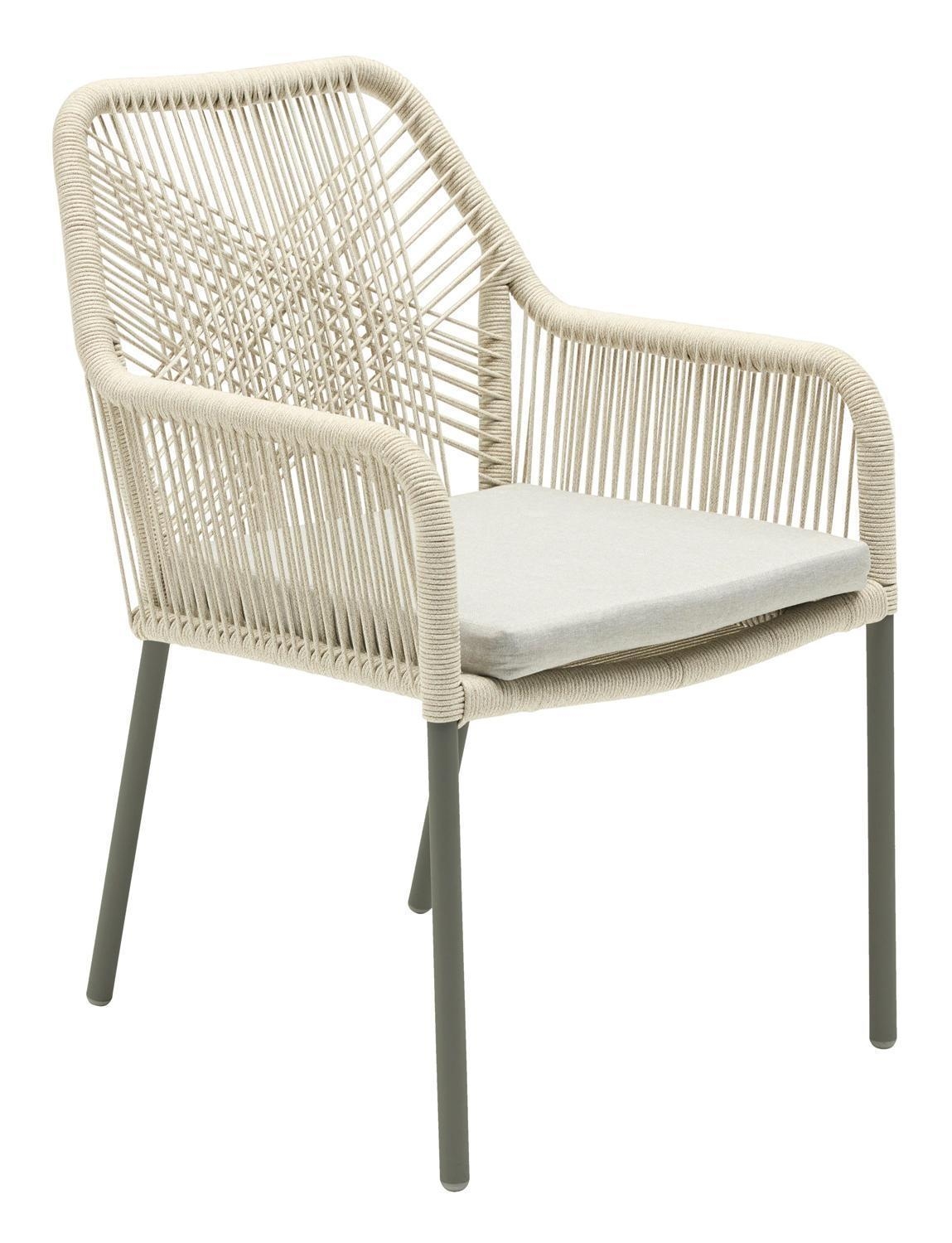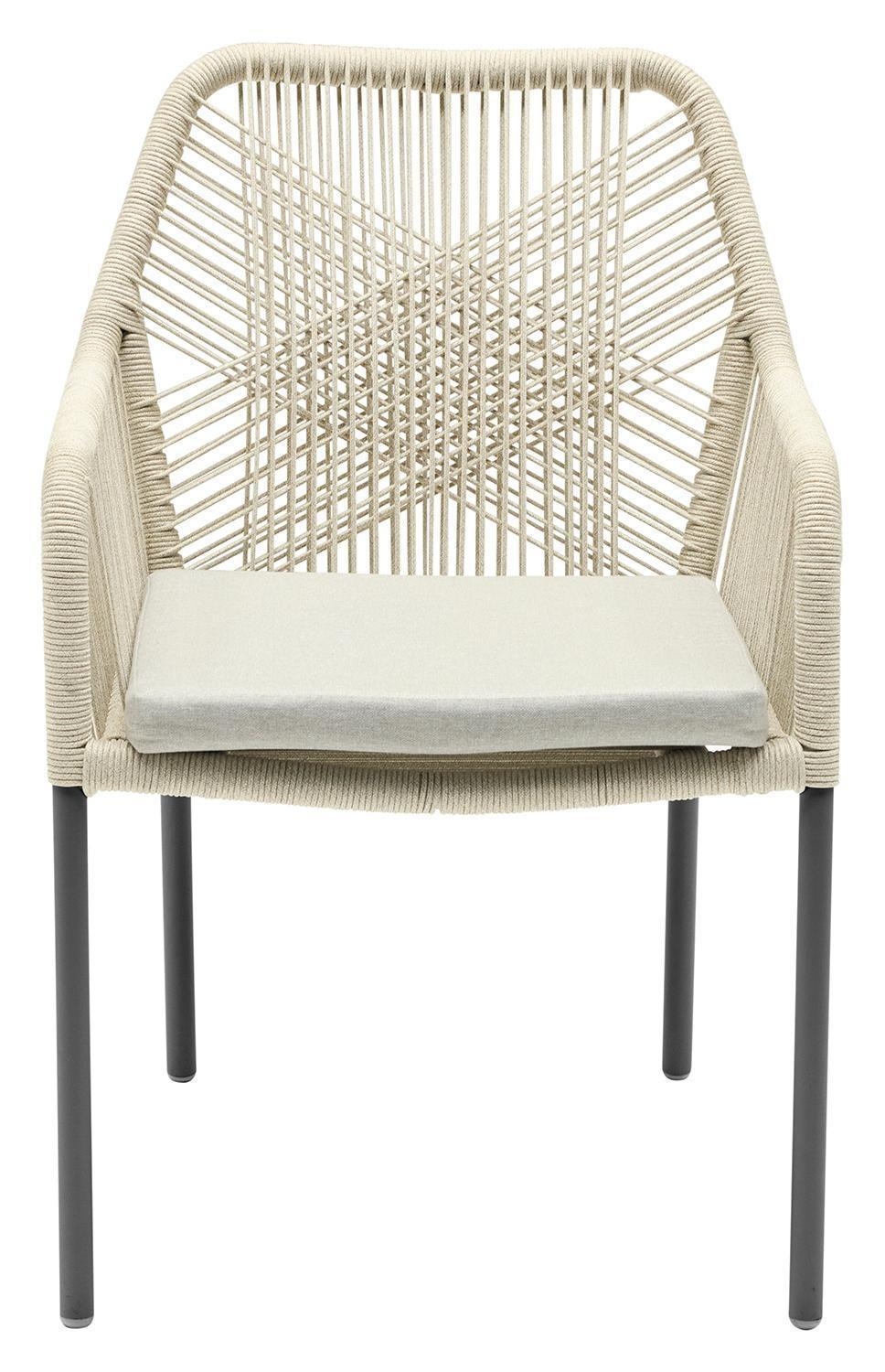 Der Gartenstuhl STILO der Marke outdoor ist mit einem anthrazitfarbenen Aluminiumgestell ausgestattet und verfügt über eine Seiten- sowie Rückenbespannung aus beigen Seilen. Dieser Terrassenstuhl weist eine Breite von 56 cm, eine Höhe von 84 cm sowie eine Tiefe von 64 cm auf. Zur Ausstattung gehört ein Sitzkissen, das mit einem beigen Polyesterbezug versehen ist. Aufgrund der gewählten Materialien ist dieser Stuhl für den Außenbereich geeignet, langlebig und witterungsbeständig.