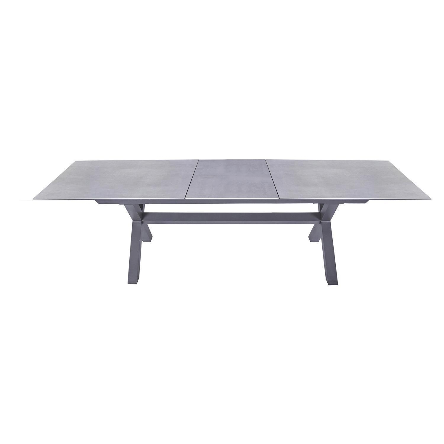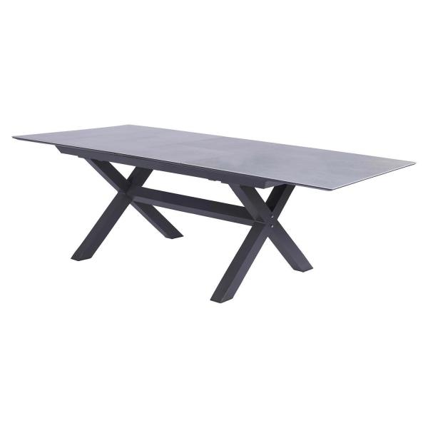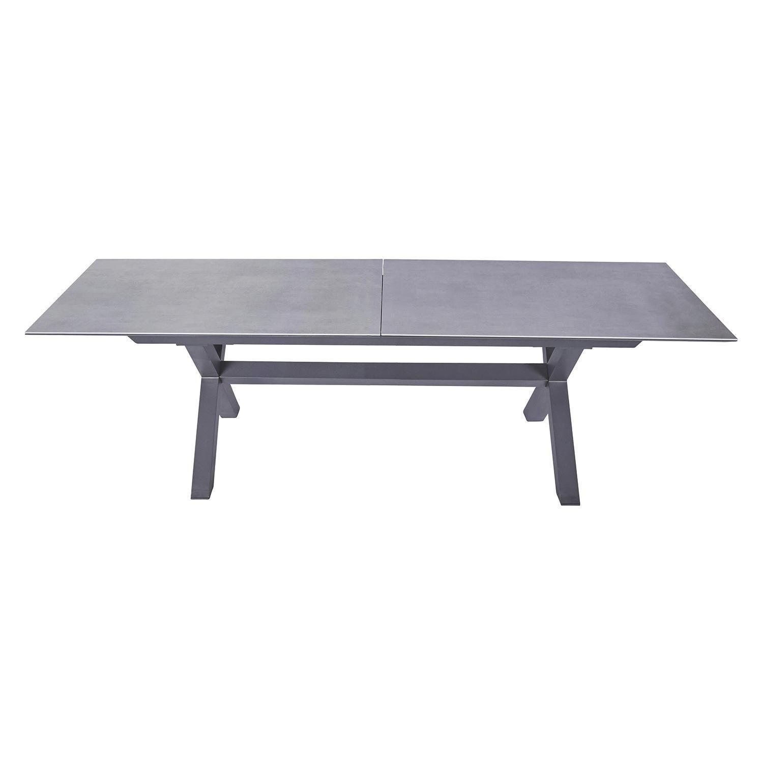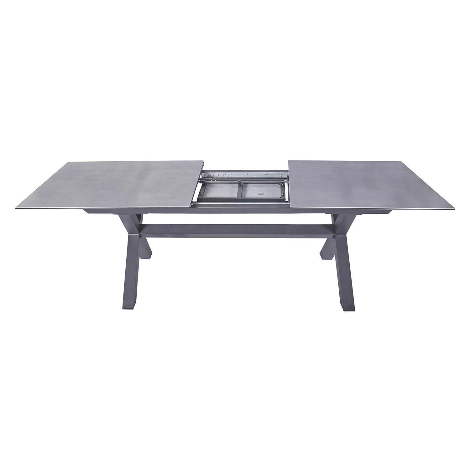 Der Gartentisch VANCOUVER der Marke Home4You verfügt über eine Tischplatte aus Keramik in Betonoptik. Das Gestell besteht aus Aluminium in der Farbe Anthrazit. Der Tisch hat eine Breite von 200 cm und kann auf 260 cm ausgezogen werden. Die Tiefe beträgt 100 cm, die Höhe liegt bei 76 cm.