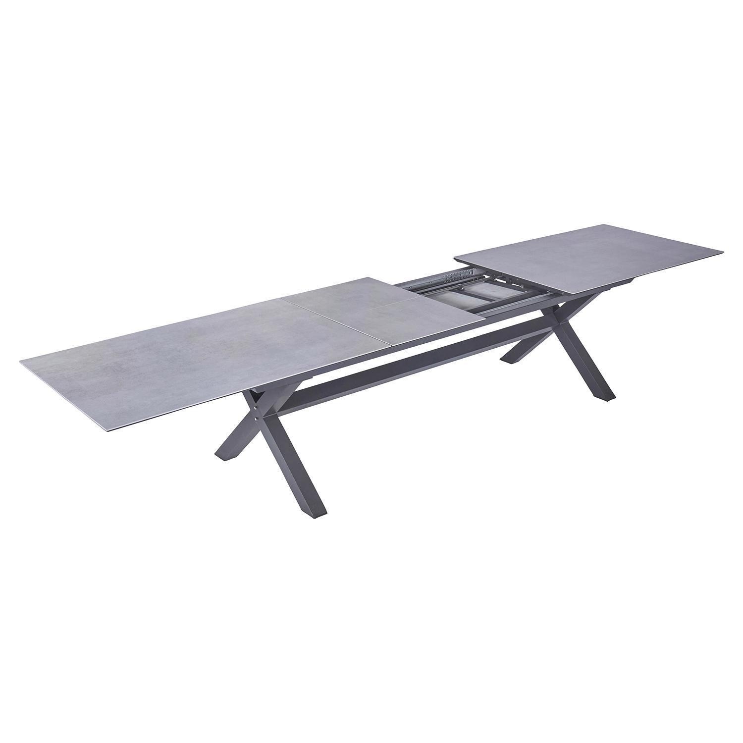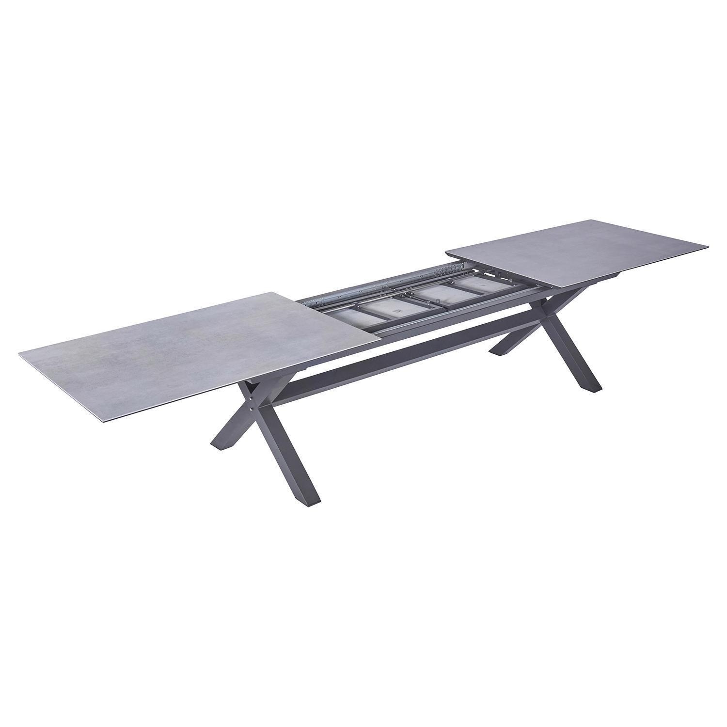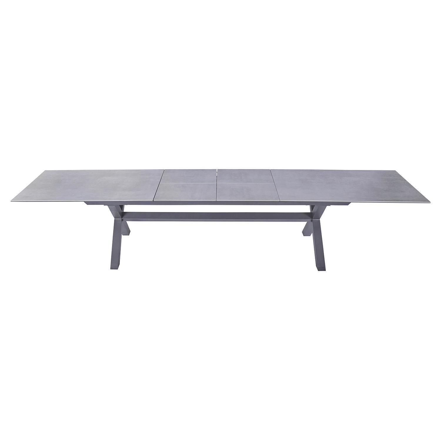 Der Gartentisch VANCOUVER der Marke Home4You verfügt über eine Tischplatte aus Keramik in Betonoptik. Das Gestell besteht aus Aluminium in der Farbe Anthrazit. Der Tisch hat eine Breite von 280 cm und kann durch zwei Einlegeplatten auf 340 und 400 cm ausgezogen werden. Die Tiefe beträgt 100 cm, die Höhe liegt bei 76 cm.