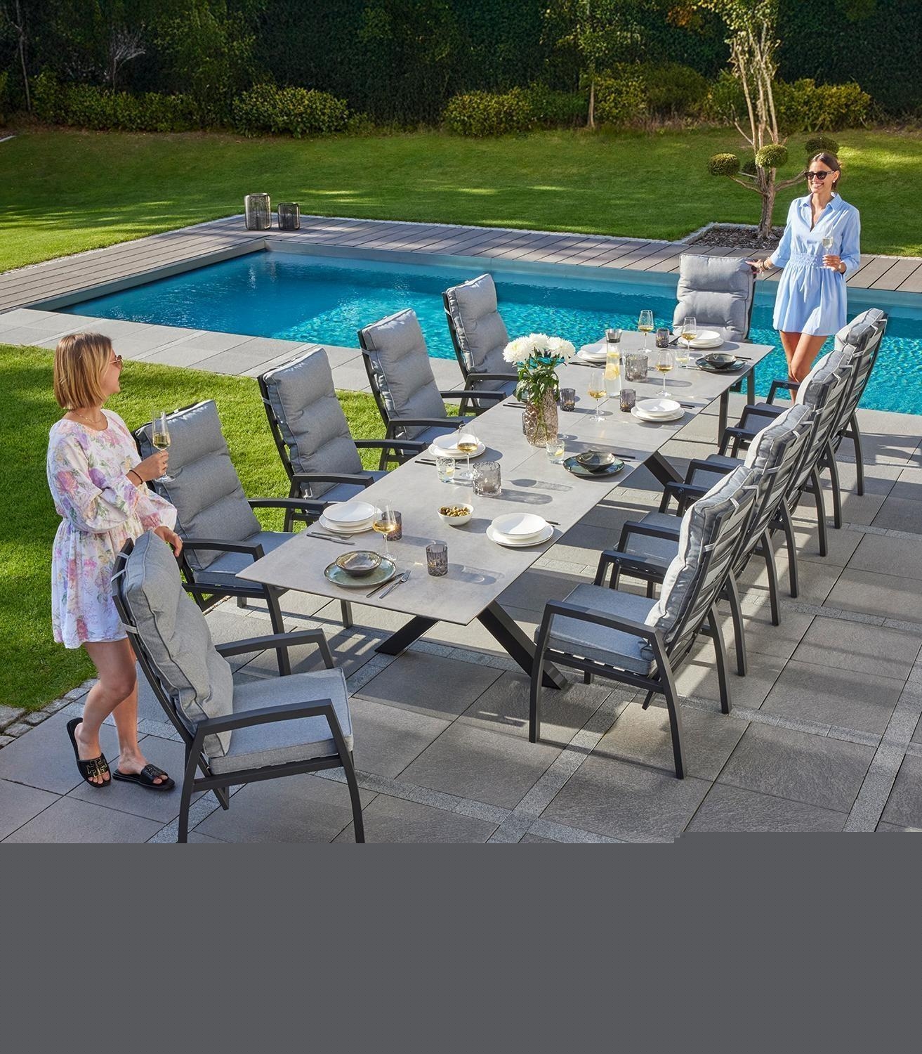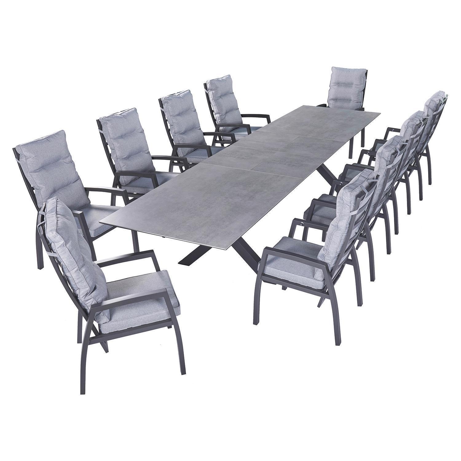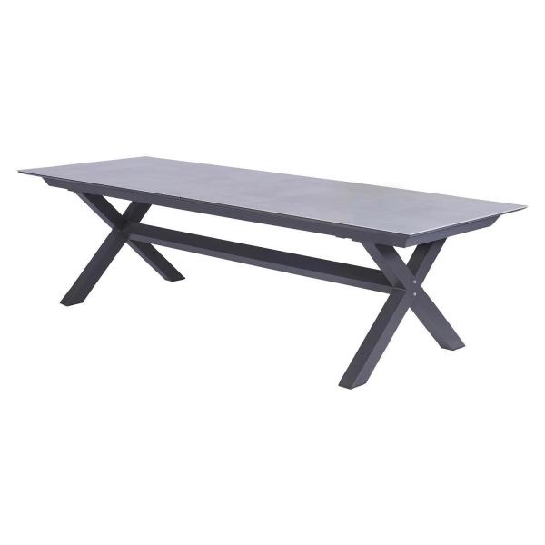 Der Gartentisch VANCOUVER der Marke Home4You verfügt über eine Tischplatte aus Keramik in Betonoptik. Das Gestell besteht aus Aluminium in der Farbe Anthrazit. Der Tisch hat eine Breite von 280 cm und kann durch zwei Einlegeplatten auf 340 und 400 cm ausgezogen werden. Die Tiefe beträgt 100 cm, die Höhe liegt bei 76 cm.