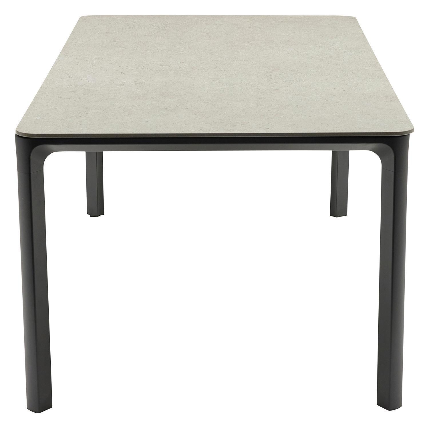 Der Gartentisch STILO der Marke Home4You ist mit einer Tischplatte aus grauem gesintertem Stein ausgestattet und verfügt über ein anthrazitfarbenes Aluminiumgestell. Dieser Esstisch für den Außenbereich weist eine Breite von 160 cm, eine Höhe von 75 cm sowie eine Tiefe von 90 cm auf. Die Materialbeschaffenheit der Oberfläche ist kratzfest und fleckenabweisend. In seinen Abmessungen ist dieser Terrassentisch für die Nutzung durch 4 bis 6 Personen konzipiert.