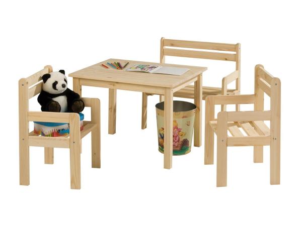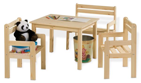 Deshalb haben wir ausschließlich unbehandeltes Kiefernholz verwendet. Der Kindertisch bietet inklusive zweier Stühle und eines Bänkchens Platz für vier Kinder.