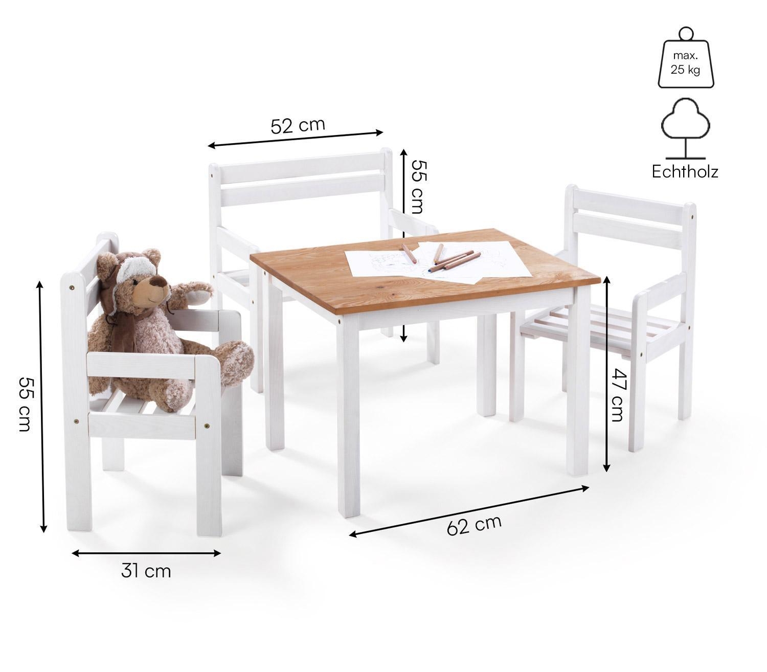 Die gesamte Kindersitzgruppe wurde aus hochwertigem Massivholz gefertigt. Der Kindertisch bietet inklusive zweier Stühle und eines Bänkchens Platz für vier Kinder.