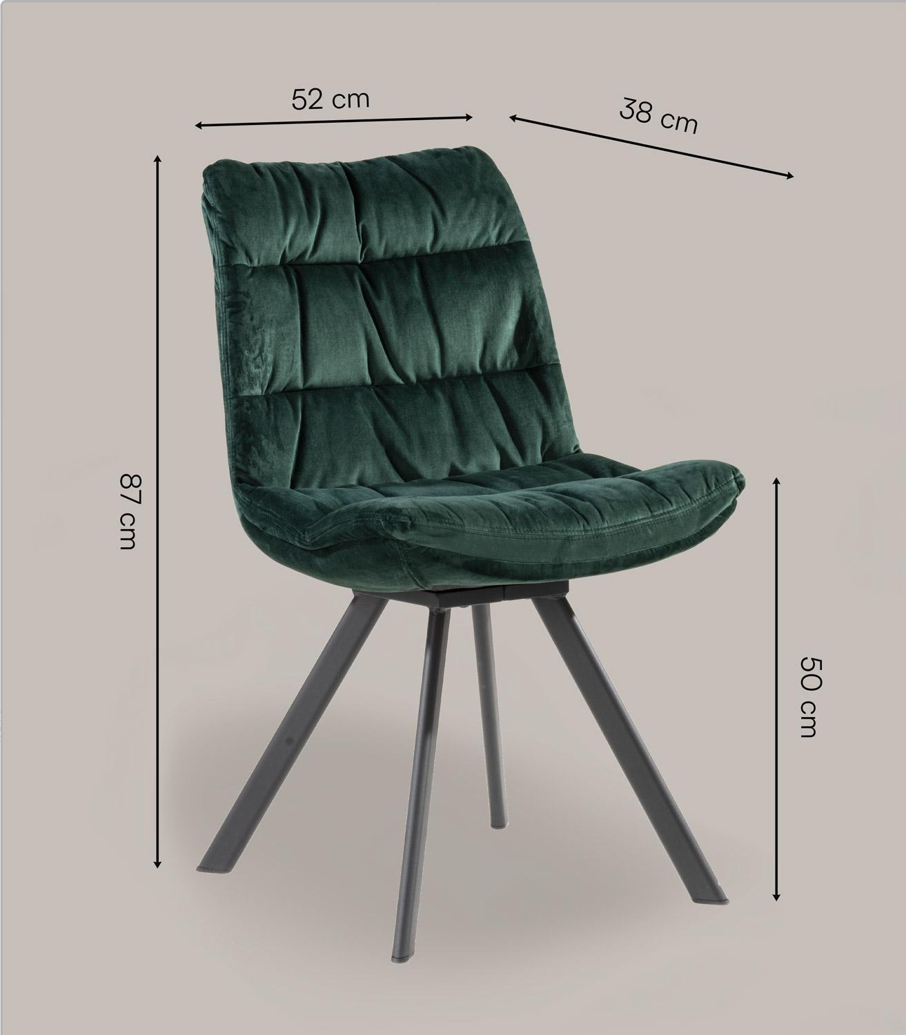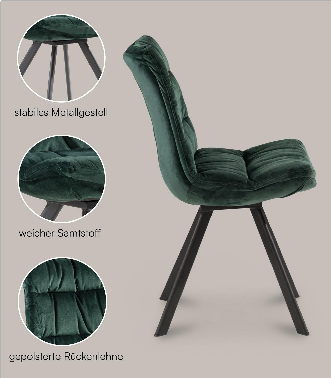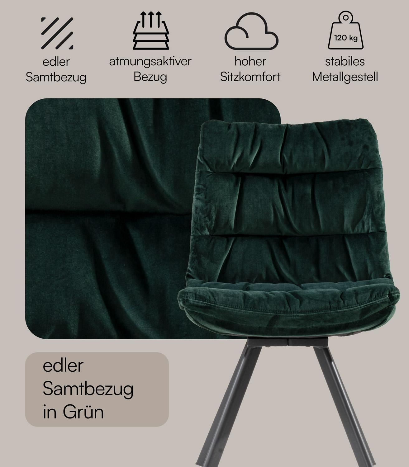 Der Home4You Polsterstuhl in lebhaftem Grün präsentiert sich mit einem edlen Samtbezug und einem schwarzmatten Metallgestell. Die Falten-Steppung in der Rückenlehne verleiht dem Stuhl eine elegante Note. Mit hohem Sitzkomfort bietet dieser Stuhl nicht nur ansprechendes Design, sondern auch ein gemütliches Sitzerlebnis für Ihr Zuhause.