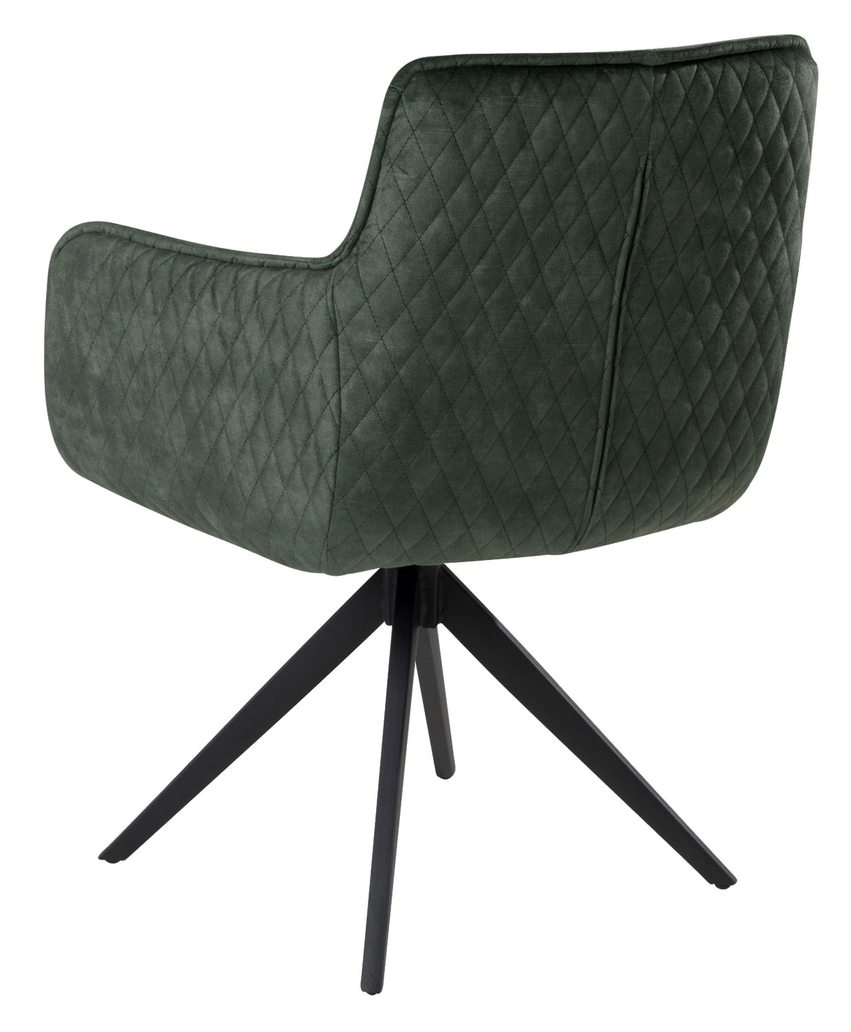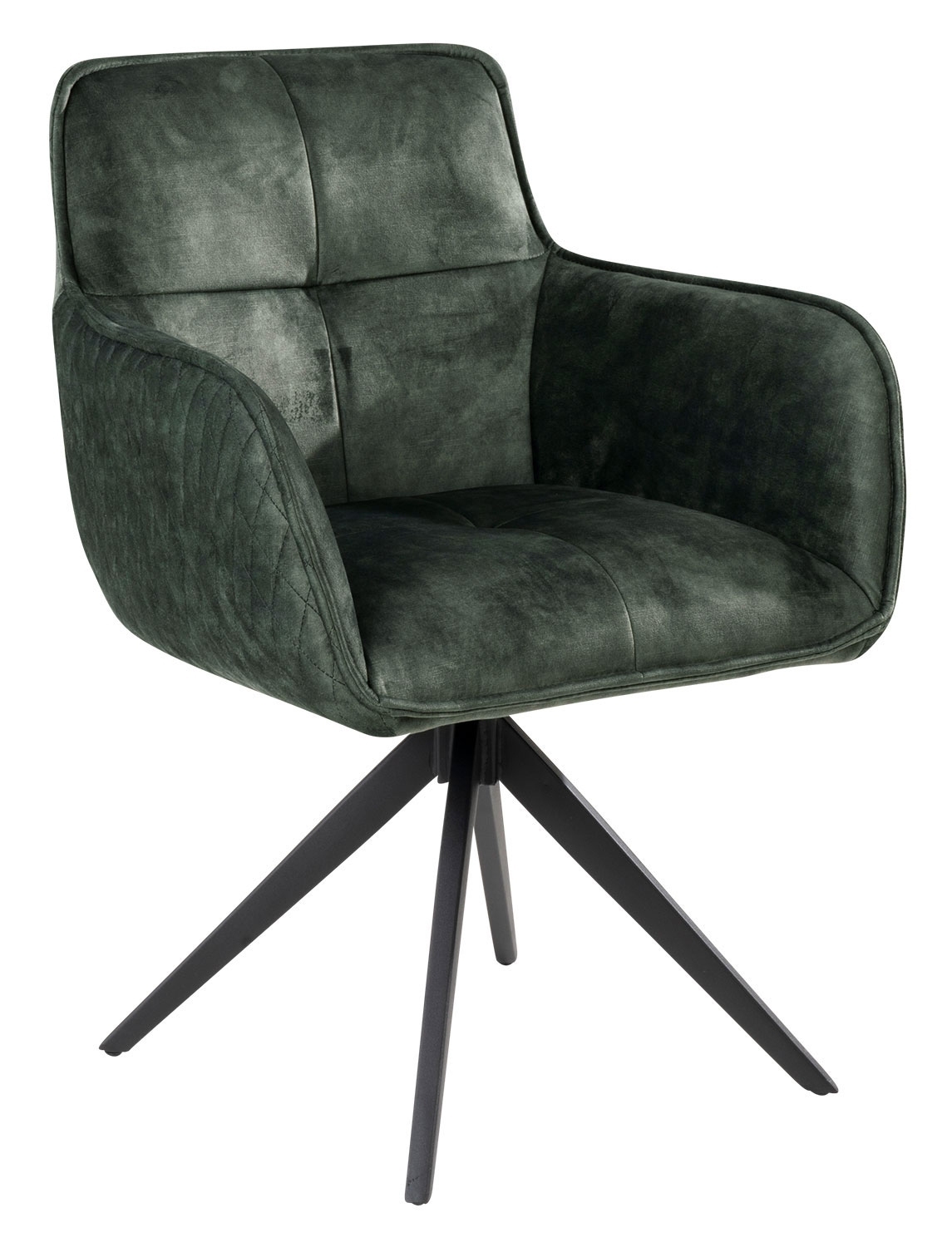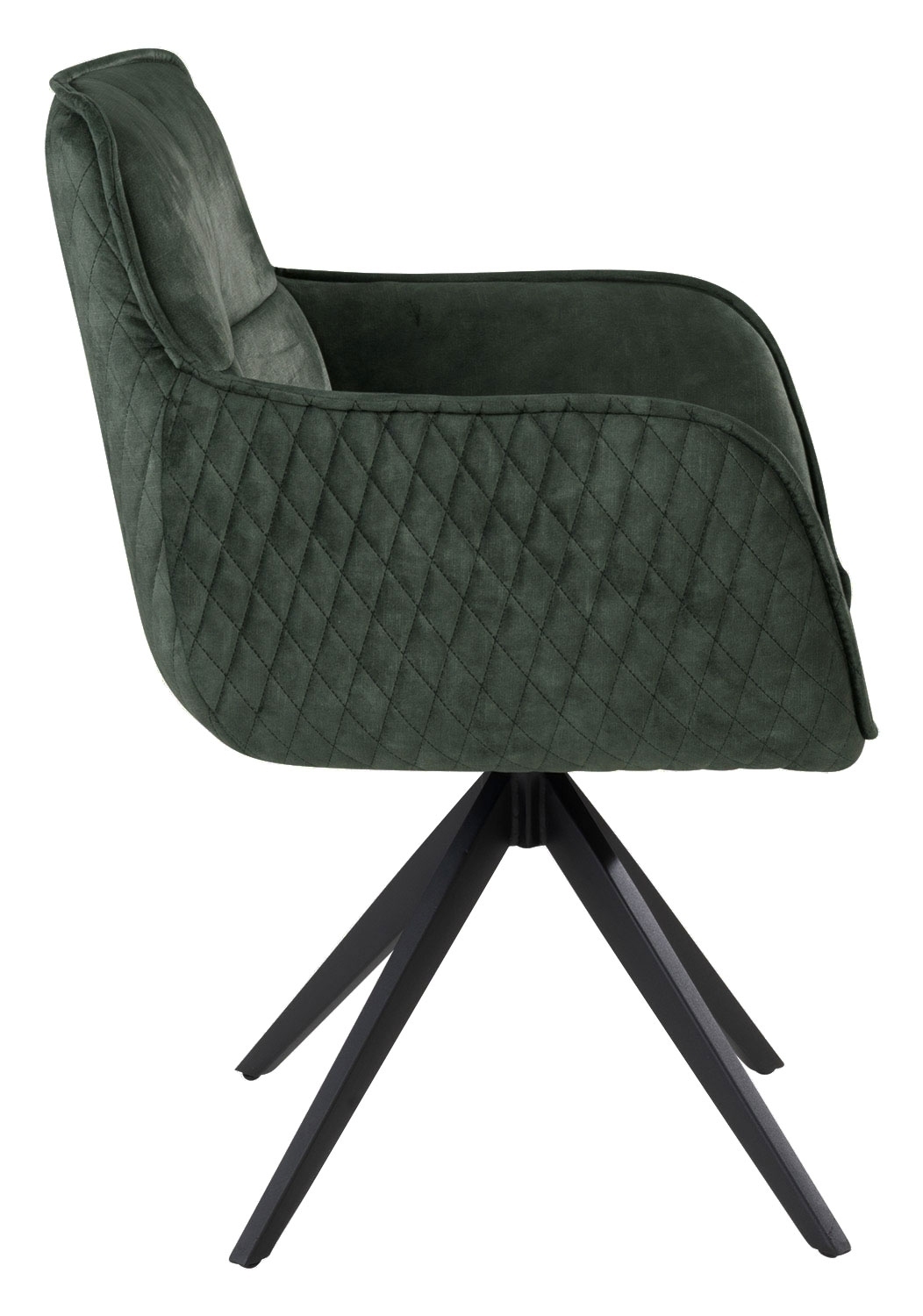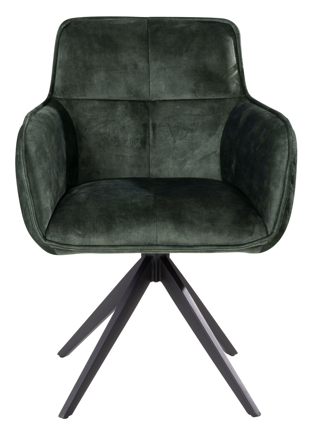 Der drehbare Polsterstuhl von Home4You ist eine perfekte Kombination aus Stil und Funktionalität. Mit seinem dunkelgrünen Samtbezug und dem schwarzen Metallgestell strahlt er Eleganz und Modernität aus. Der Stuhl verfügt über Armlehnen für zusätzlichen Komfort und ist um 360 Grad drehbar, was Flexibilität und Bewegungsfreiheit bietet.