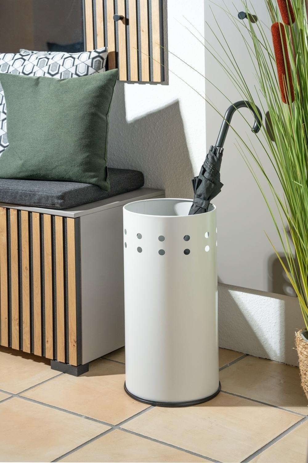 Mit einem Durchmesser von 23,5 cm und einer Höhe von 50 cm bietet dieser Schirmständer ausreichend Platz für mehrere Regenschirme oder Gehstöcke. Er verfügt außerdem über eine praktische Auffangschale, um eventuelles Tropfwasser aufzufangen und den Boden trocken zu halten. Sein minimalistisches Design fügt sich nahtlos in verschiedene Einrichtungsstile ein. Mit dem Schirmständer von Home4You halten Sie Ihren Eingangsbereich ordentlich und organisiert und schützen gleichzeitig Ihren Boden vor Feuchtigkeit.