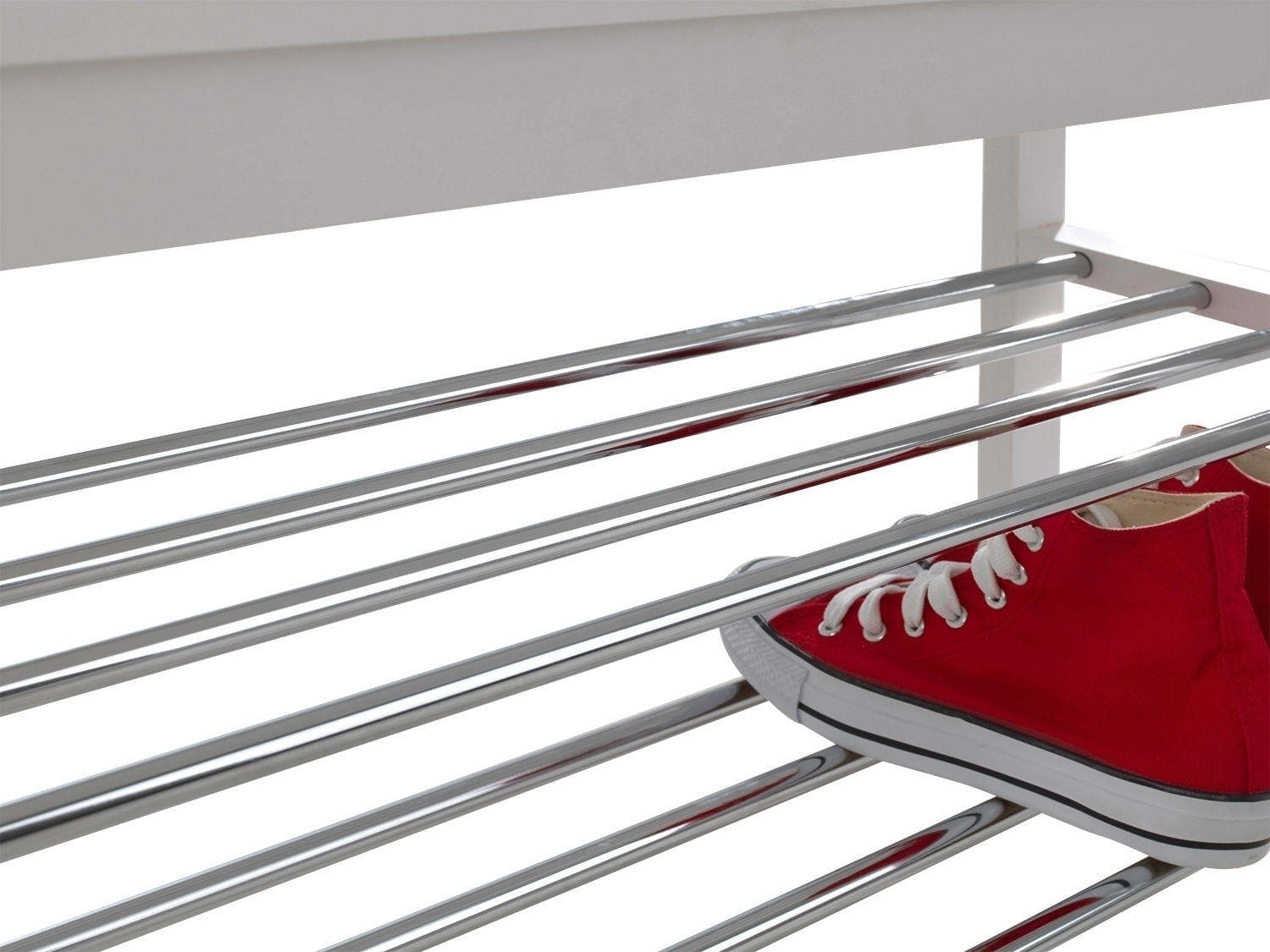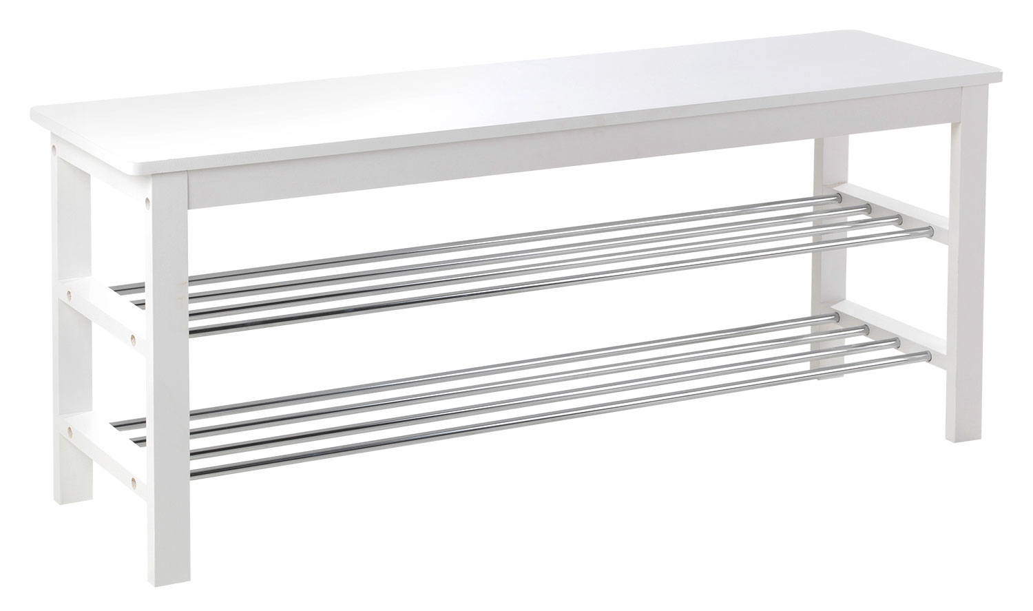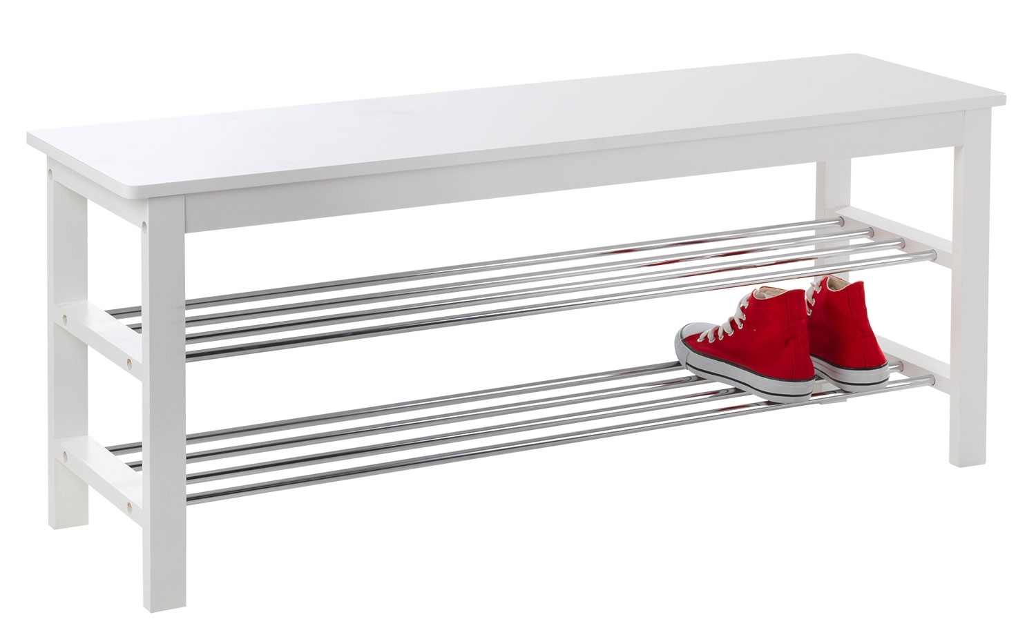 Die Schuhbank bietet Ihnen 2 Ablageflächen und eine Sitzfläche zum bequemem An- und Ausziehen Ihrer Schuhe. Der Rahmen der Bank besteht aus massivem Kiefernholz in weiß, die Sitzfläche aus weiß lackiertem MDF und die Stäbe aus verchromtem Metall.