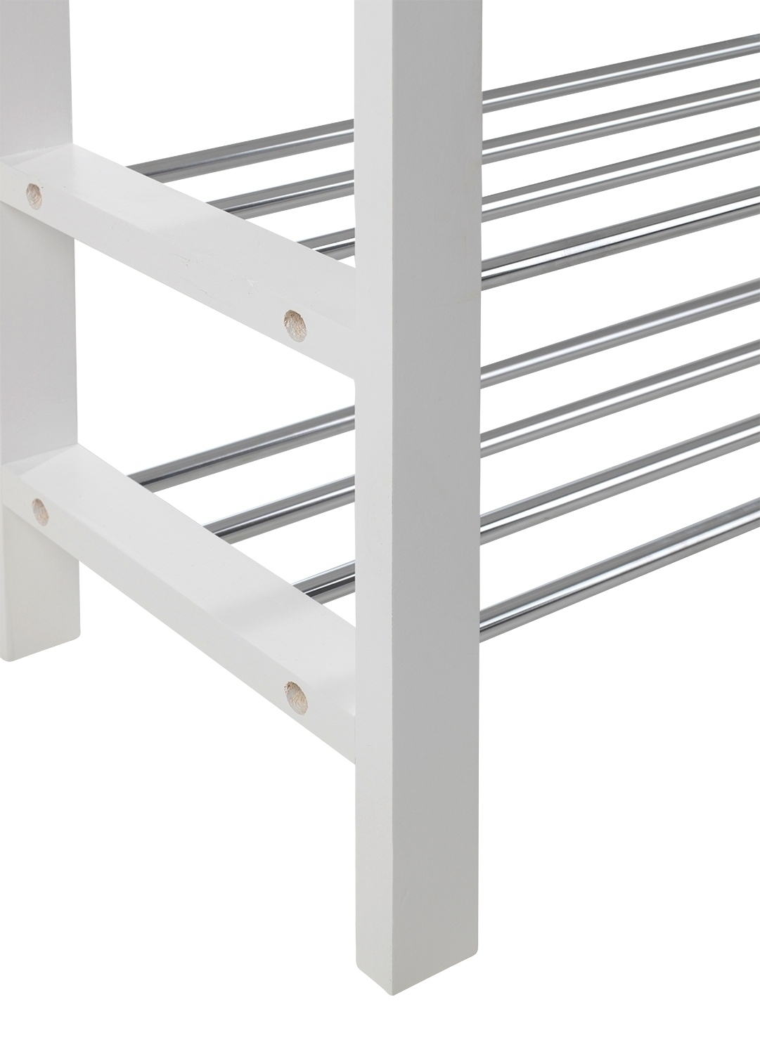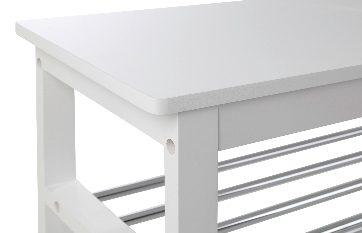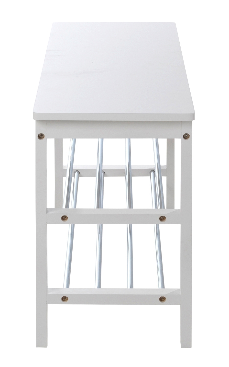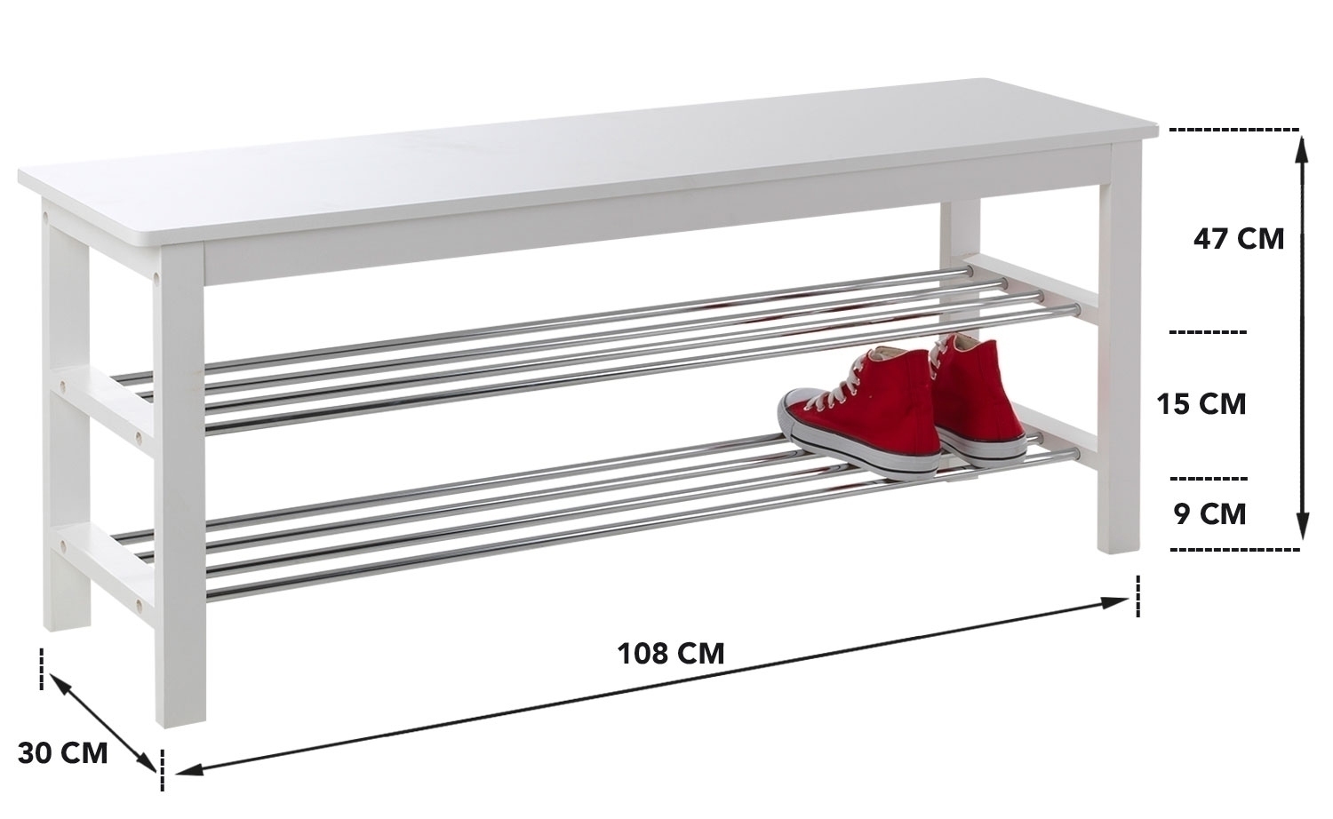 Die Schuhbank bietet Ihnen 2 Ablageflächen und eine Sitzfläche zum bequemem An- und Ausziehen Ihrer Schuhe. Der Rahmen der Bank besteht aus massivem Kiefernholz in weiß, die Sitzfläche aus weiß lackiertem MDF und die Stäbe aus verchromtem Metall.