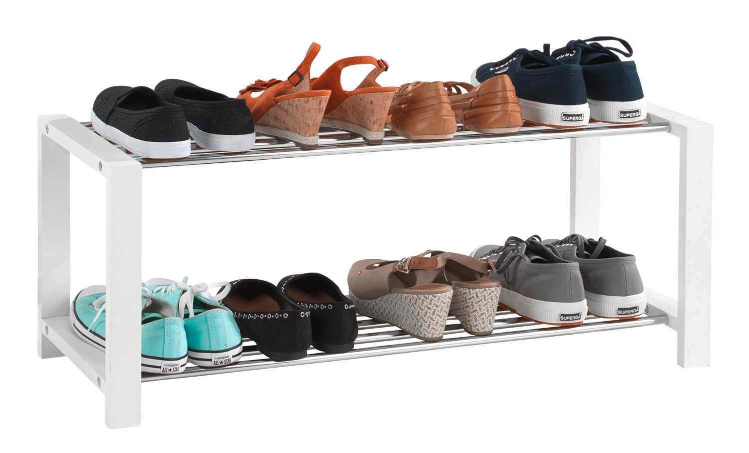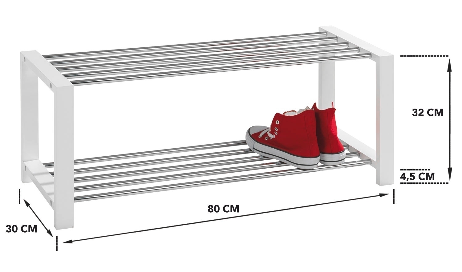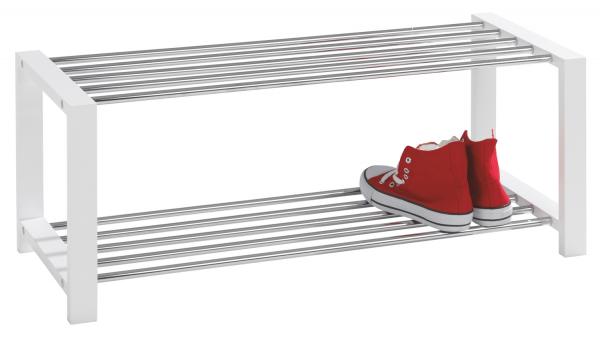 Das praktische Schuhregal bietet Ihnen 2 Ablageflächen für Ihre Schuhe. Der Rahmen besteht aus massivem Kiefernholz in weiß und die Stäbe aus verchromtem Metall. Zudem bietet das Regal Platz für ca. 6 - 8 Paar Schuhe.