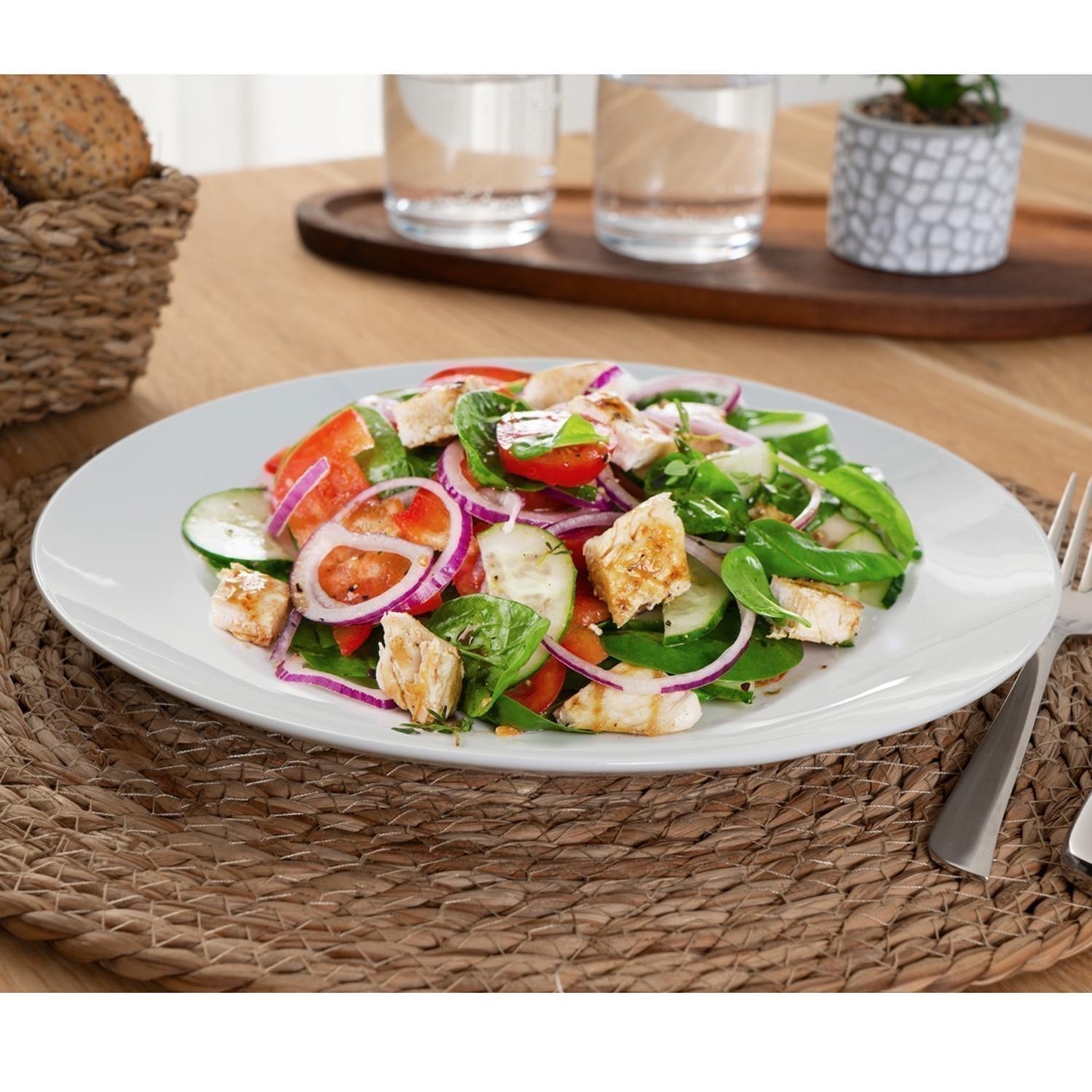 Der Speiseteller VIOLA der Marke Home4You wird einzeln geliefert und ist in Weiß gehalten. Er hat eine einfarbige Gestaltung ohne Muster und einen Durchmesser von 27 cm. Der Speiseteller besteht aus Porzellan.