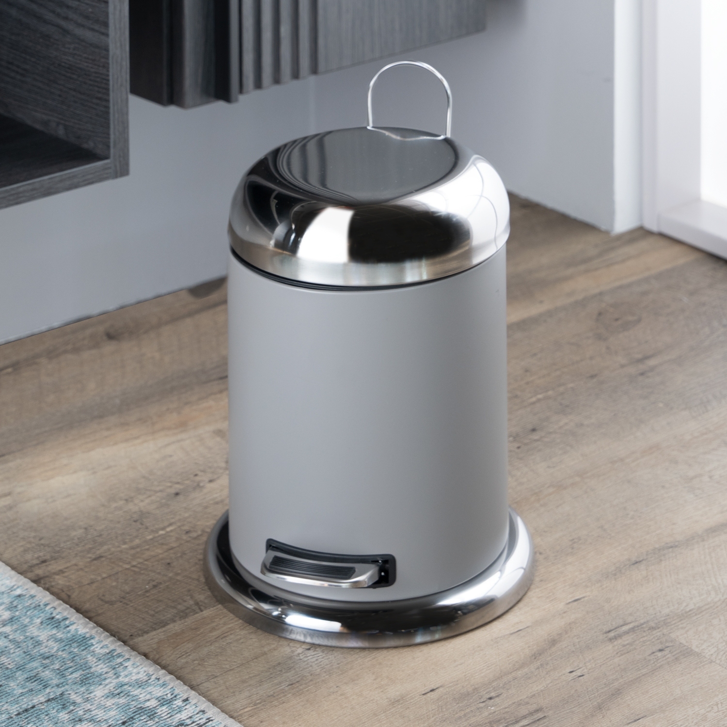 Der Treteimer NAPPO von Home4You ist aus robustem Metall gefertigt und verfügt über einen praktischen Kunststoffeinsatz. Dank seiner einfachen Handhabung ist er ideal für den täglichen Gebrauch in Küche oder Bad. Mit einem Fassungsvermögen von 5 Litern bietet er ausreichend Platz für Abfälle. Die Wandstärke von ca. 0,3 mm sorgt für zusätzliche Stabilität und Langlebigkeit. Der Deckel und der Sockel sind in glänzendem Silbergrau und der Korpus in mattem Grau gehalten. Ein funktionaler und stilvoller Helfer für Ihr Zuhause.