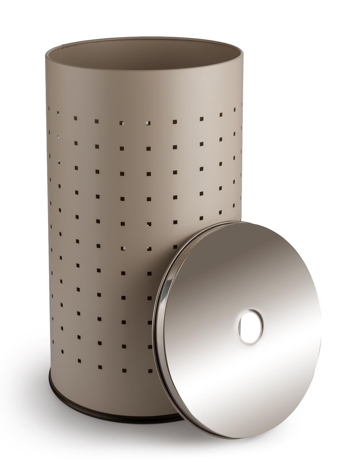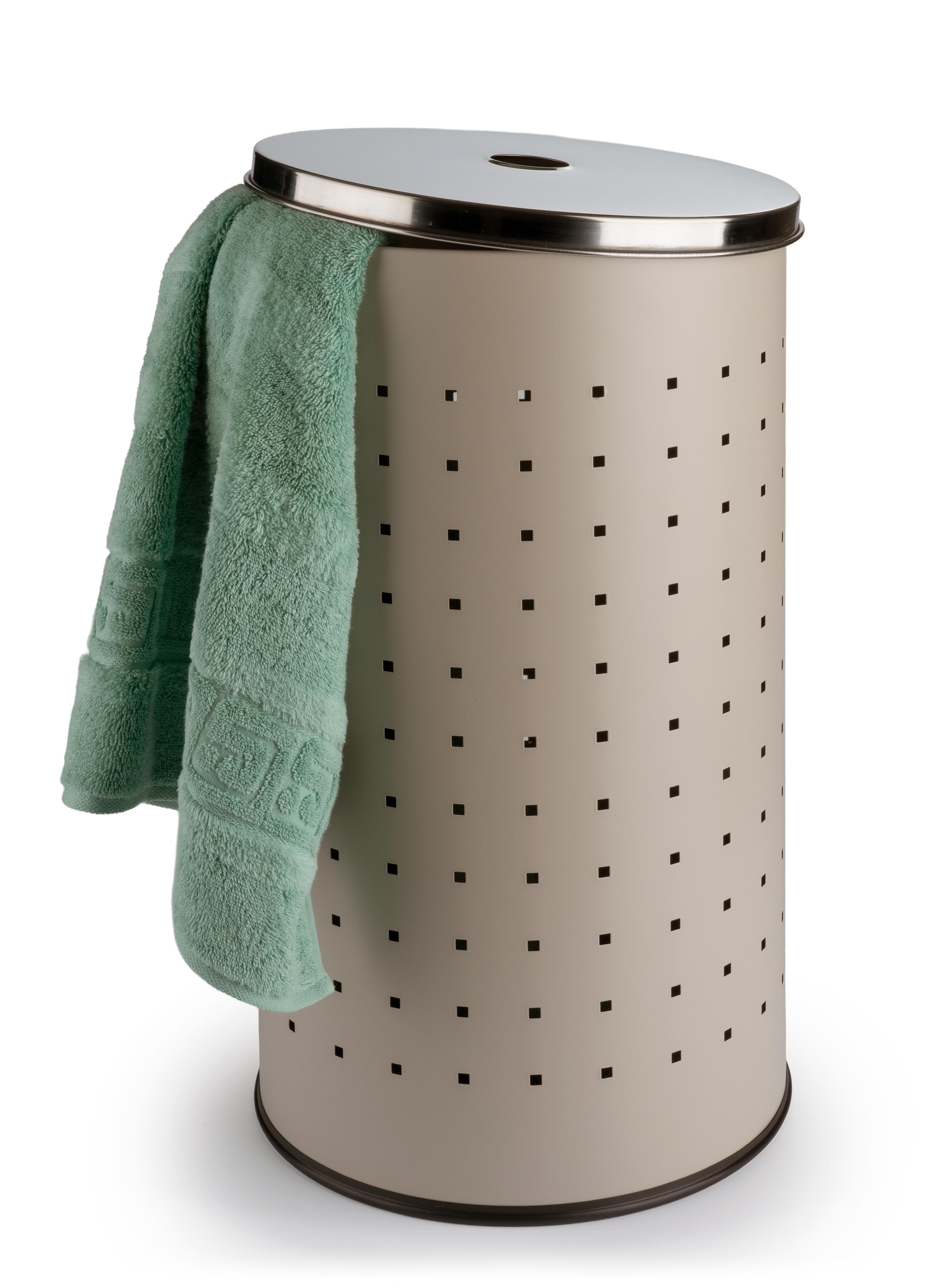 Hier kommt die Wäschetonne aus Edelstahl in Greige, welches der Tonne ein elegantes Design verleiht. Da die meisten Badezimmer in Greige gehalten sind, fügt sich der Wäschesammler mit seiner grauen Lackierung ideal in jede Badeinrichtung ein. Mit dem Deckel sorgen Sie dafür, dass das Chaos im Wäschekorb nicht sichtbar ist. Dieser lässt sich dank des cleveren Lochs in der Mitte einfach anheben. Großzügige Maße von 54 cm Höhe und einem Durchmesser von 29 cm bieten rund 37 Liter Fassungsvermögen. So verstauen Sie Ihre ganze Wäsche einfach und schnell. Diese edle Wäschetonne ist nicht nur ein Hingucker im Bad, sondern macht sich ebenso gut im Schlafzimmer, Ankleideraum oder der Waschküche.