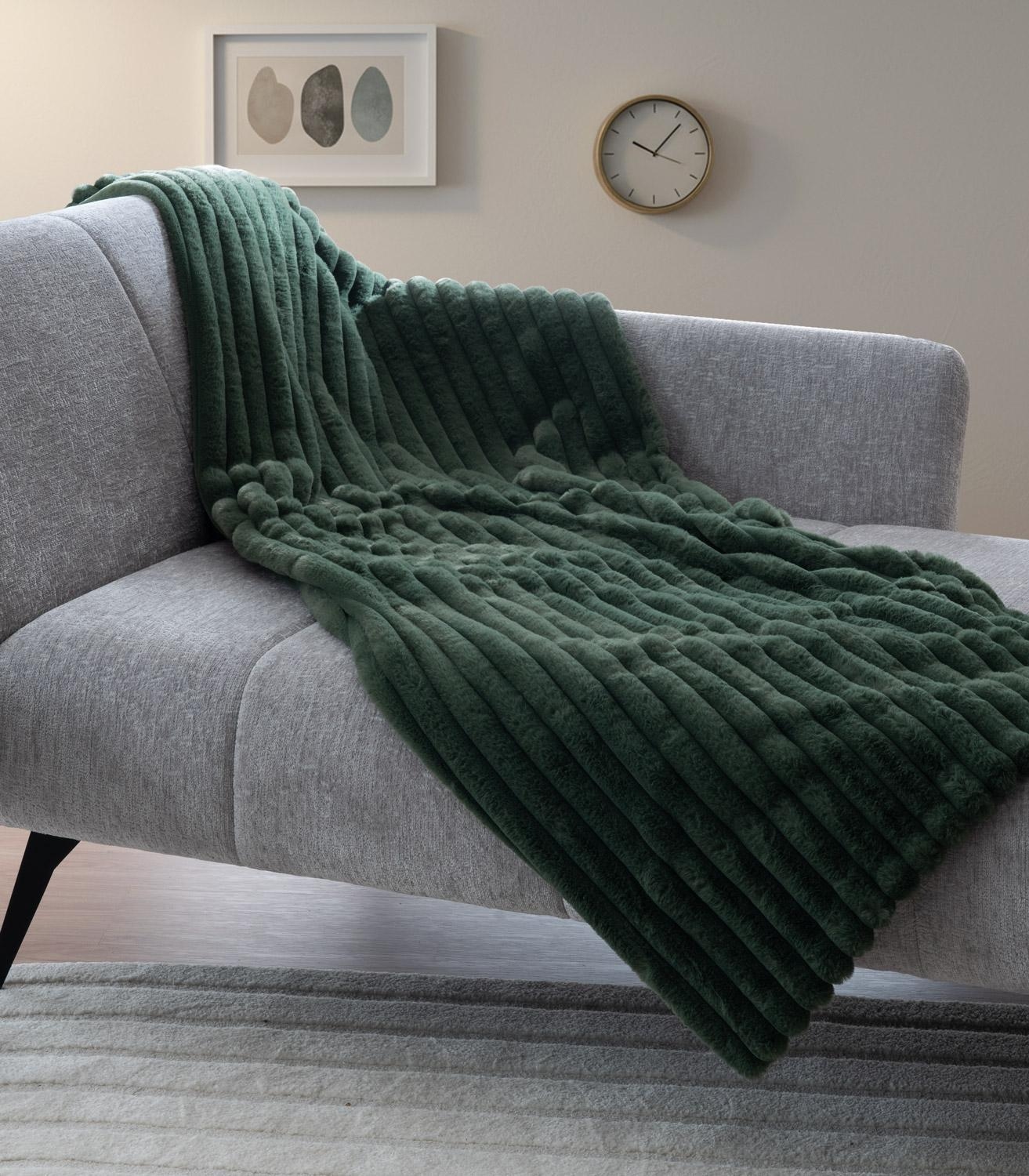 Die Wohndecke CARI von Home4You zeigt sich in einem modernen Grün und bietet mit einer Größe von 150 x 200 cm viel Komfort. Sie besteht aus weichem Polyester in Cordoptik und sorgt für ein angenehm kuscheliges Gefühl. Die Vorderseite verfügt über ein Gewicht von 450 gsm (Gramm pro Quadratmeter), während die Rückseite mit 180 gsm leichter gearbeitet ist. Diese Kombination macht die Decke besonders gemütlich und ideal zum Entspannen auf Sofa oder Bett.