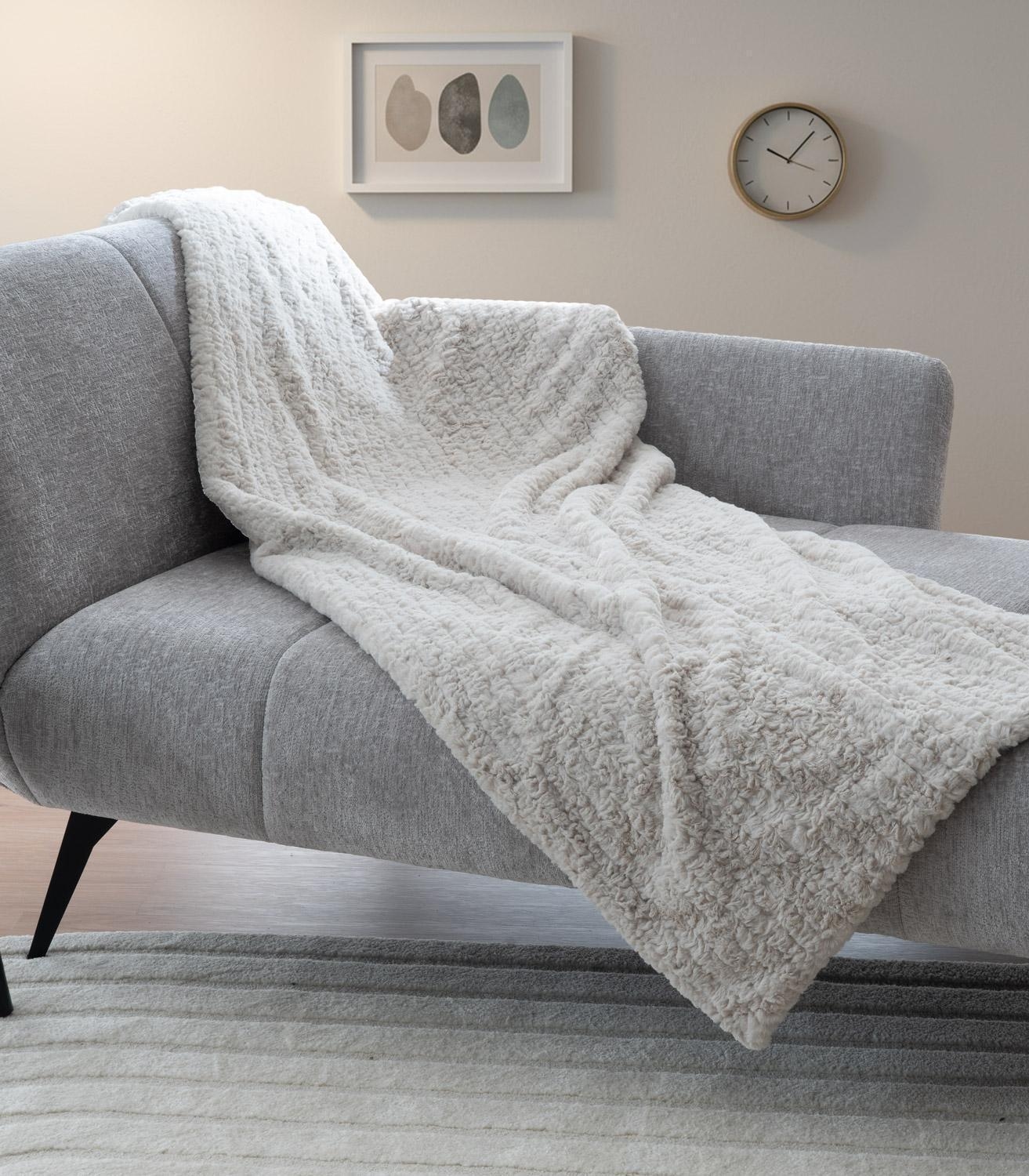 Die Wohndecke JENICA von Home4You zeigt sich in einem modernen Greige und bietet mit einer Größe von 150 x 200 cm viel Komfort. Sie besteht aus weichem Polyester in Flauschoptik und sorgt für ein angenehm kuscheliges Gefühl. Die Vorderseite verfügt über ein Gewicht von 600 gsm (Gramm pro Quadratmeter), während die Rückseite mit 180 gsm leichter gearbeitet ist. Diese Kombination macht die Decke besonders gemütlich und ideal zum Entspannen auf Sofa oder Bett.