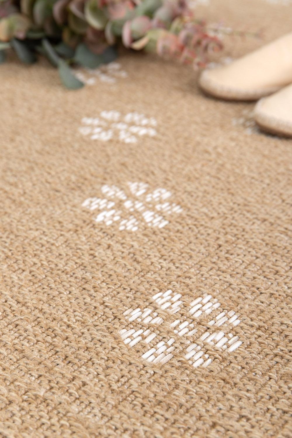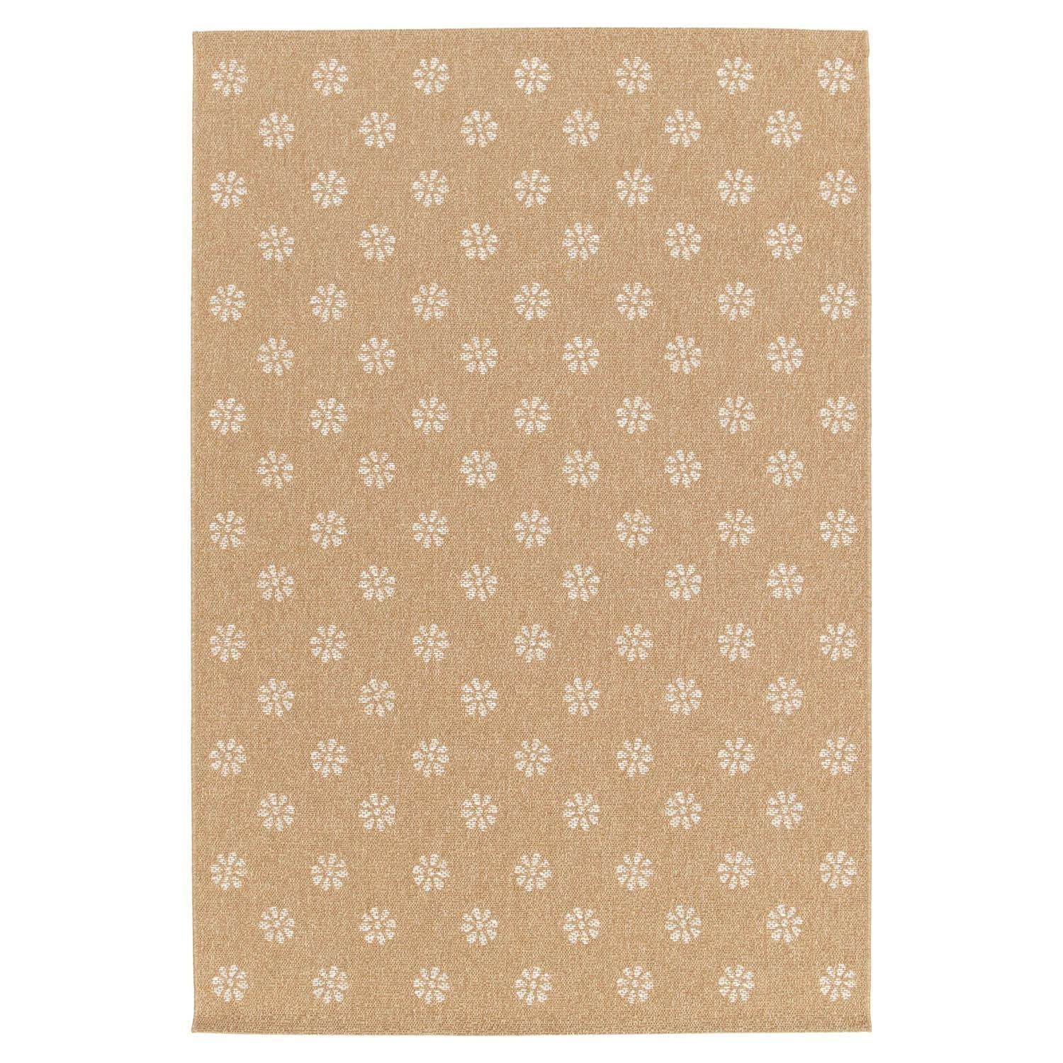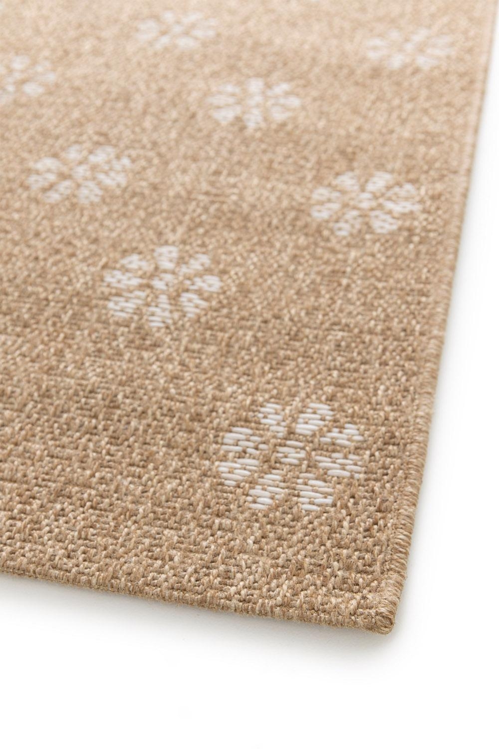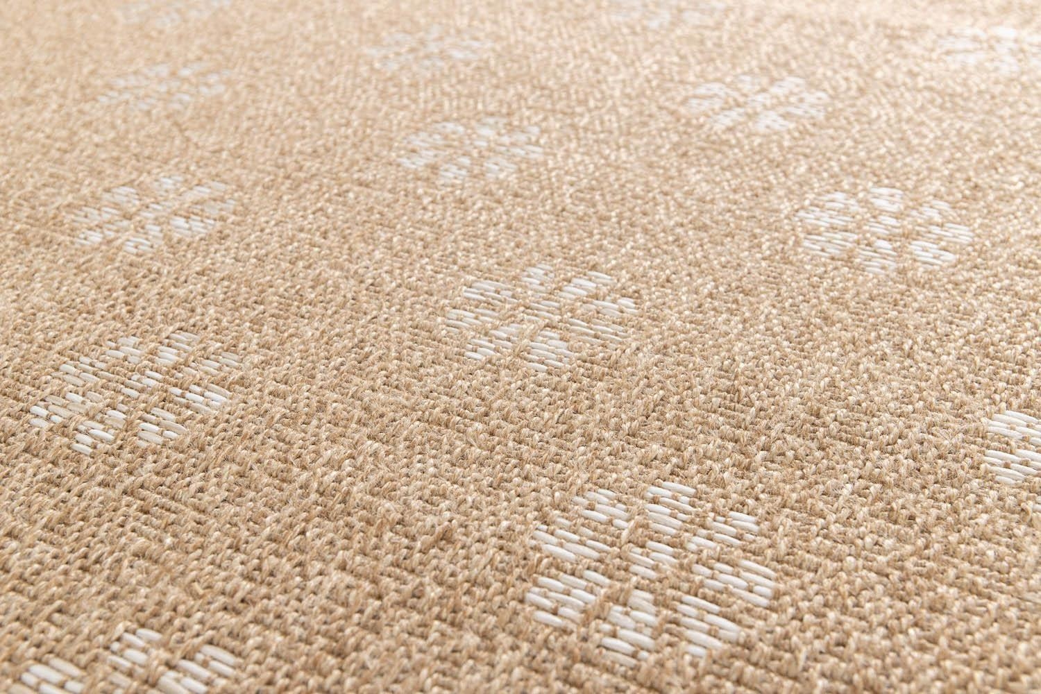Der In- und Outdoorteppich besticht durch seine braune Sisaloptik und weißen Blumenmustern. Mit einer Größe von 80 x 150 cm ist er vielseitig einsetzbar und eignet sich sowohl für den Innen- als auch für den Außenbereich. Das Material aus 100 % Polypropylen macht den maschinengewebten Teppich wasserabweisend, UV-beständig und pflegeleicht. Dank der Handwäsche-Reinigung bleibt der Teppich immer in einem tadellosen Zustand und bringt Eleganz und Funktionalität in jeden Raum.