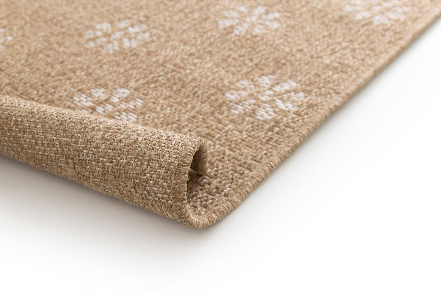 Der In- und Outdoorteppich besticht durch seine braune Sisaloptik und weißen Blumenmustern. Mit einer Größe von 120 x 170 cm ist er vielseitig einsetzbar und eignet sich sowohl für den Innen- als auch für den Außenbereich. Das Material aus 100 % Polypropylen macht den maschinengewebten Teppich wasserabweisend, UV-beständig und pflegeleicht. Dank der Handwäsche-Reinigung bleibt der Teppich immer in einem tadellosen Zustand und bringt Eleganz und Funktionalität in jeden Raum.