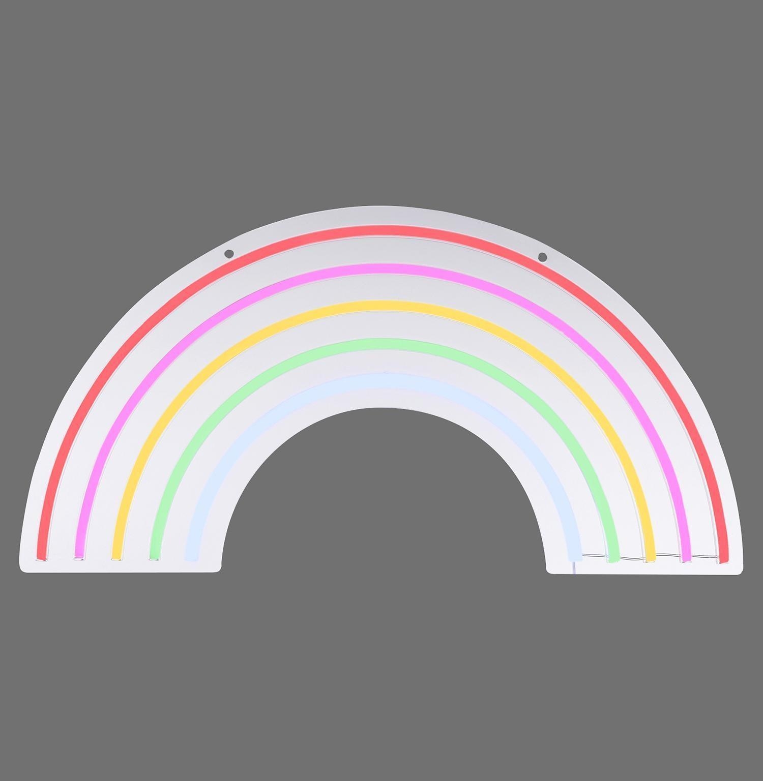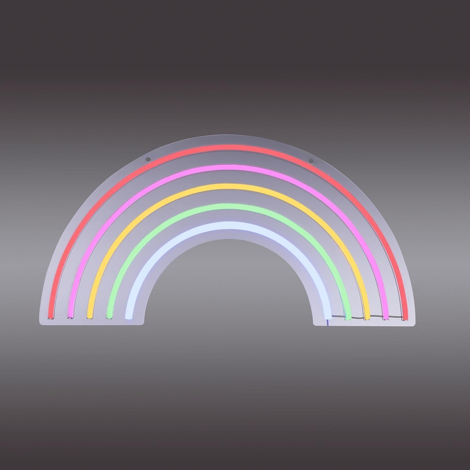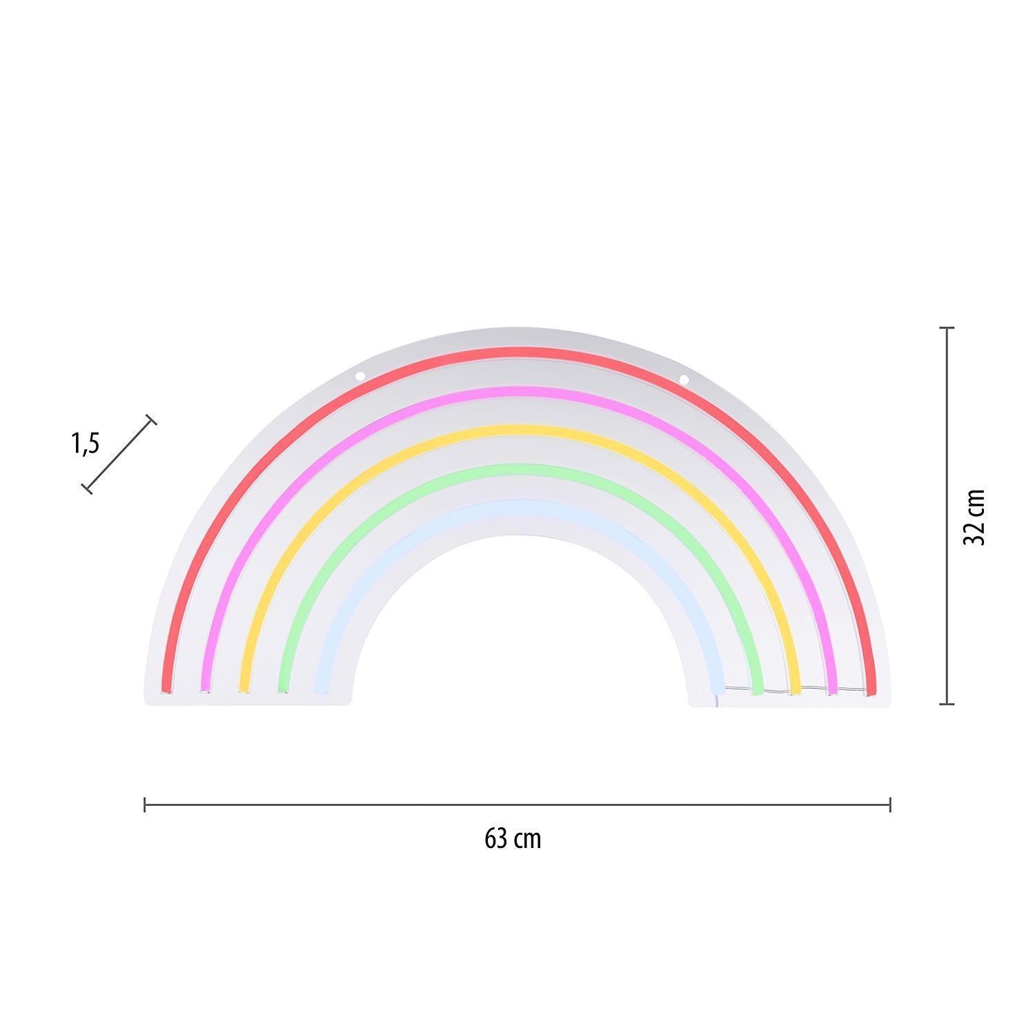 Das LED-Bild NEON-RAINBOW der Marke Just Light. ist aus transparentem Acryl gefertigt und mit einer LED-Neon-Beleuchtung mit Regenbogen-Design versehen. Gesteuert wird die Beleuchtung über einen Schnurschalter, zusätzlich gehört ein USB-Ladekabel zum Lieferumfang. Die Maße des Wandbildes betragen 63 cm in der Breite, 32 cm in der Höhe und 1,5 cm in der Tiefe. Ausgestattet ist das Modell mit einem LED-Leuchtmittel, das eine Leistung von 8,5 Watt und eine Helligkeit von 1 Lumen aufweist. Das Leuchtmittel ist im Lieferumfang enthalten, jedoch nicht austauschbar.