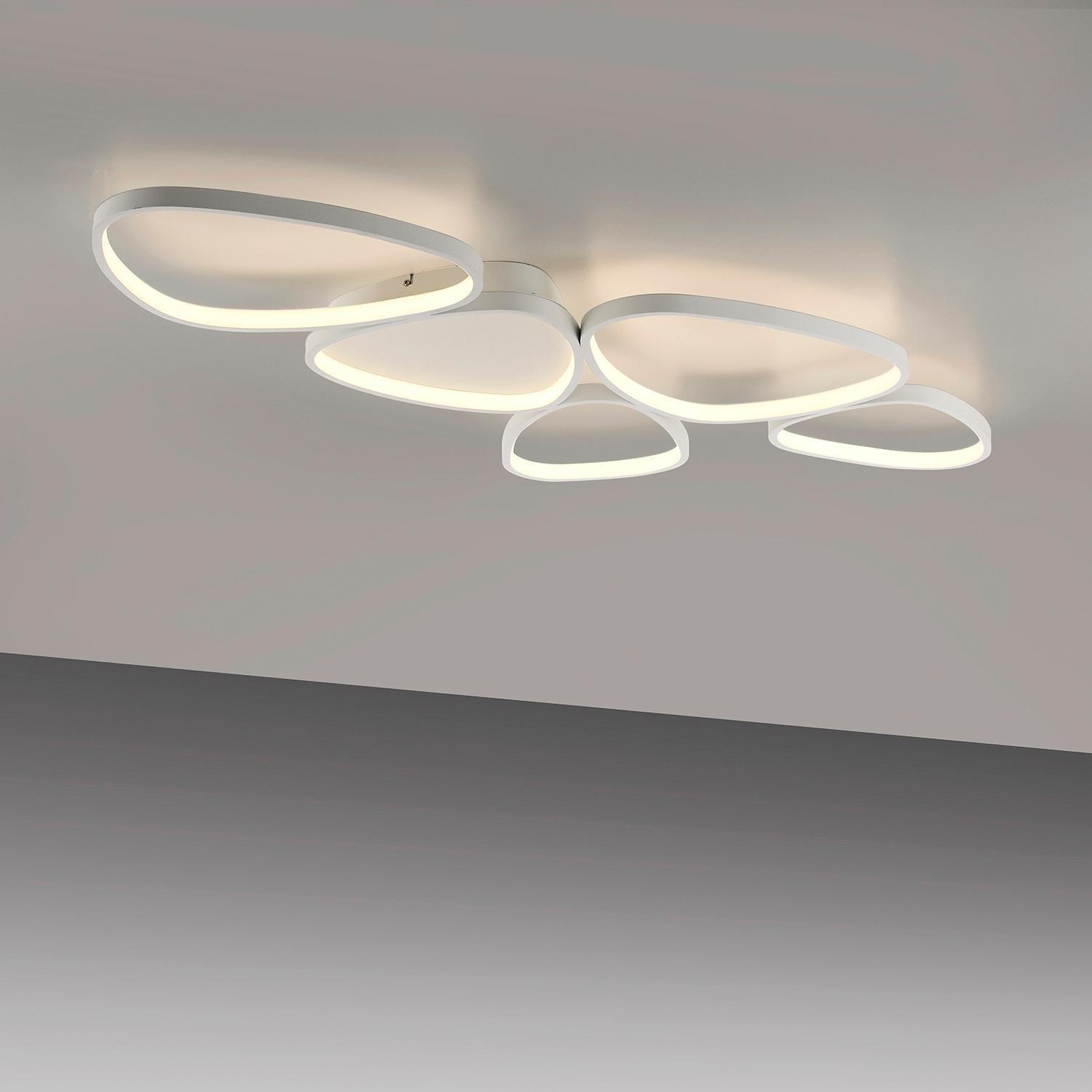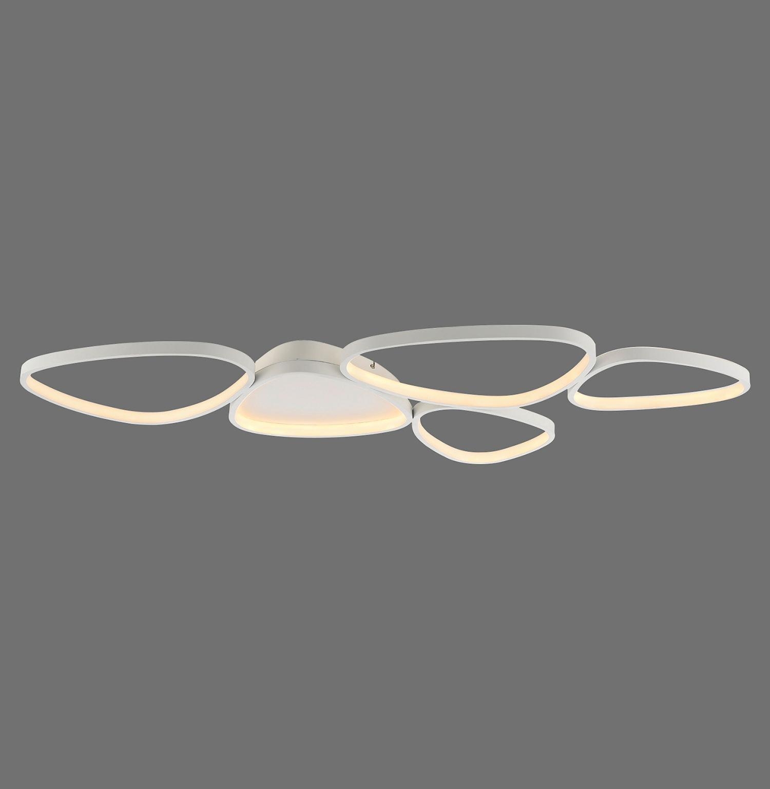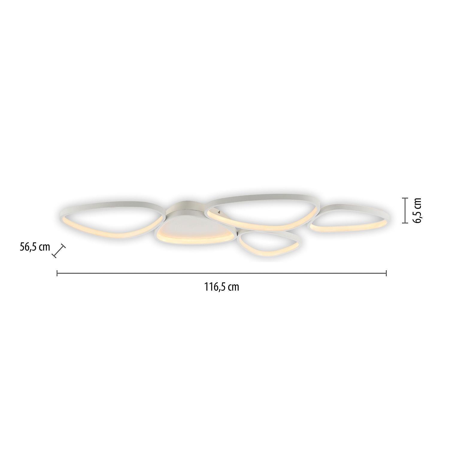 Die LED-Deckenleuchte PEBBLES der Marke Just Light. ist eine moderne und funktionale Beleuchtungslösung. Hergestellt aus weißem Kunststoff, fügt sie sich nahtlos in jedes Raumdesign ein. Diese Deckenleuchte ist 3-stufig dimmbar über einen herkömmlichen Wandschalter und verfügt über eine praktische Memory-Funktion. Mit einer Breite von 116,5 cm, einer Höhe von 6,5 cm und einer Tiefe von 56,5 cm bietet sie eine großflächige Ausleuchtung. Die Lampe enthält ein fest eingebautes LED-Leuchtmittel mit einer Leistung von 42 Watt, einer Farbtemperatur von 3000 Kelvin und einer Helligkeit von 6100 Lumen, das nicht ausgetauscht werden kann.
