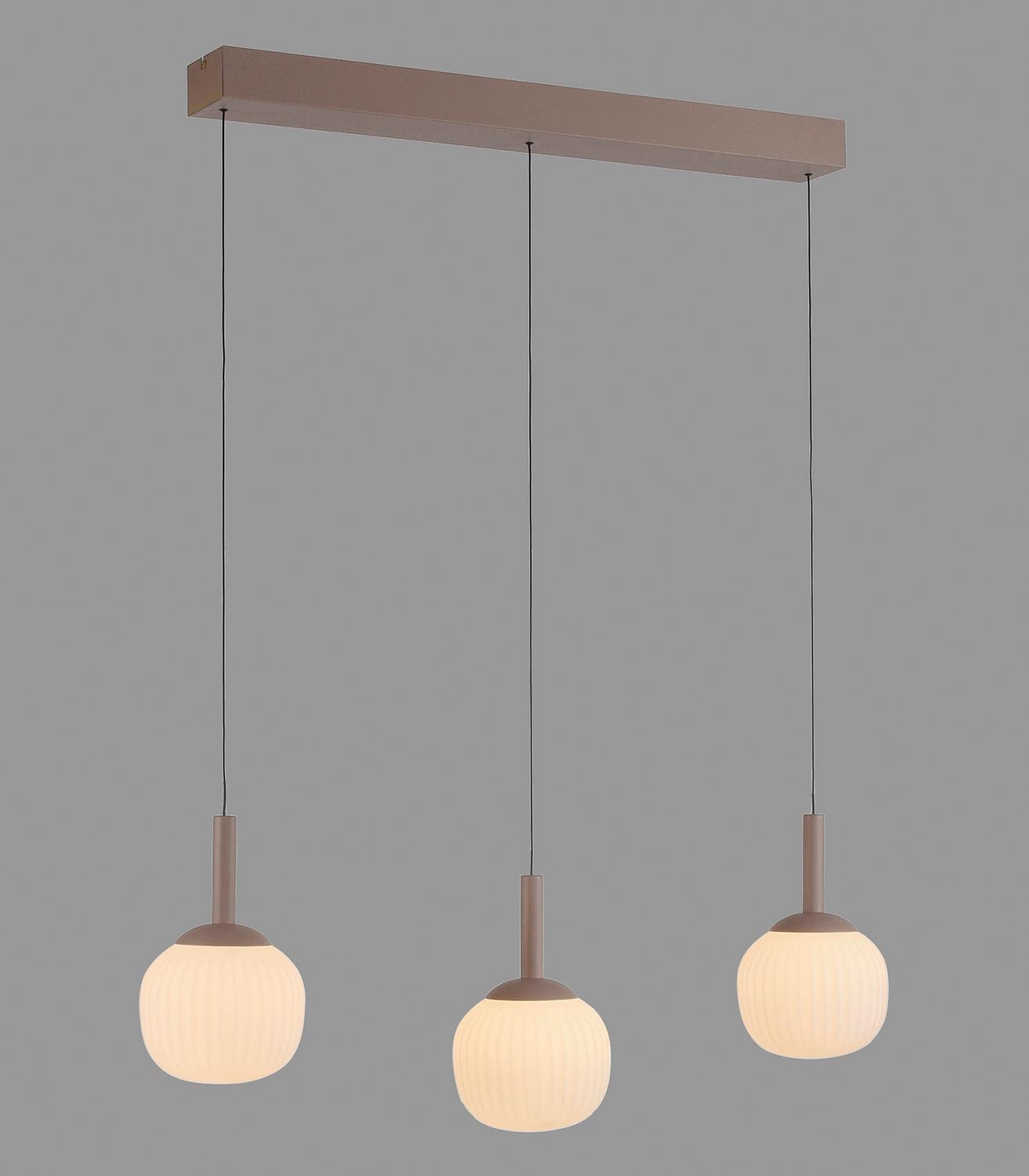 Die LED-Pendelleuchte NAMI der Marke Just Light. besteht aus Metall in Sandbraun und ist mit drei Lampenschirmen aus Glas ausgestattet. Sie hat eine Breite von 81 cm, eine Tiefe von 15 cm und erreicht eine Höhe von 200 cm. Die Leuchte ist mit drei fest verbauten LED-Leuchtmitteln versehen, die im Lieferumfang enthalten sind und nicht ausgetauscht werden können. Die Leistung beträgt 15 Watt, die Farbtemperatur liegt bei 3000 Kelvin und der Lichtstrom bei 1800 Lumen.