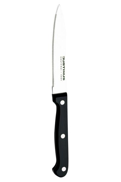 Das Tomatenmesser KÜCHENCHEF der Marke JUSTINUS ist speziell zum Schneiden von Tomaten entwickelt. Es hat einen ergonomischen Griff aus Bakelit, der durch Nieten befestigt ist, und eine Klinge aus rostfreiem Edelstahl mit einer Länge von 11 cm. Mit einer Gesamtlänge von 21,8 cm, einer Breite von 1,9 cm und einer Höhe von 1,1 cm ist das Messer ideal für präzise Schnitte und ist spülmaschinengeeignet für eine einfache Reinigung.