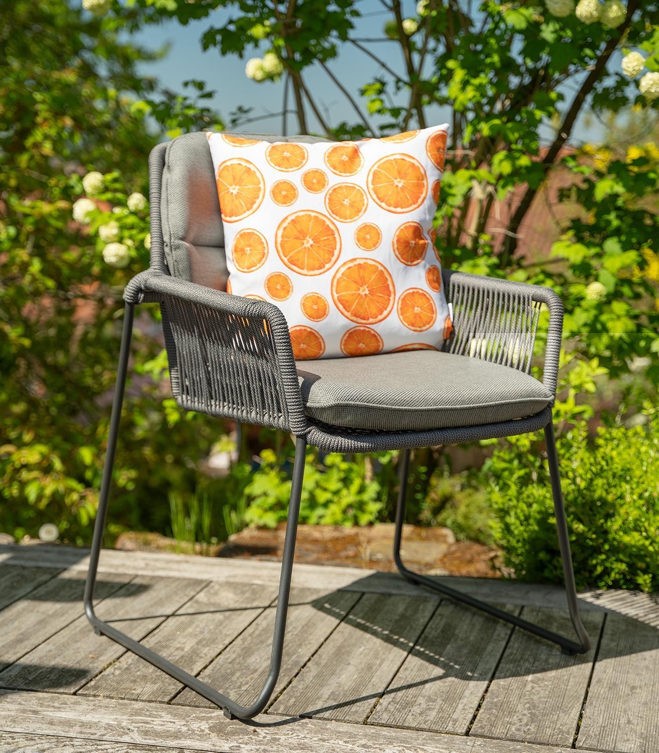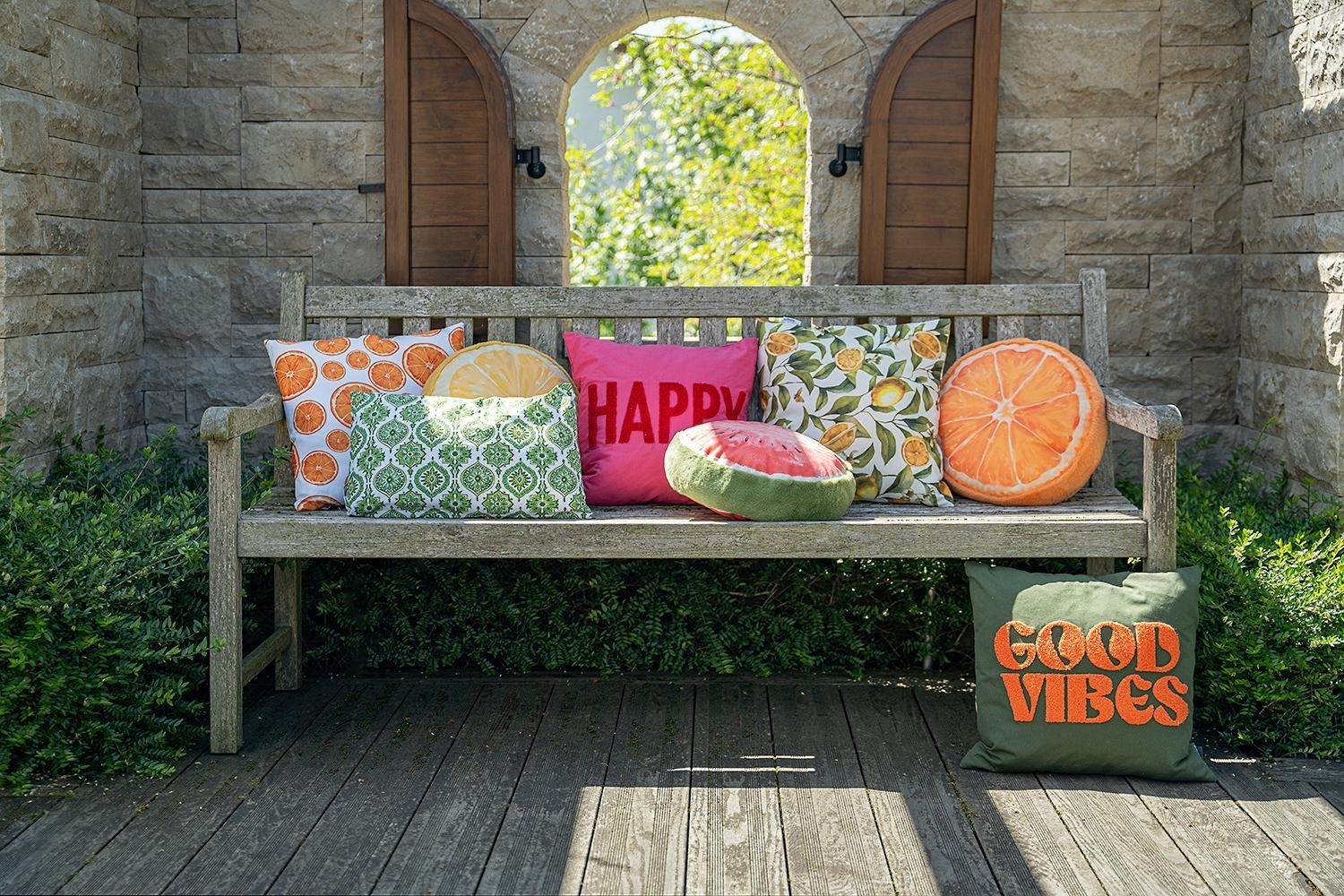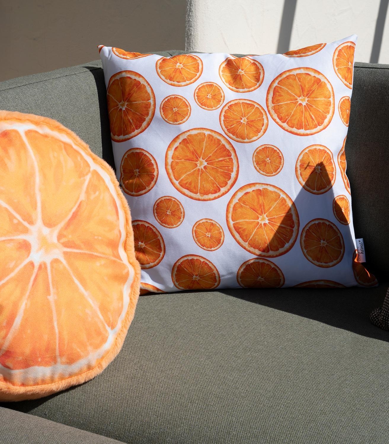 Das Kissen ORANGY bringt frischen Schwung in Ihren Innen- und Außenbereich. Der Polyesterbezug in leuchtendem Orange und Weiß ist mit fröhlichen Orangenmotiven gestaltet. Mit einer Größe von 45 x 45 cm und einer weichen Füllung bietet es optimalen Komfort. Dank des praktischen Reißverschlusses ist der Bezug abnehmbar und kann bei 30 °C gewaschen werden, was die Pflege besonders einfach macht.