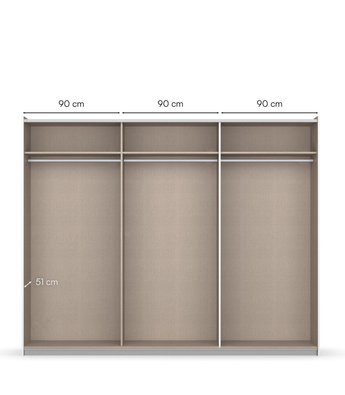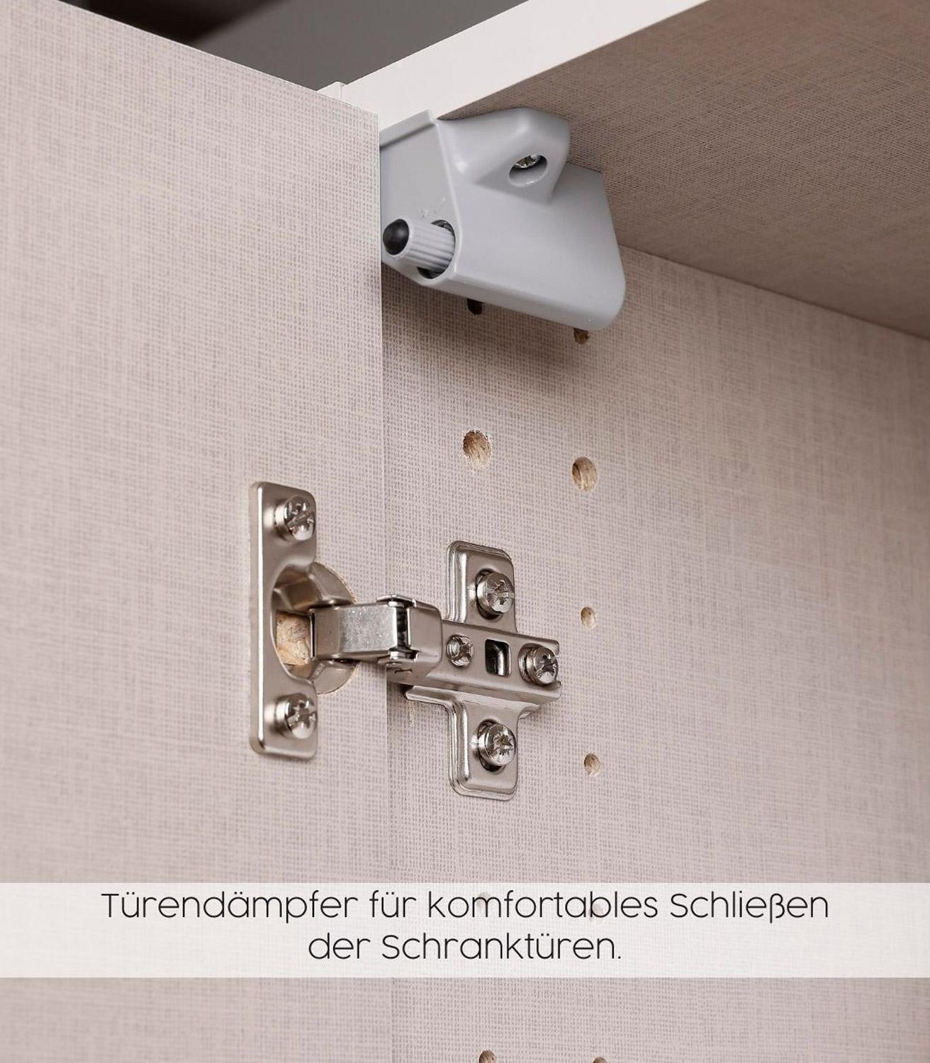Dieser Kleiderschrank hat im Inneren ein Dekor in grauer Leinenoptik. Zu einigen Kleiderschränken bieten wir Zubehör wie Schubkästeneinsätze, Wäscheeinteilungen, zusätzliche Fachböden und Türdämpfer an.