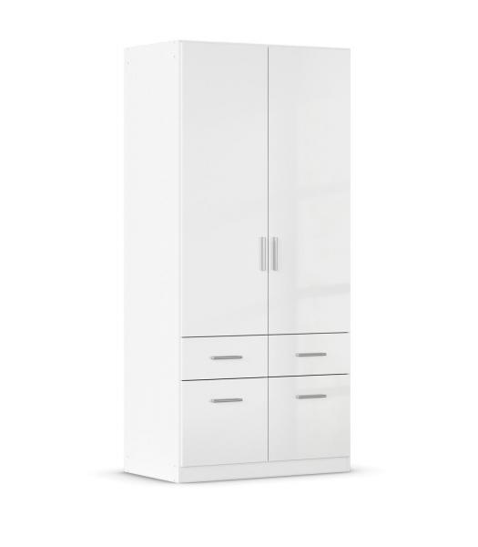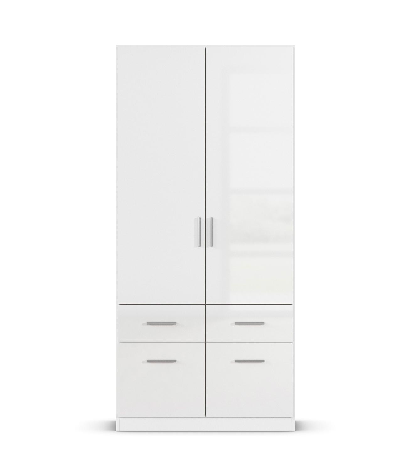 Kompakter Drehtürenschrank Wenn Sie wenig Platz für einen Kleiderschrank zur Verfügung haben ist der Kleiderschrank mit seinen kompakten Maßen genau die richtige Wahl für Sie. Oder Sie haben bereits einen Schrank und benötigen mehr Stauraum für Ihre Hosen, Jacken, Oberteile und Kleider. Egal warum, der Drehtürenschrank in mattem weiß hilft Ihnen Ihre Platznot zu lösen. Mit zwei großen Türen und insgesamt vier Schubladen, zwei große unten und zwei große darüber, haben Sie verschiedene Möglichkeiten Ihr Ordnungssystem aufzubauen. Im Inneren im großen Fach wird eine Kleiderstange mitgeliefert. Drehtürenschrank in Weiß Der Kleiderschrank misst in der Breite nur 91 cm. So ergänzen Sie beispielsweise Ihren Schrank um zusätzlichen Raum für Bettwäsche, Handtücher oder Winteraccessoires. Auch eignet sich der Drehtürenschrank um im Kinderzimmer für die Kleidung der Kleinen verwendet zu werden. Die Oberfläche ist matt Weiß mit schlichten silberfarbenen Griffen an den Türen und Schubladen.