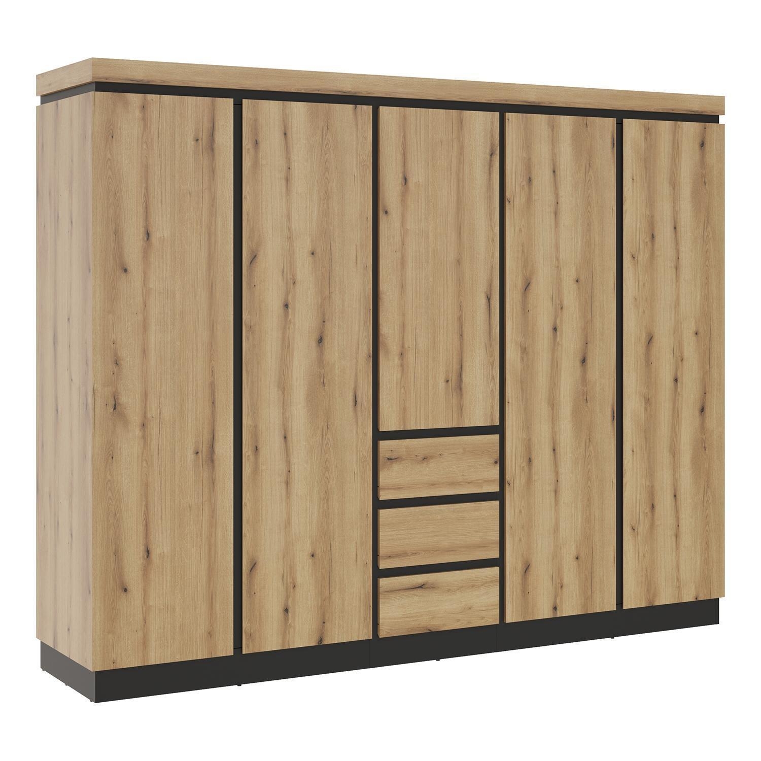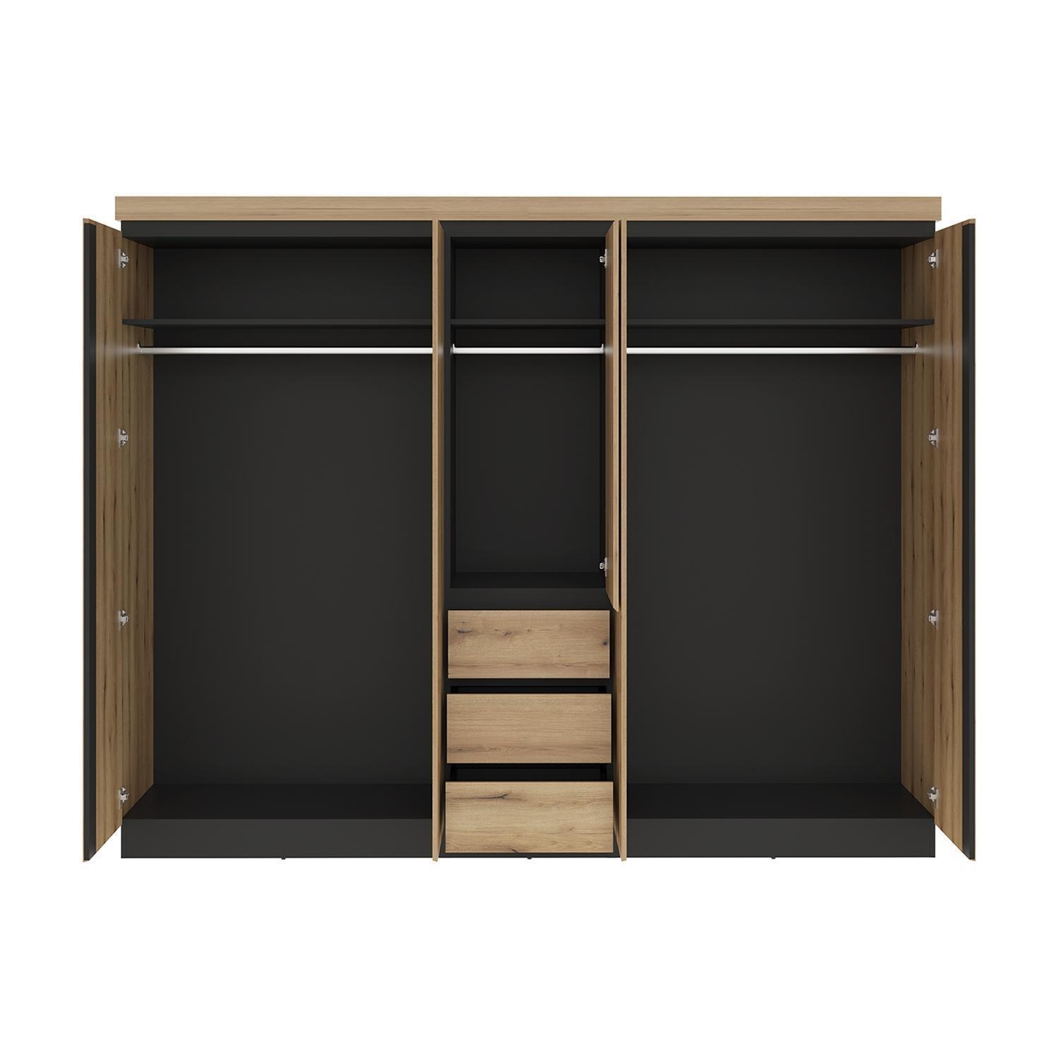 | Lieferumfang: | 1 Kleiderschrank mit 5 Türen, 3 Schubladen, 3 Kleiderstangen und 3 Einlegeböden |