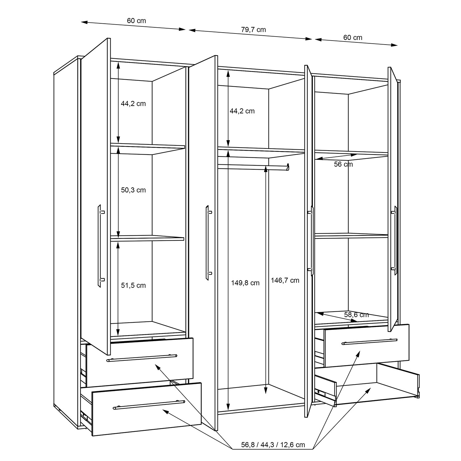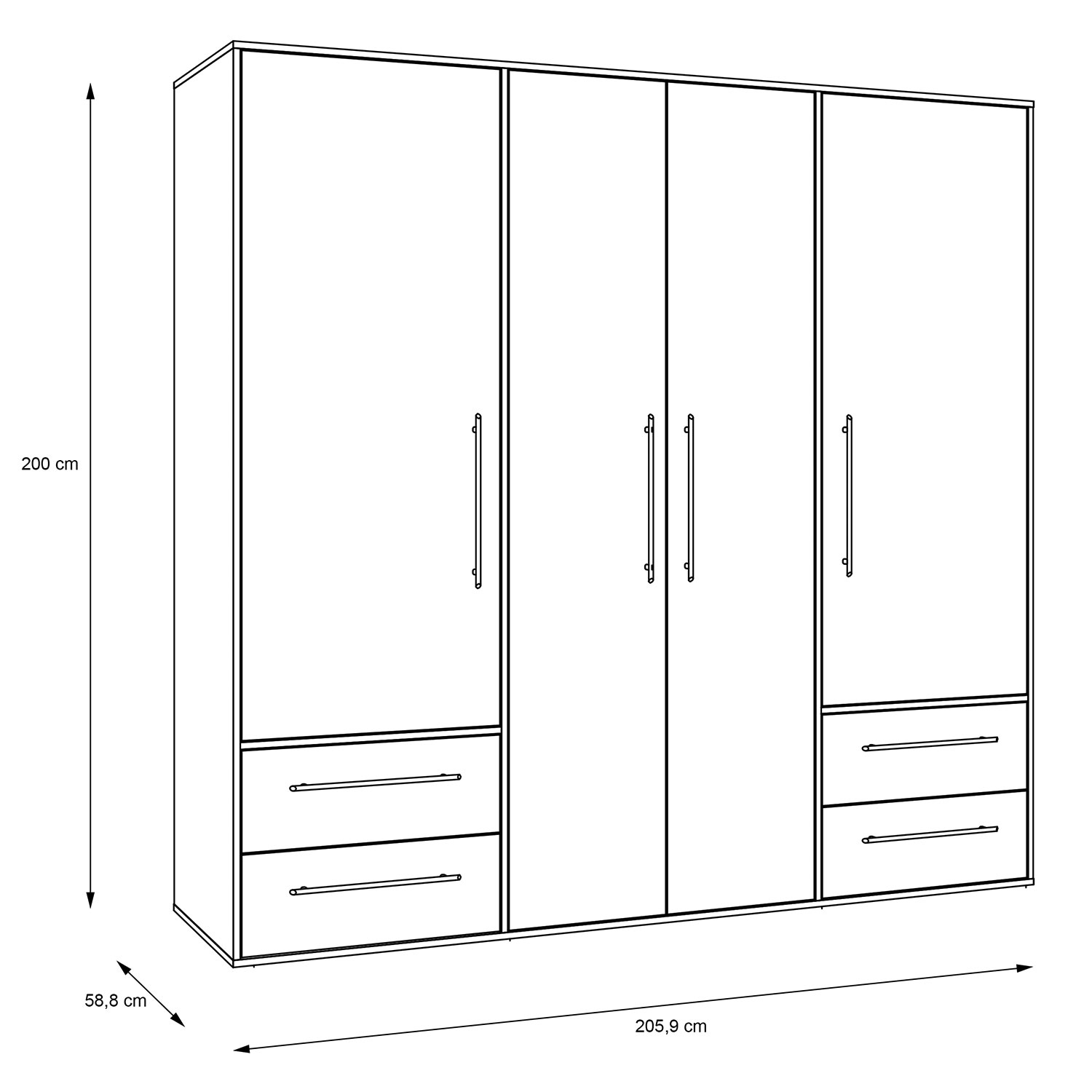 | Lieferumfang: | 1 Kleiderschrank mit 4 Türen, 4 Schubladen, 1 Kleiderstange und 5 Einlegeböden |