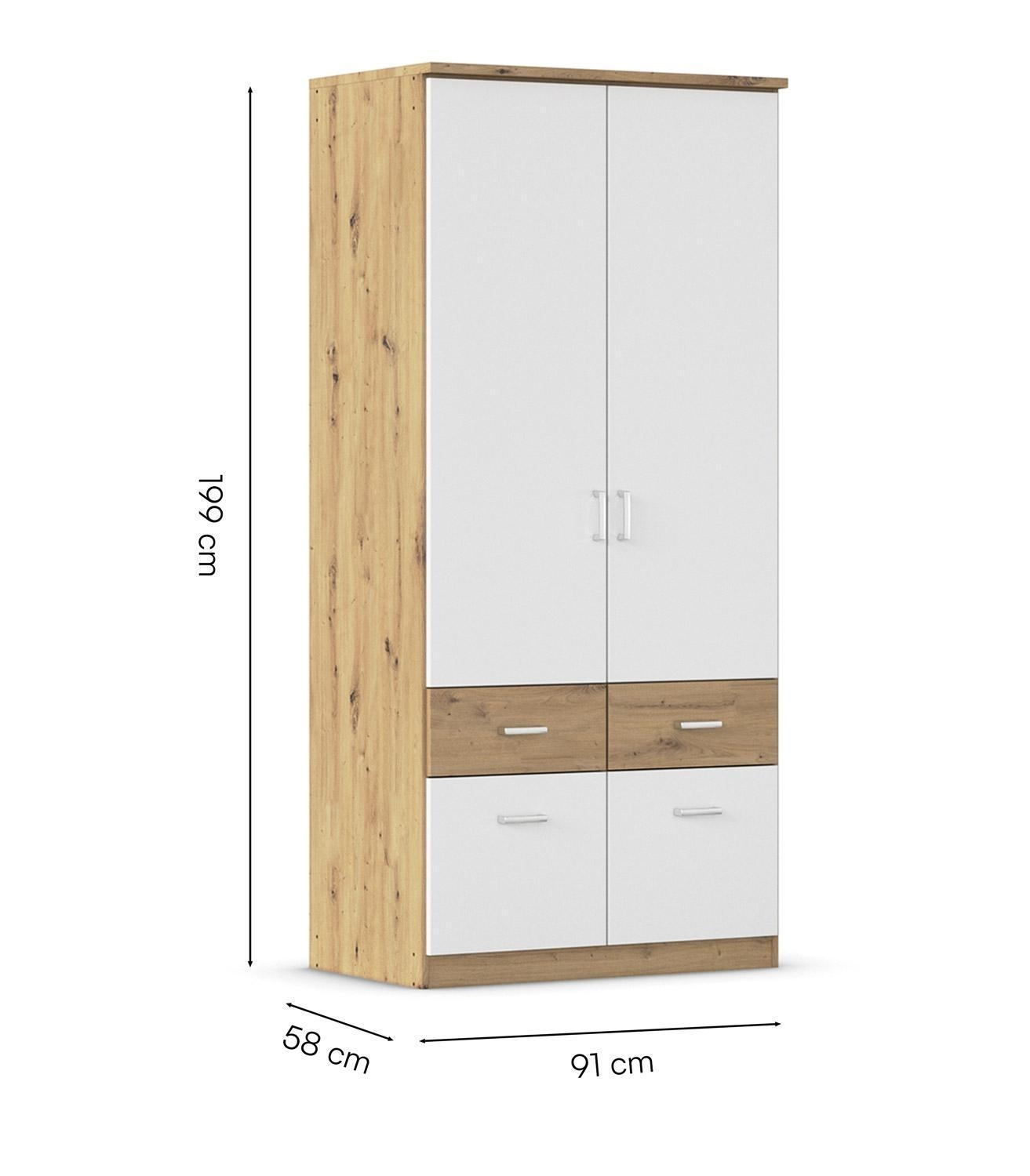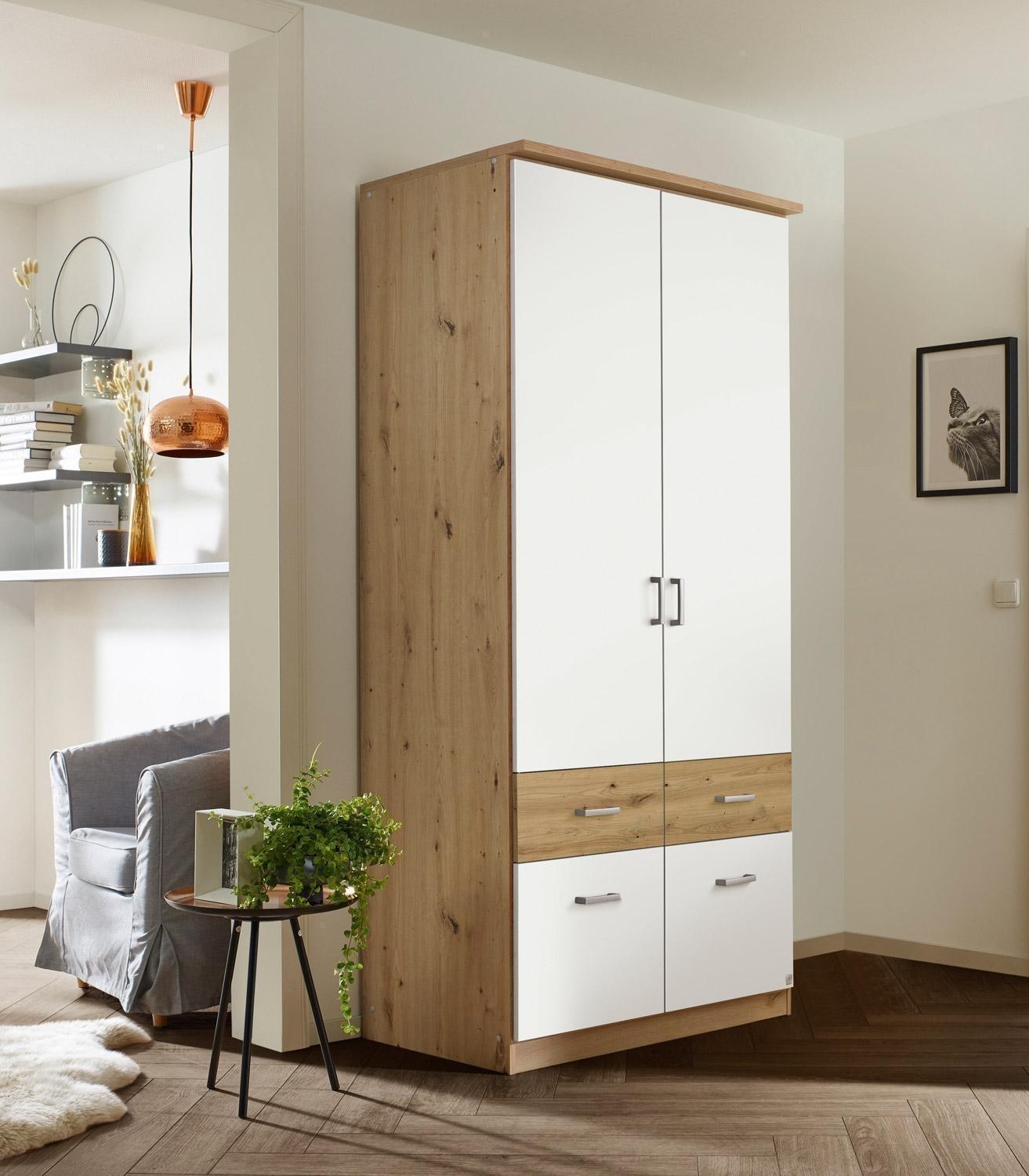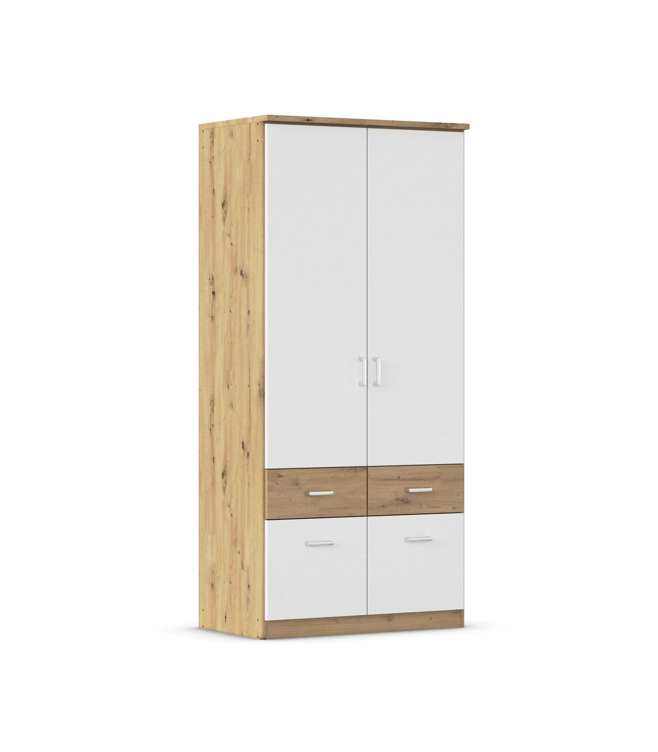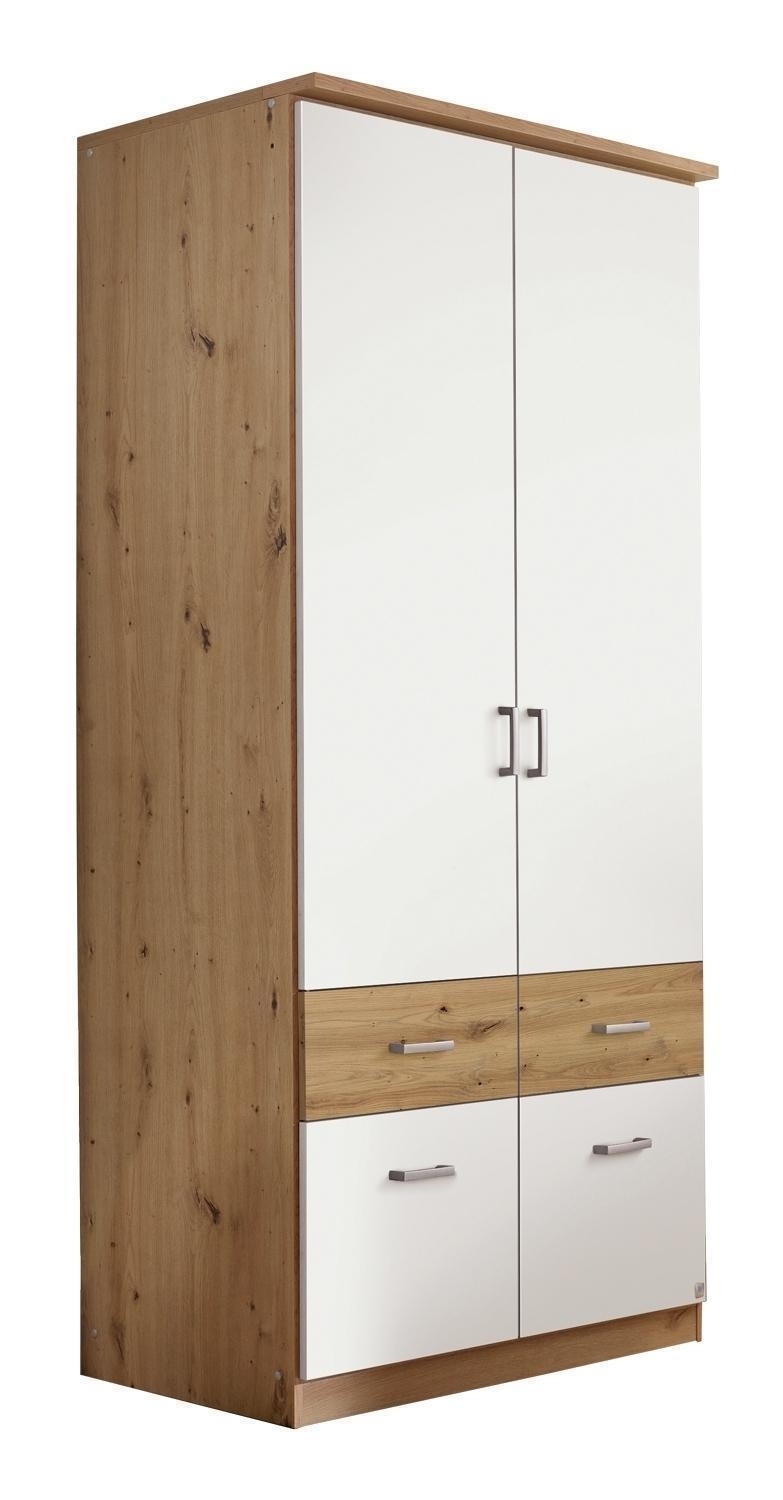 | Lieferumfang: | 1 Kleiderschrank mit Kranzleiste, 2 Türen, 4 Schubladen, 1 Kleiderstange und 2 Einlegeböden |