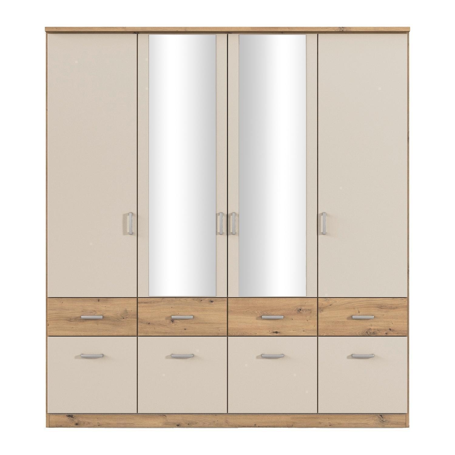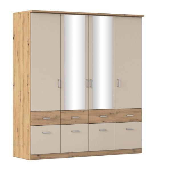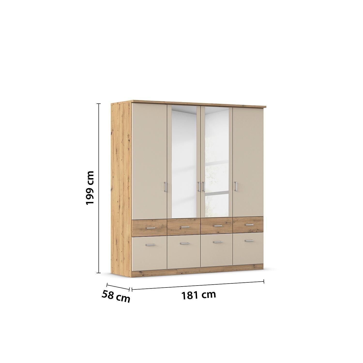 Der Kleiderschrank RÜDIGER ist in einem Artisan Eiche Dekor gehalten. Die Front ist champagnerfarben gestaltet und mit Absetzungen in Artisan Eiche Dekor versehen. Der Schrank ist mit zwei Spiegeltüren, zwei weiteren Türen sowie acht Schubladen ausgestattet. Im Innenraum befindet sich eine Kleiderstange und sechs Einlegeböden. Die Maße des Schranks betragen 181 cm in der Breite, 199 cm in der Höhe und 56 cm in der Tiefe.