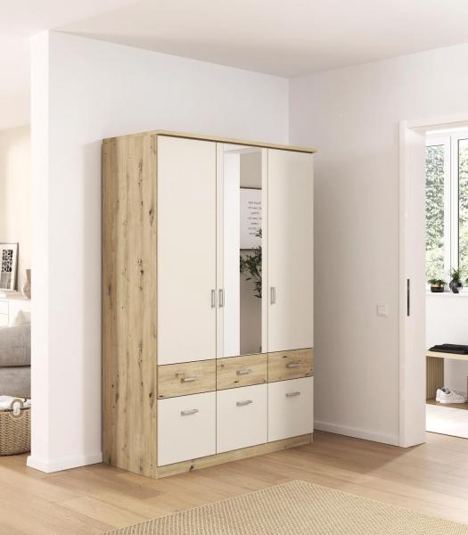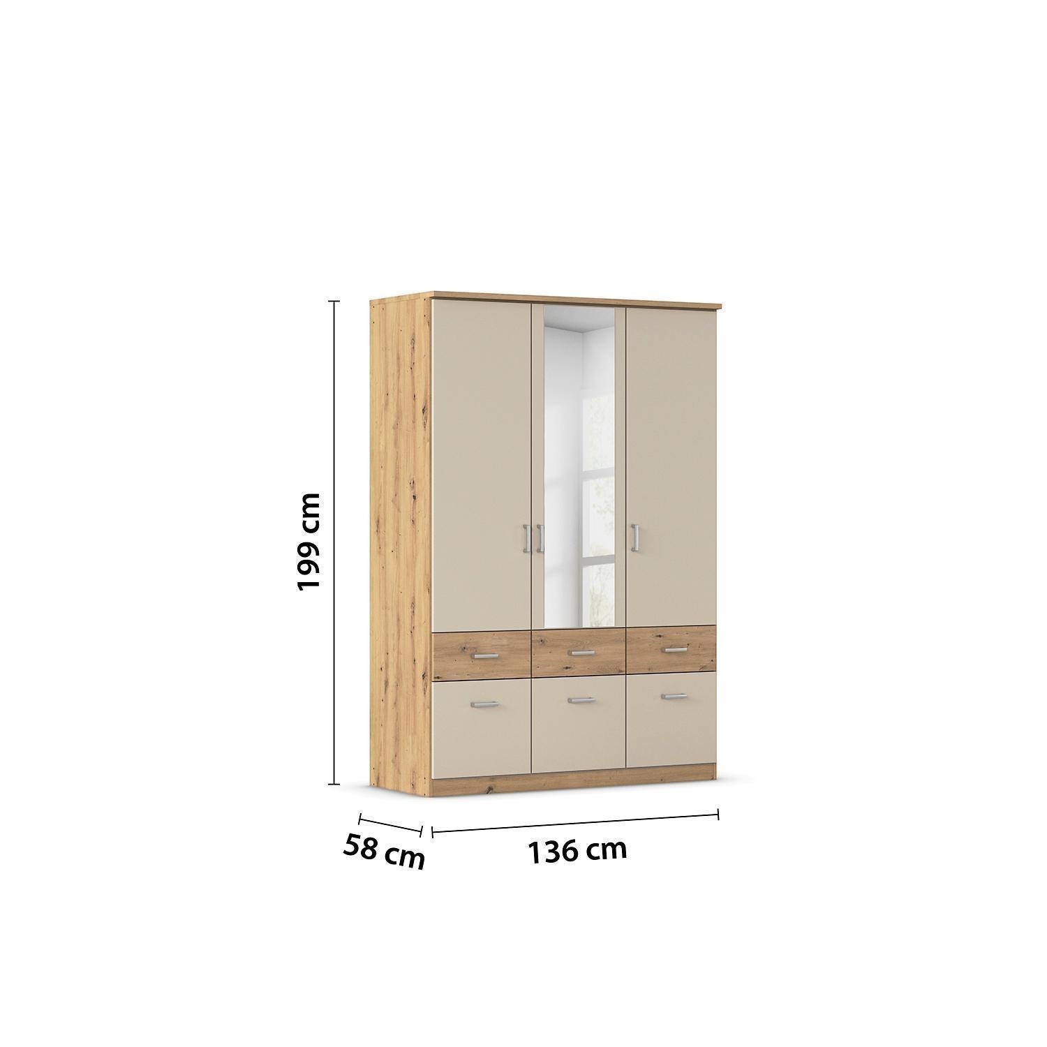 Der Kleiderschrank RÜDIGER ist in einem Artisan Eiche Dekor gehalten. Die Front ist champagnerfarben gestaltet und mit Absetzungen in Artisan Eiche Dekor versehen. Der Schrank ist mit einer Spiegeltür, zwei weiteren Türen sowie sechs Schubladen ausgestattet. Im Innenraum befinden sich zwei Kleiderstangen und drei Einlegeböden. Die Maße des Schranks betragen 136 cm in der Breite, 199 cm in der Höhe und 56 cm in der Tiefe.