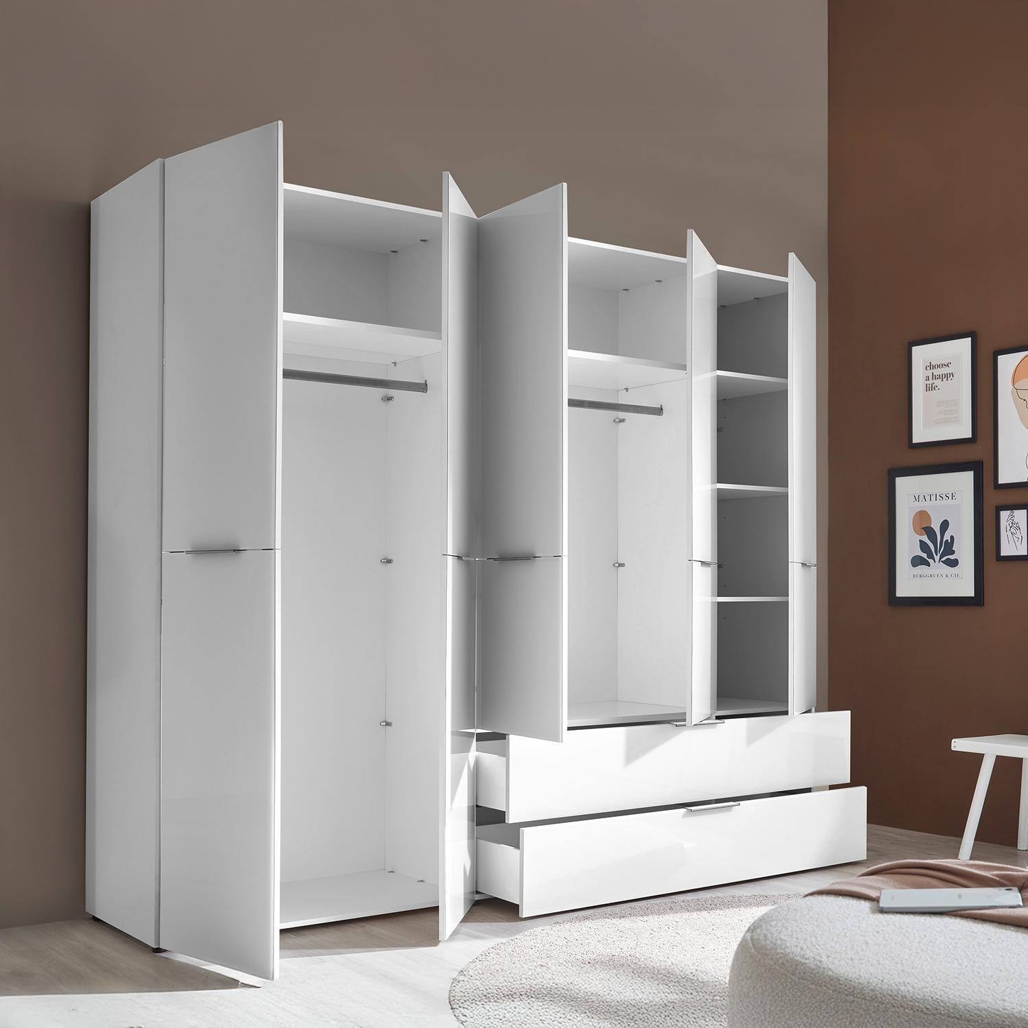 Der Kleiderschrank SAKURA ist in Weiß matt gehalten und verfügt über Fronten aus Weißglas. Der Drehtürenschrank verfügt über fünf Türen und zwei Schubladen. Im Inneren sorgt der Drehtürenschrank über zwei Kleiderstangen und fünf Einlegeböden für die Aufbewahrung und Ordnung Ihrer Klamotten. Die Breite beträgt 250 cm, die Höhe 212 cm und die Tiefe 57 cm.