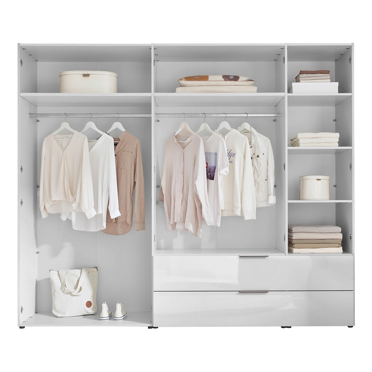 Dieser Kleiderschrank hat im Inneren ein Dekor in Leinenoptik in der Farbe Weiß. Zu einigen Kleiderschränken bieten wir Zubehör wie Schubkästeneinsätze, Wäscheeinteilungen, zusätzliche Fachböden und Türdämpfer an.