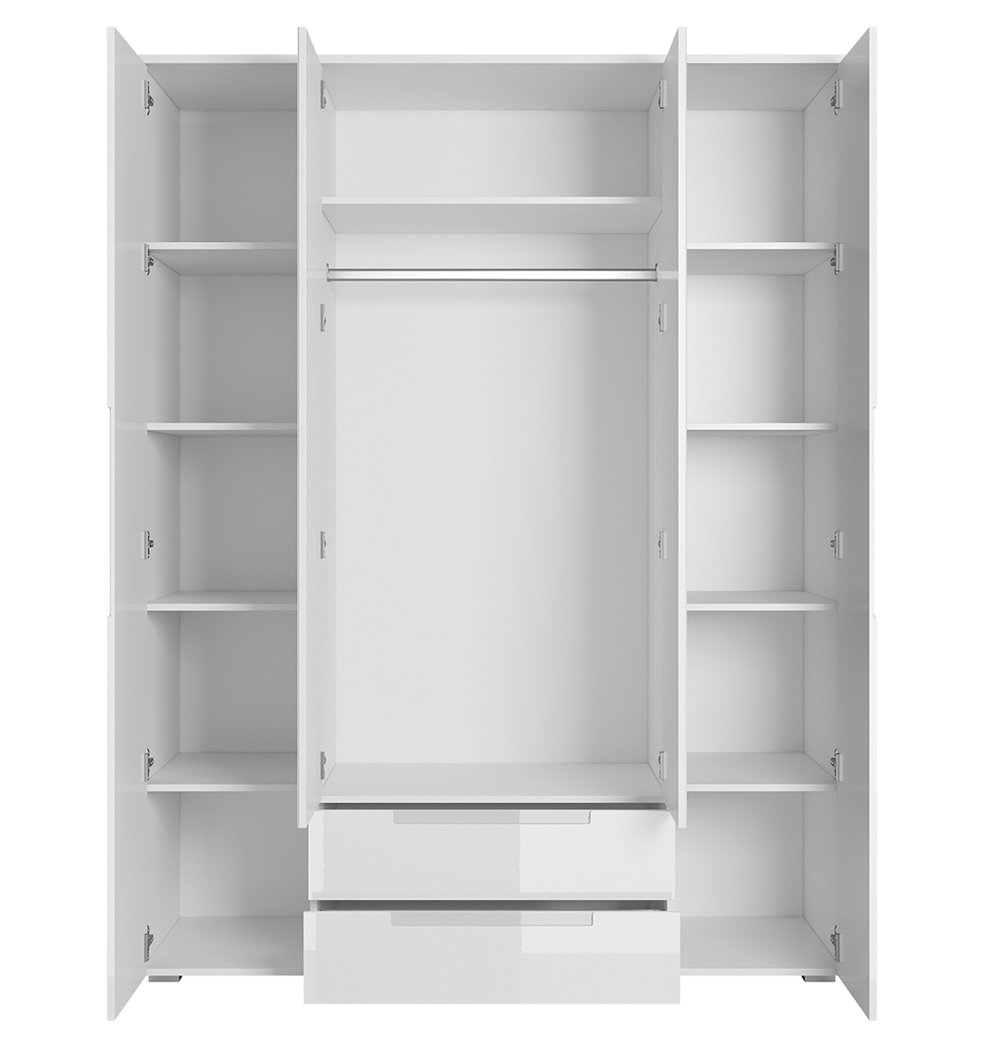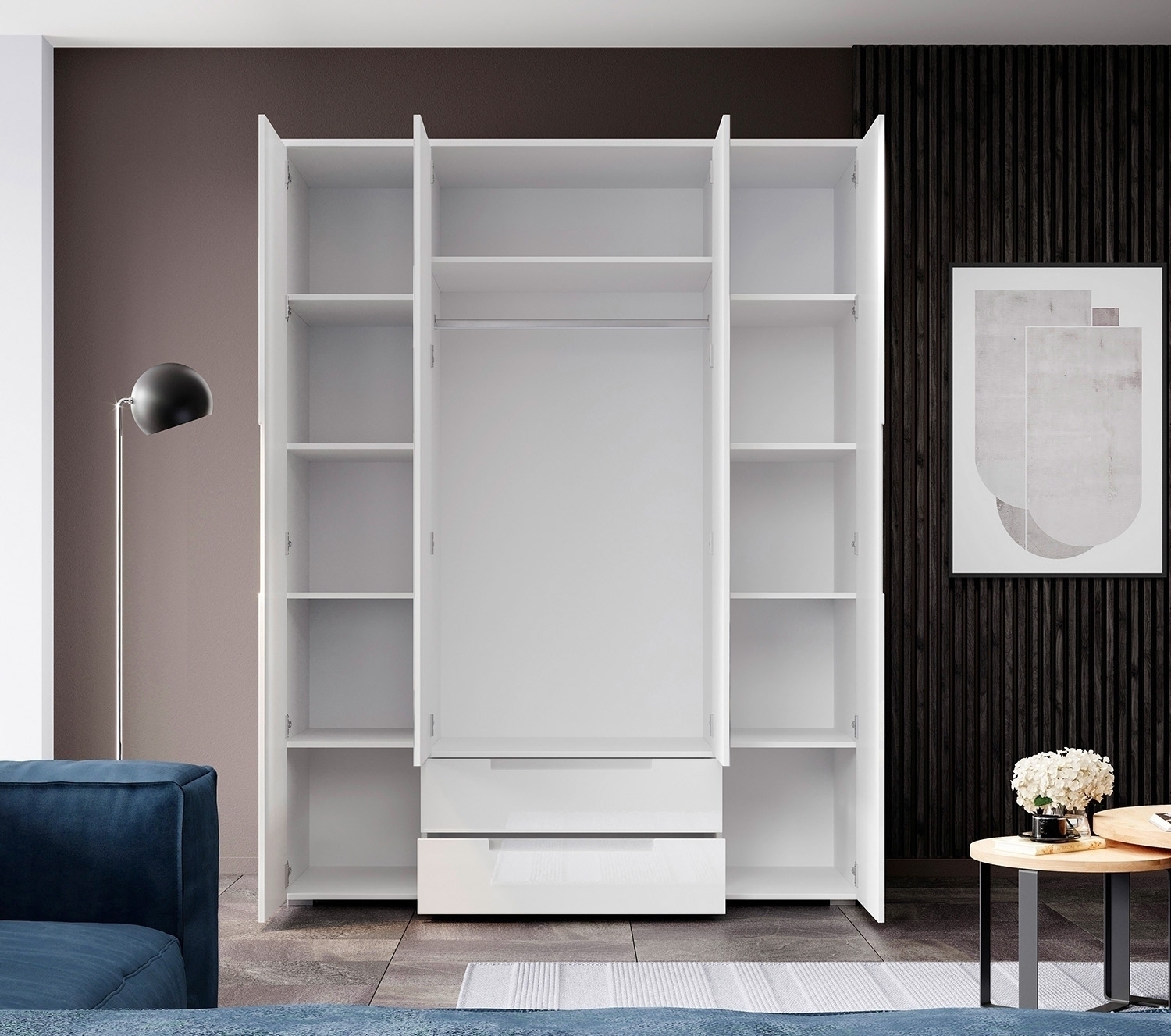 Dieser Kleiderschrank hat im Inneren die Farbe weiß. Zu einigen Kleiderschränken bieten wir Zubehör wie Schubkästeneinsätze, Wäscheeinteilungen und zusätzliche Fachböden an.