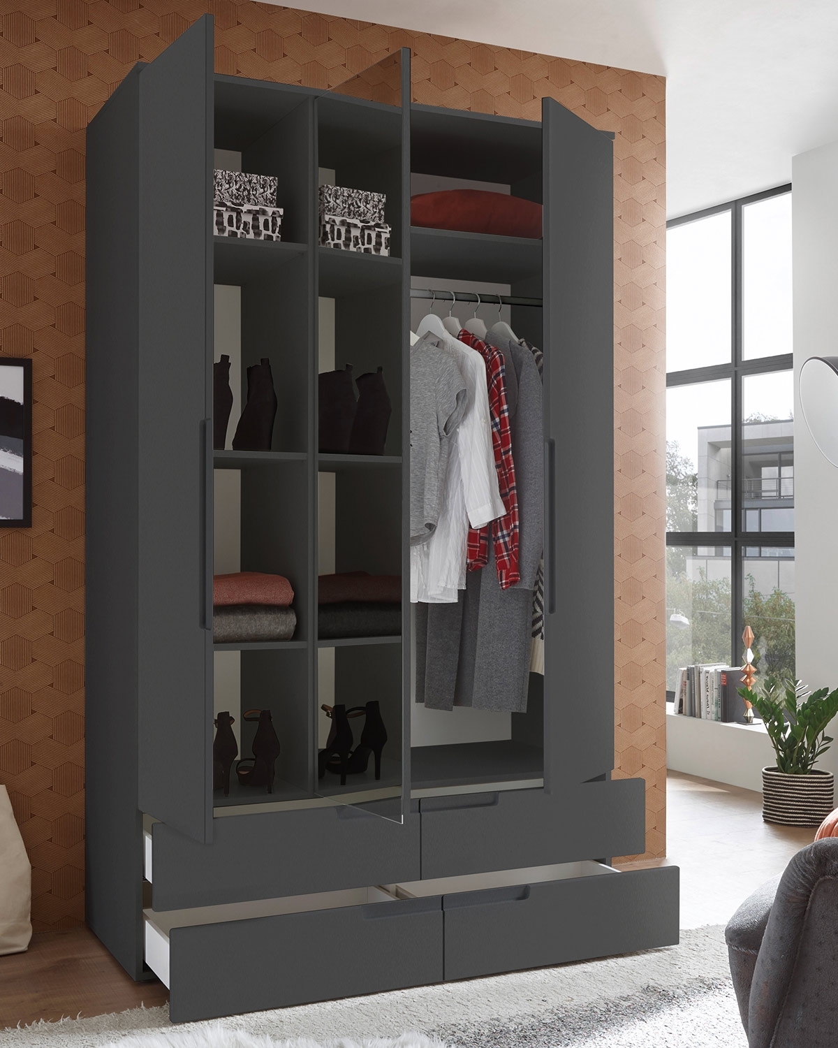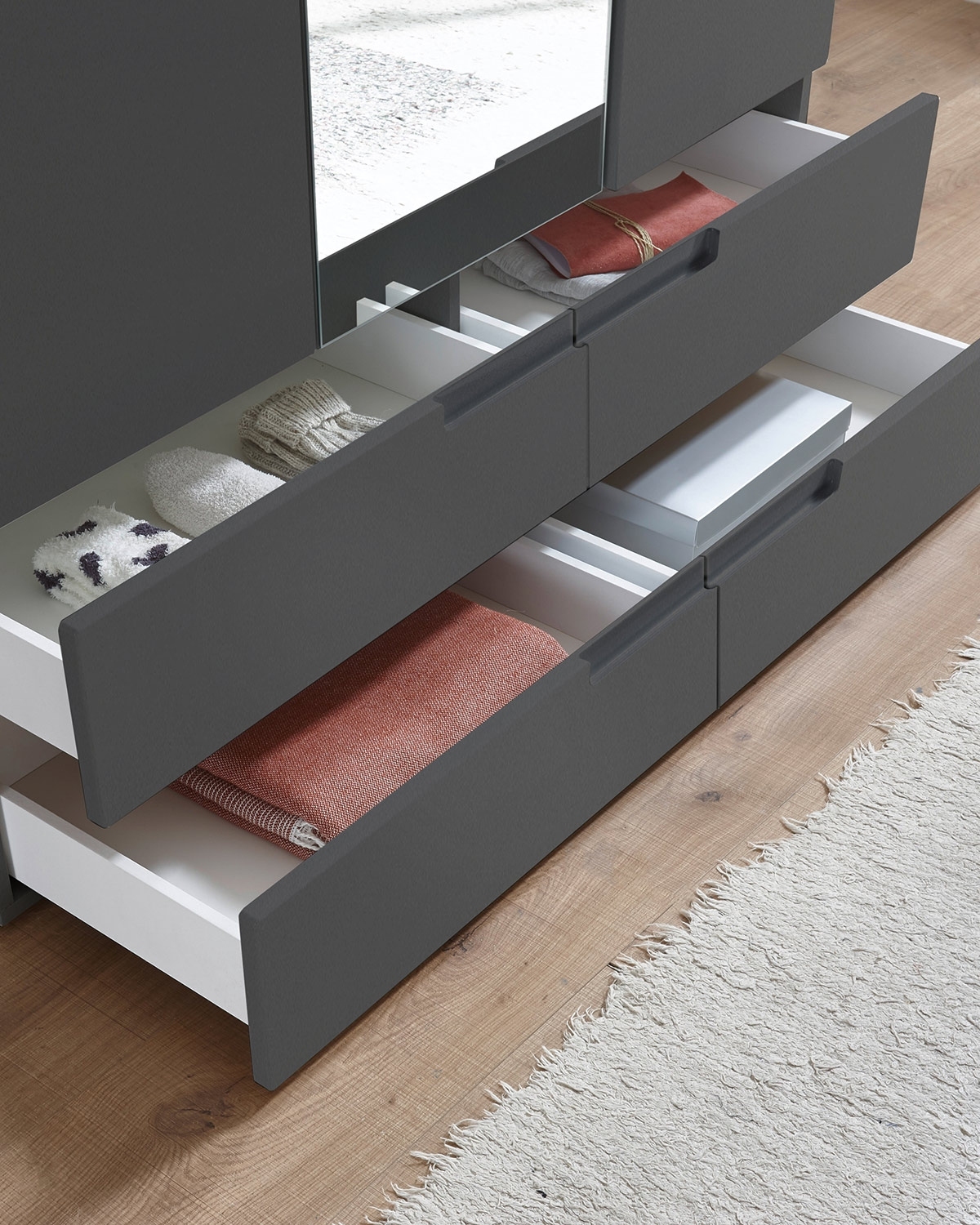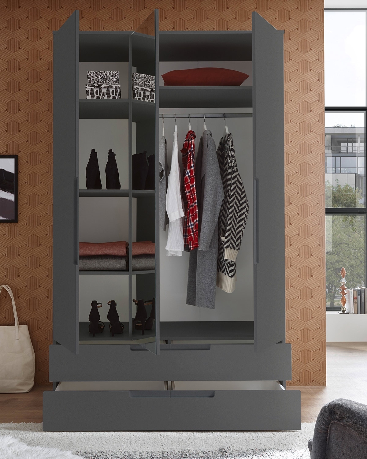 Dieser Kleiderschrank hat im Inneren die Farbe grau und weiß. Zu einigen Kleiderschränken bieten wir Zubehör wie Schubkästeneinsätze, Wäscheeinteilungen und zusätzliche Fachböden an.