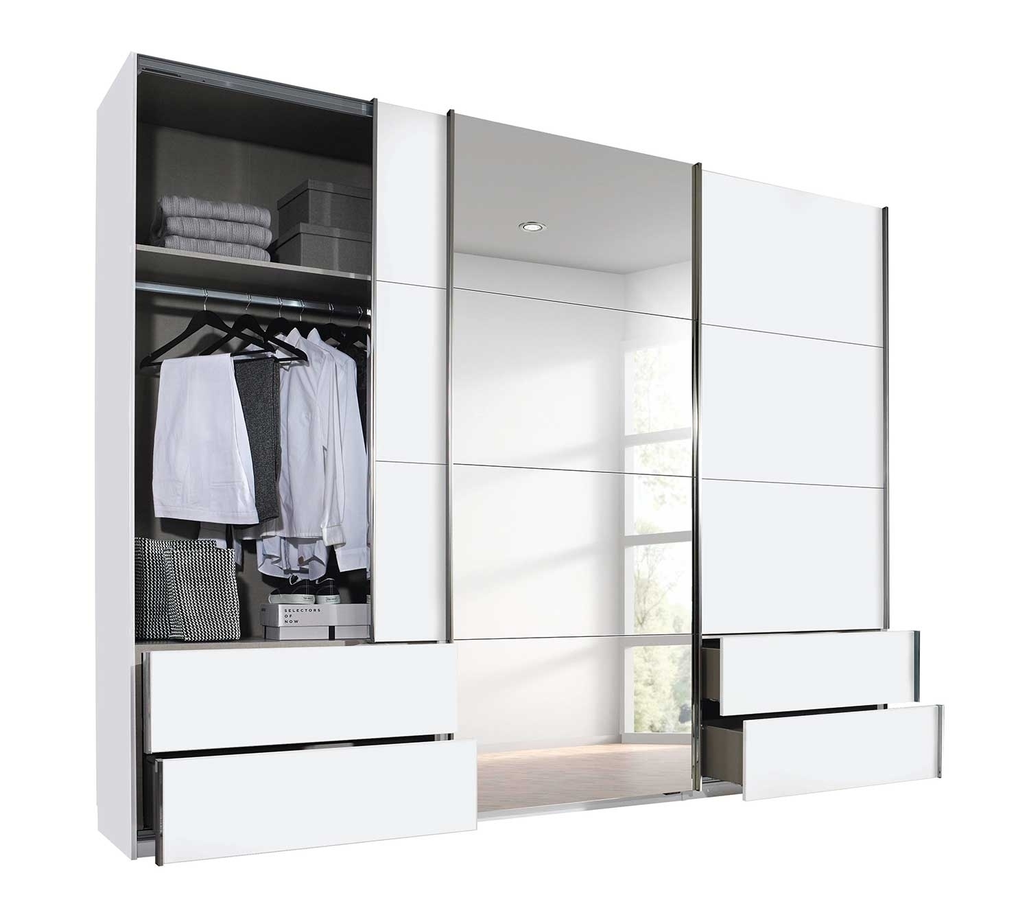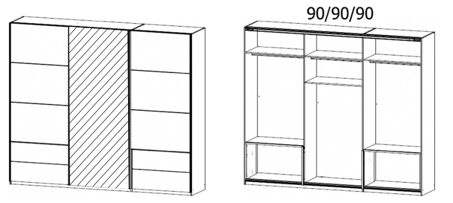 | Lieferumfang: | 1 Schwebetürenschrank mit 2 Türen, 1 Spiegeltür, 3 Kleiderstangen, 4 Einlegeböden und 4 Schubladen |