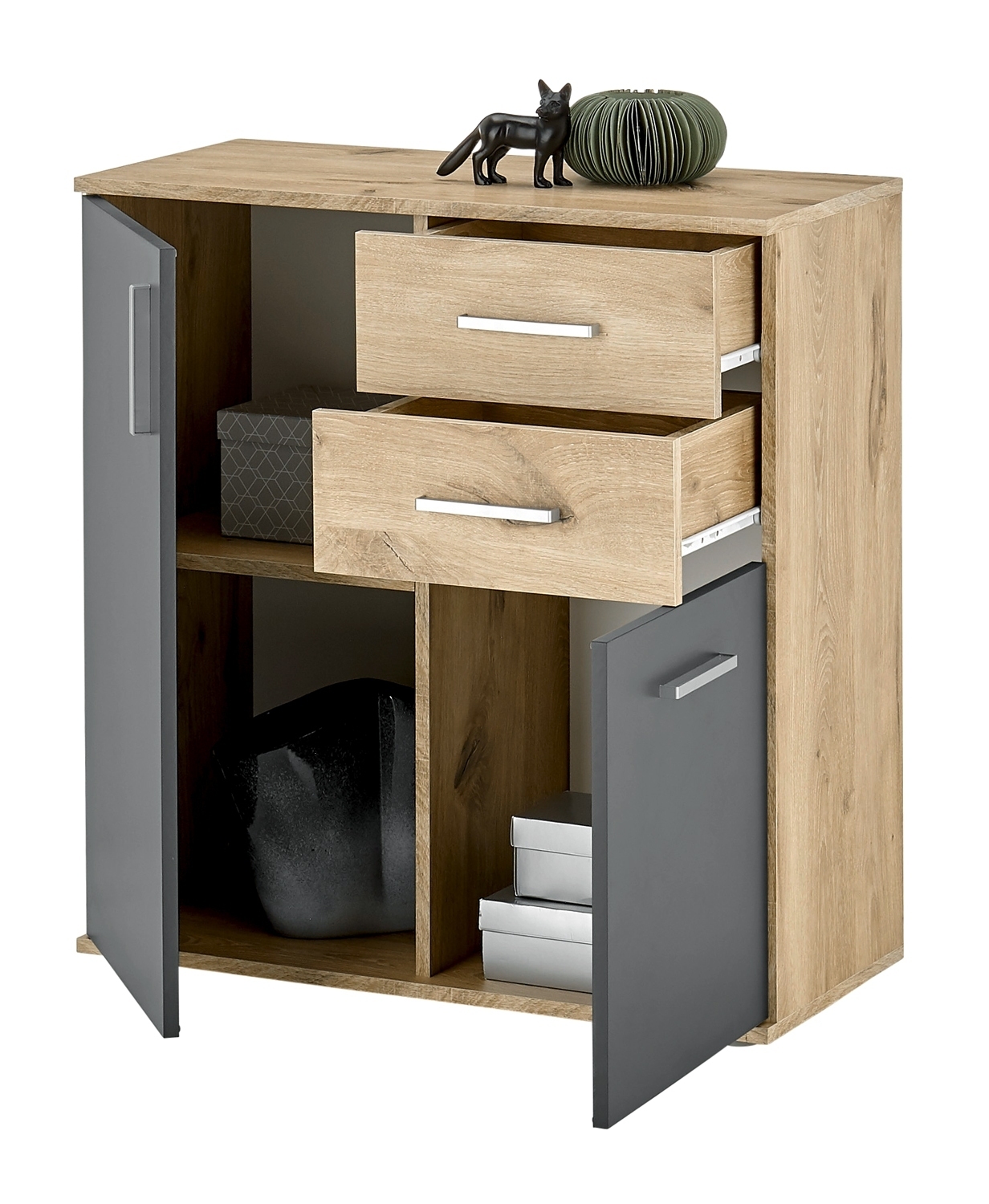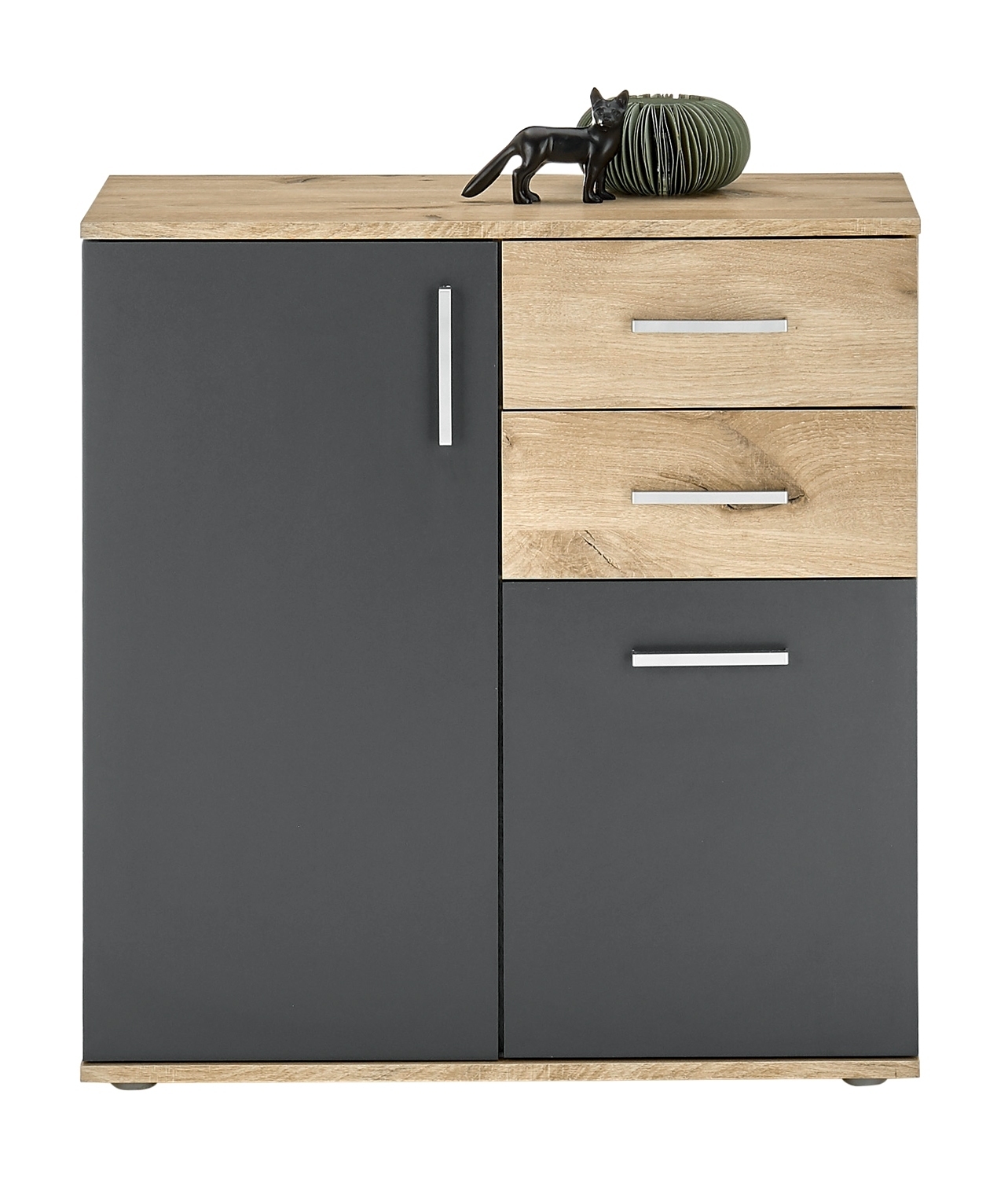 Die Kommode in zeitlosem Braun-Grau bietet mit 2 Türen, 1 Einlegeboden und 2 Schubladen optimalen Stauraum. Mit einer Breite von 80 cm, einer Höhe von 84 cm und einer Tiefe von 35 cm passt sie perfekt in verschiedene Wohnbereiche. Hergestellt aus Holzwerkstoff und veredelt mit Viking Eiche Dekor, präsentiert sie sich mit matten Absetzungen. Die Kommode ist nicht nur funktional, sondern auch ein ästhetisches Highlight für Ihr Zuhause.