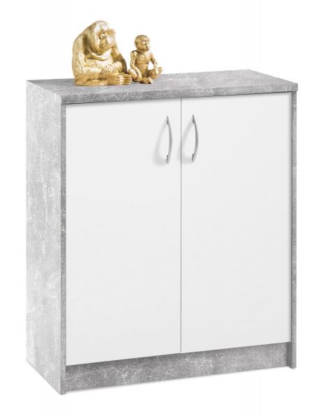 Die Kommode in Betondekor und weiß verfügt über zwei 3-fach höhenverstellbare Einlegeböden. Dies ermöglicht eine optimale Anpassung an die jeweiligen Bedürfnisse.