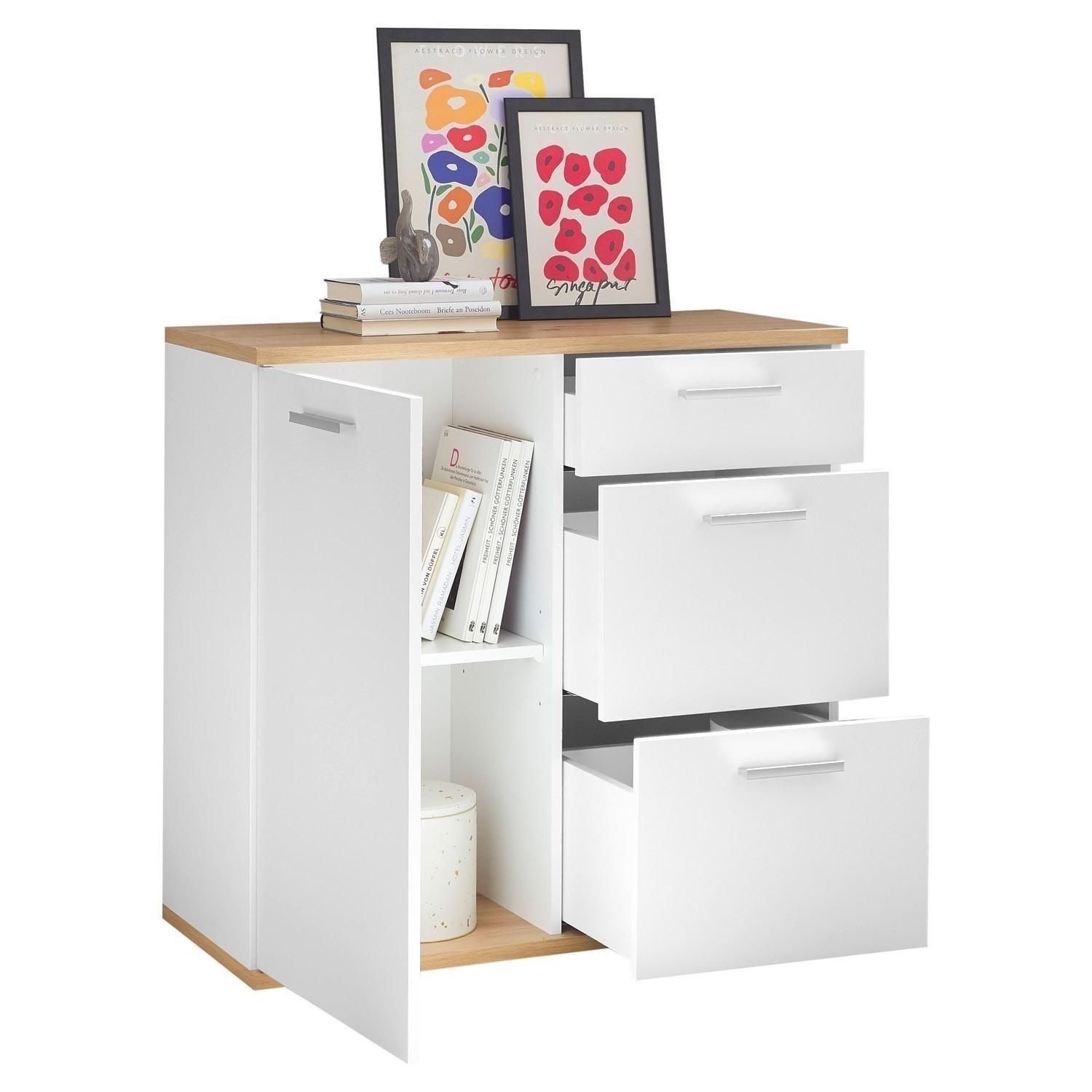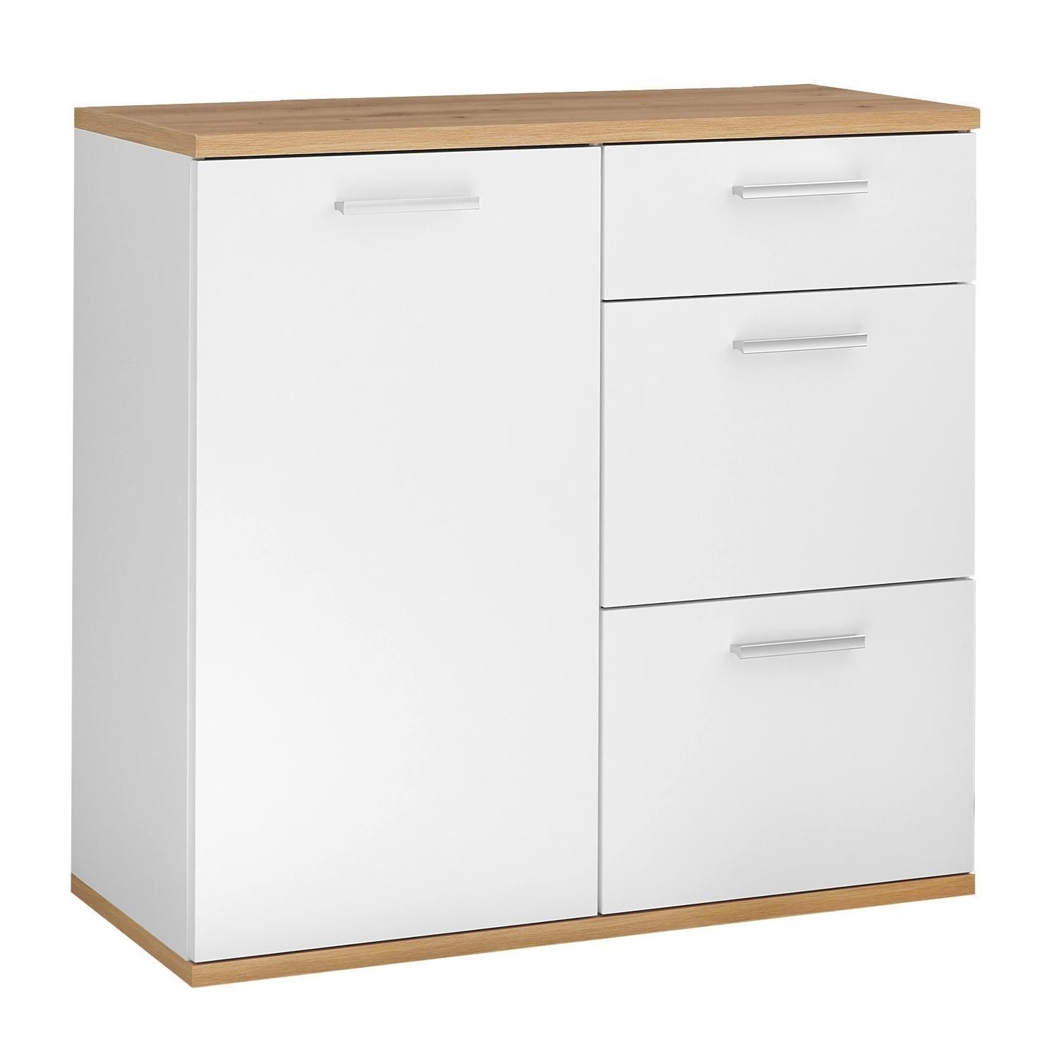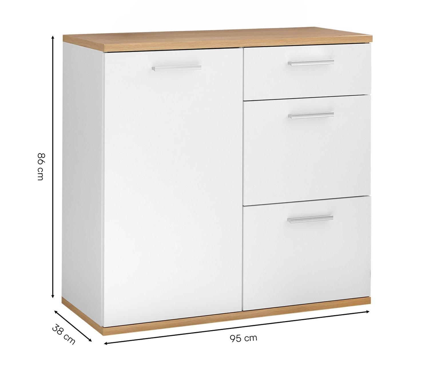 Die 95 cm breite Kommode präsentiert sich in zeitlosem Braun-Weiß mit 1 Tür, 1 höhenverstellbarem Einlegeboden und 3 Schubladen. Mit einer Höhe von 86 cm und einer Tiefe von 38 cm bietet sie nicht nur großzügigen Stauraum, sondern überzeugt auch durch ihr ansprechendes Design in Artisan Eiche Dekor und mattem Weiß. Die Kommode ist mit praktischen Extras wie Einlegeboden, Schubladen und Tür ausgestattet, um Ihren Wohnraum stilvoll zu ergänzen. Das Möbel steht auf 5 kurzen Stellfüßen, die unter der Bodenplatte montiert werden.