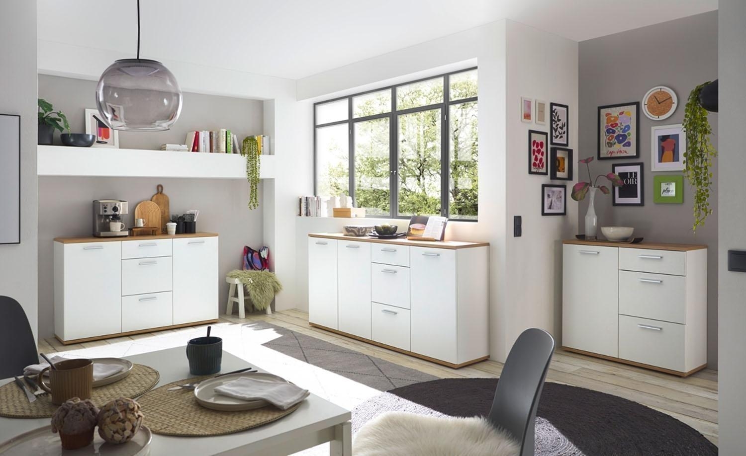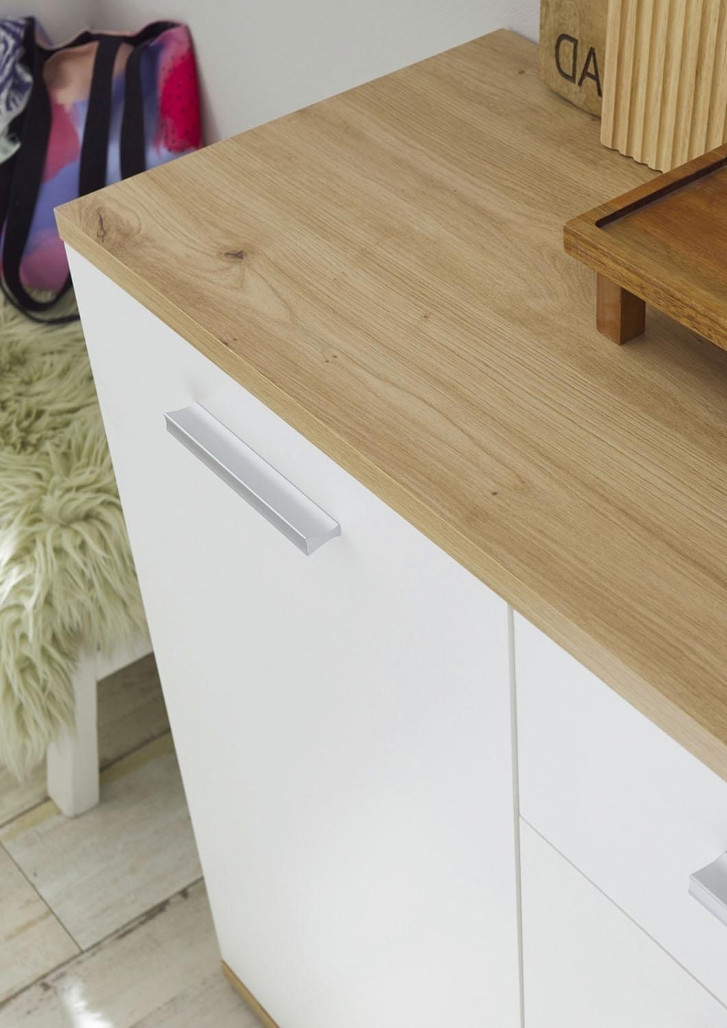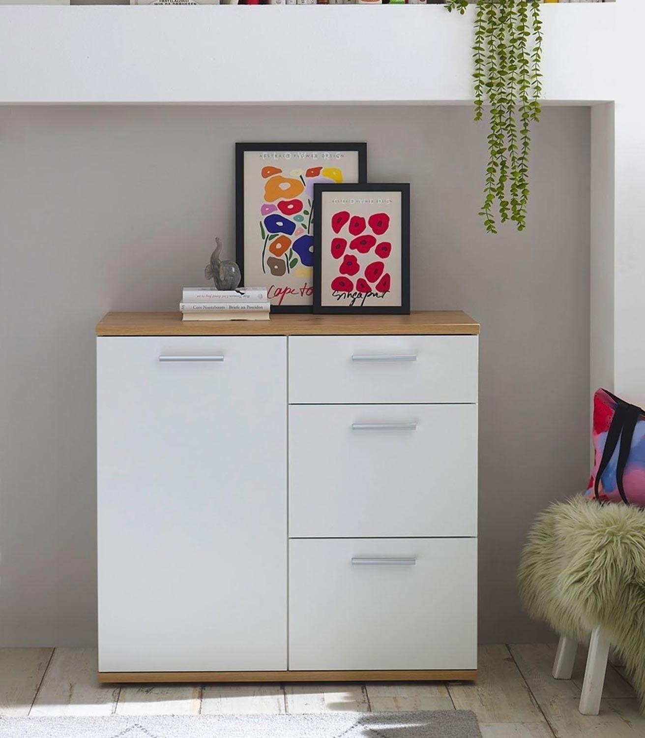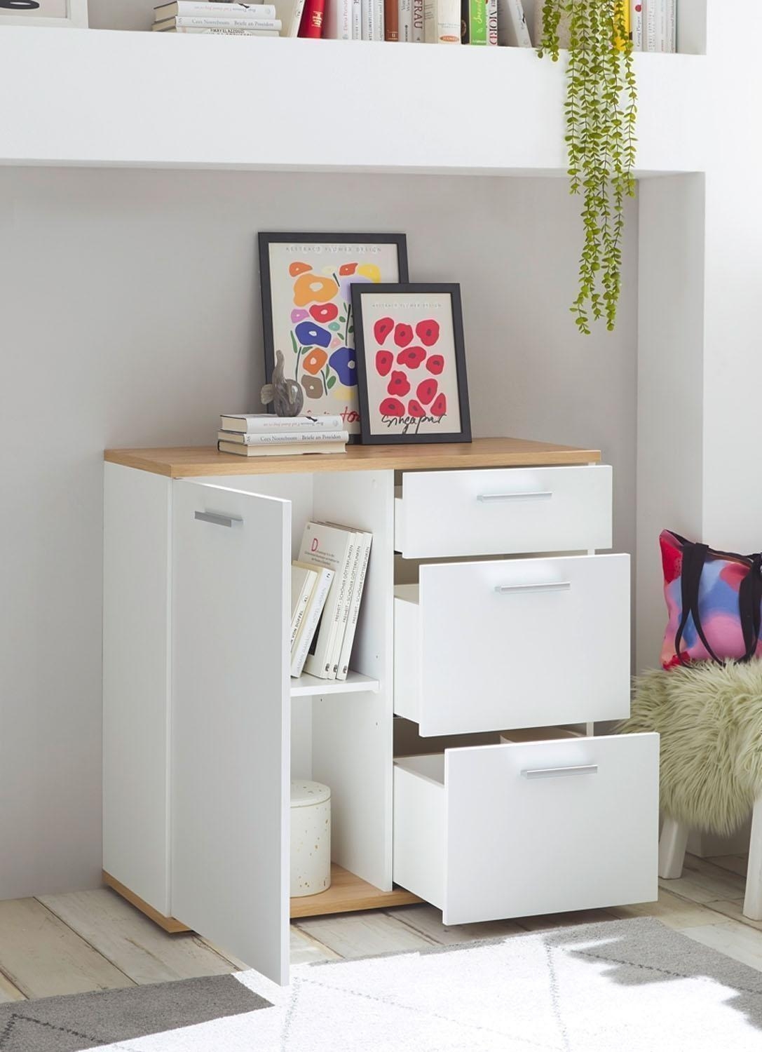 Die 95 cm breite Kommode präsentiert sich in zeitlosem Braun-Weiß mit 1 Tür, 1 höhenverstellbarem Einlegeboden und 3 Schubladen. Mit einer Höhe von 86 cm und einer Tiefe von 38 cm bietet sie nicht nur großzügigen Stauraum, sondern überzeugt auch durch ihr ansprechendes Design in Artisan Eiche Dekor und mattem Weiß. Die Kommode ist mit praktischen Extras wie Einlegeboden, Schubladen und Tür ausgestattet, um Ihren Wohnraum stilvoll zu ergänzen. Das Möbel steht auf 5 kurzen Stellfüßen, die unter der Bodenplatte montiert werden.