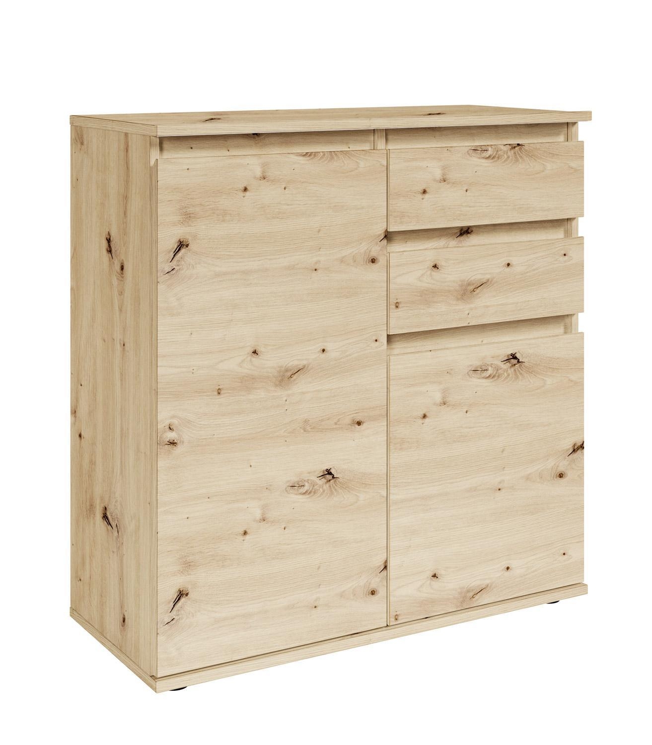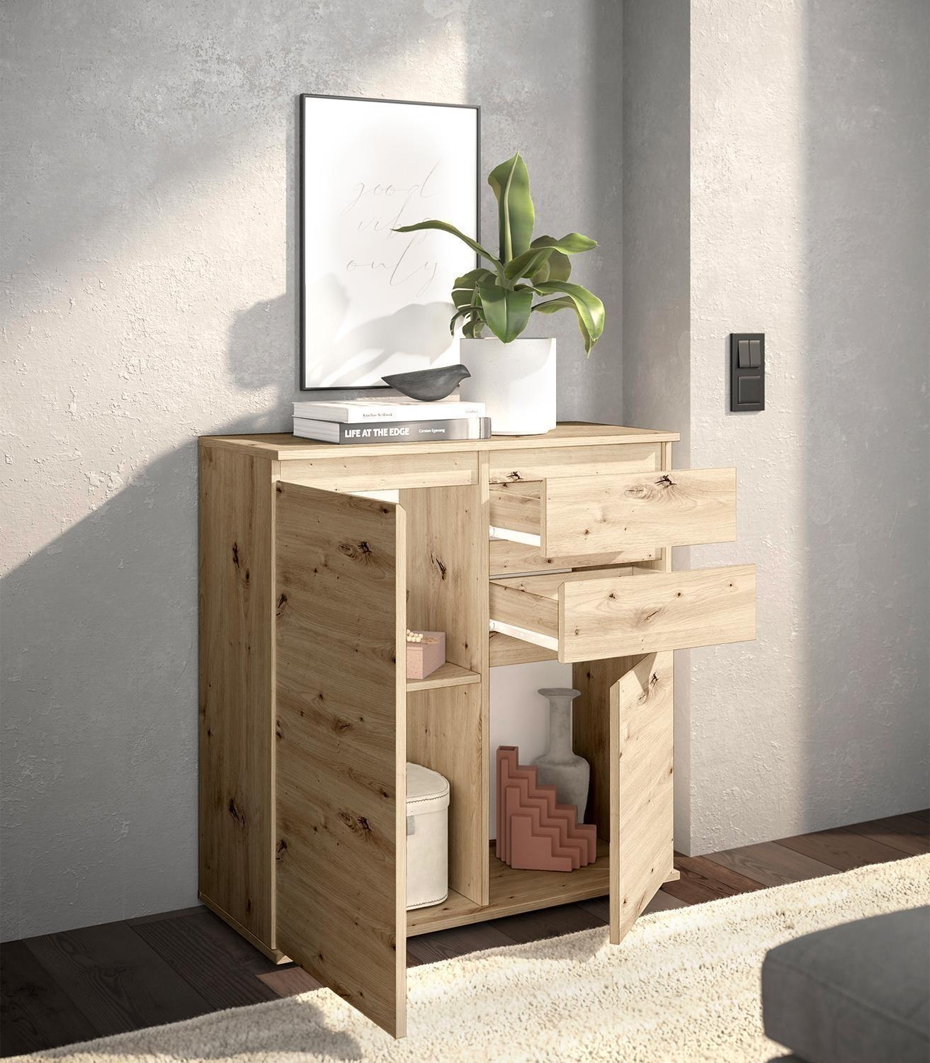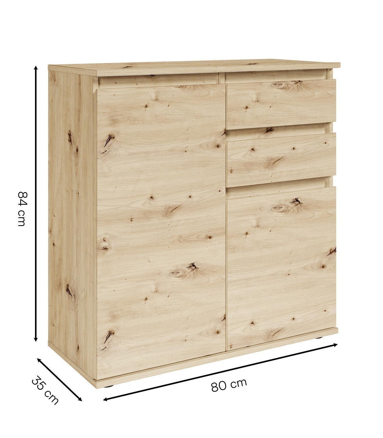 Die Kommode BERKO ist in Artisan Eiche Dekor ausgeführt und verfügt über ein griffloses Design. Sie ist mit zwei Schubladen und zwei Türen ausgestattet, hinter denen sich ein nicht höhenverstellbarer Einlegeboden befindet. Die Kommode hat eine Breite von 80 cm, eine Höhe von 84 cm und eine Tiefe von 35 cm.