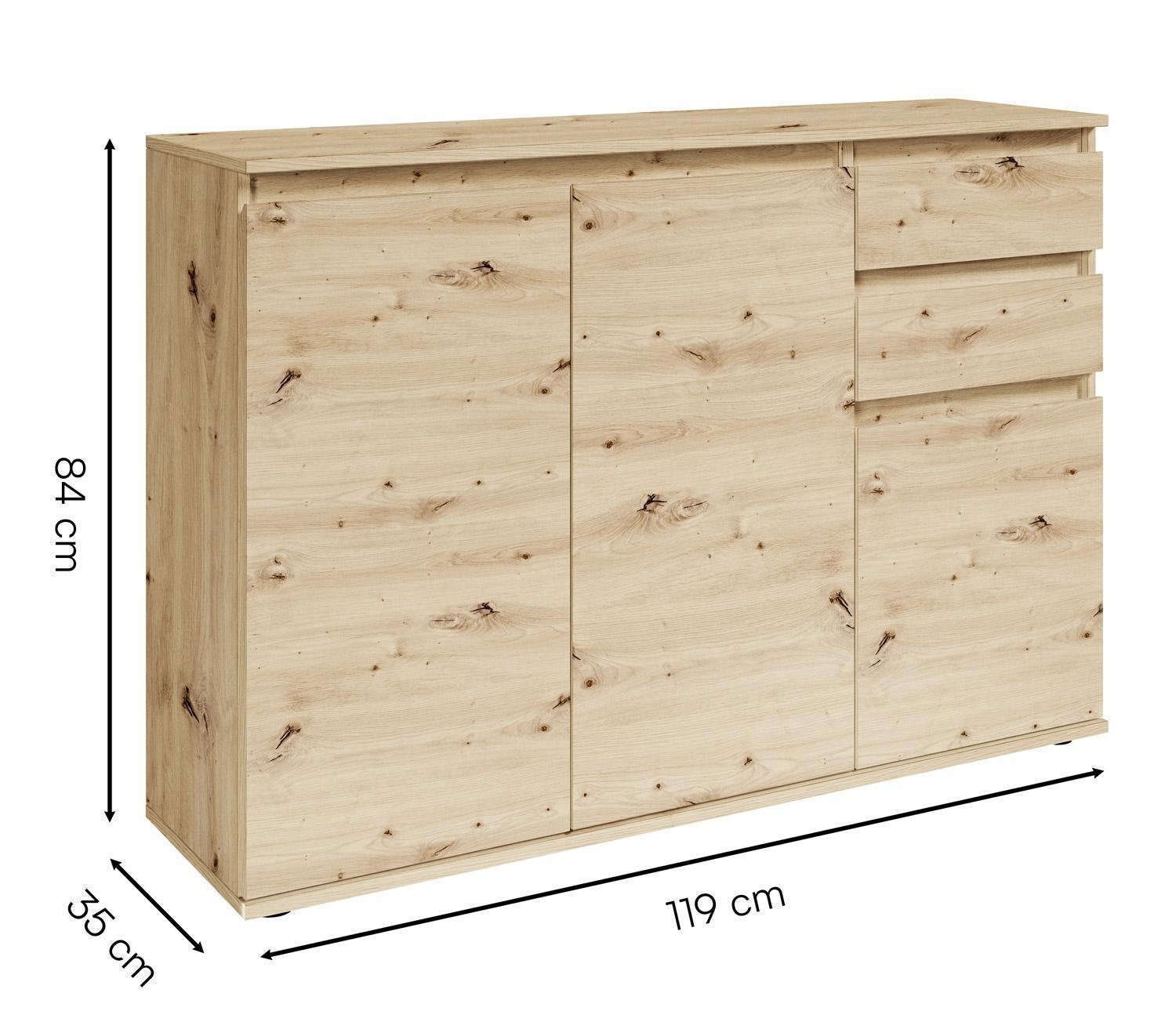 Die Kommode BERKO ist in Artisan Eiche Dekor ausgeführt und verfügt über ein griffloses Design. Sie ist mit zwei Schubladen und drei Türen ausgestattet, hinter denen sich ein nicht höhenverstellbarer Einlegeboden befindet. Die Kommode hat eine Breite von 119 cm, eine Höhe von 84 cm und eine Tiefe von 35 cm.