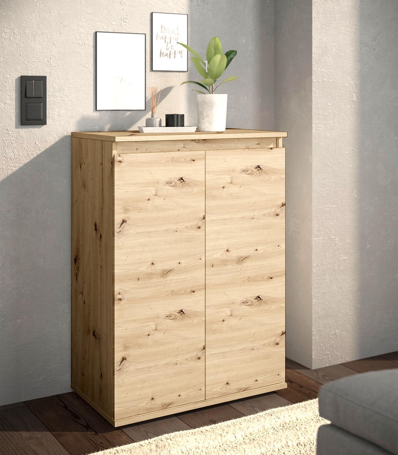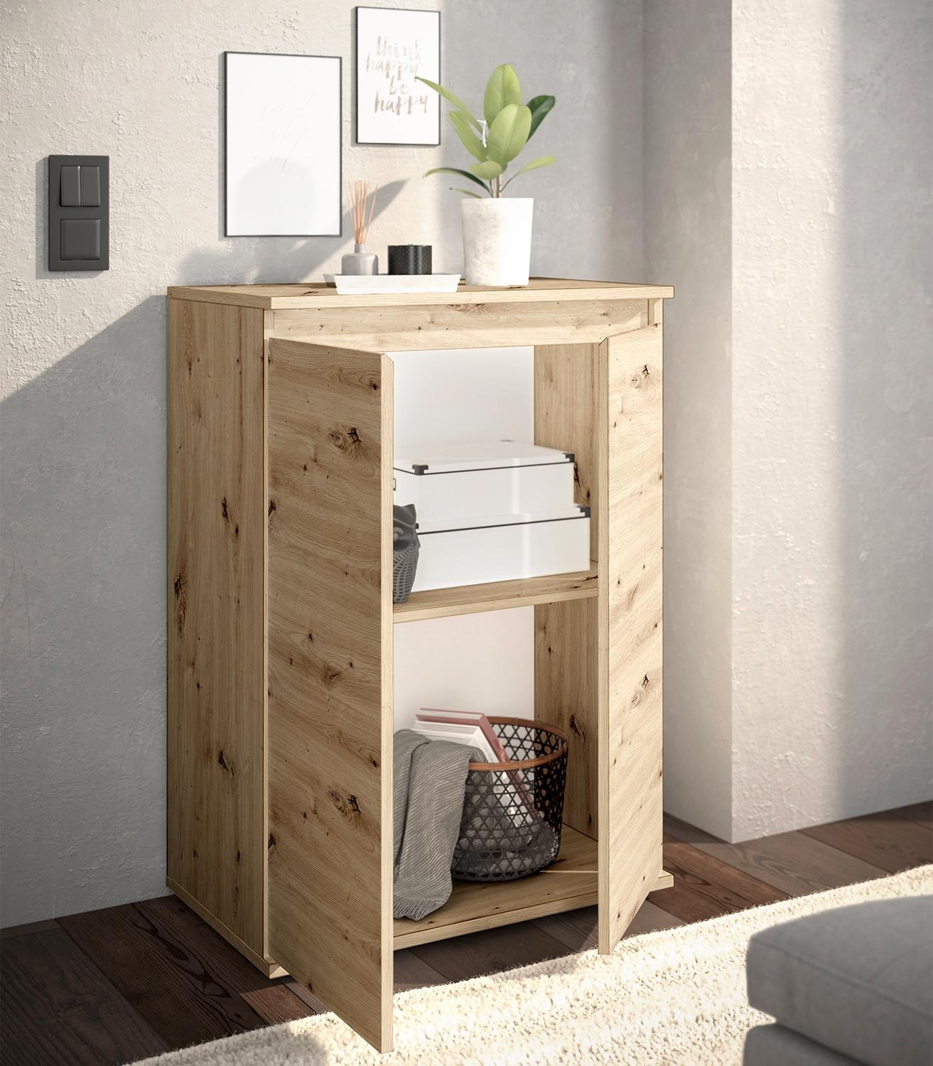 Die Kommode BERKO ist in Artisan Eiche Dekor ausgeführt und verfügt über ein griffloses Design. Sie ist mit zwei Türen ausgestattet, hinter denen sich ein nicht höhenverstellbarer Einlegeboden befindet. Die Kommode hat eine Breite von 60 cm, eine Höhe von 84 cm und eine Tiefe von 35 cm.