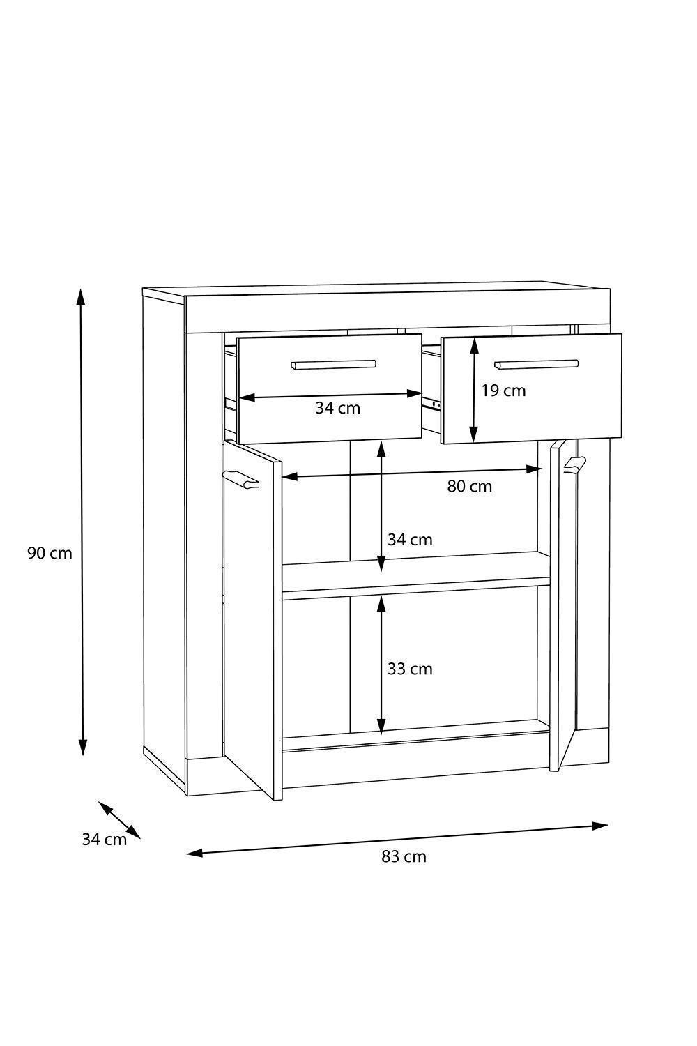 | Lieferumfang: | 1 Kommode mit 2 Türen, 2 Schubladen und 1 mehrfach höhenverstellbarem Einlegeboden |
